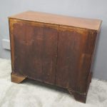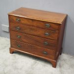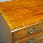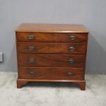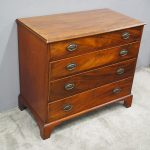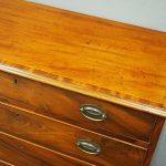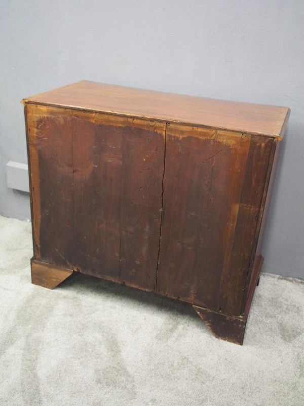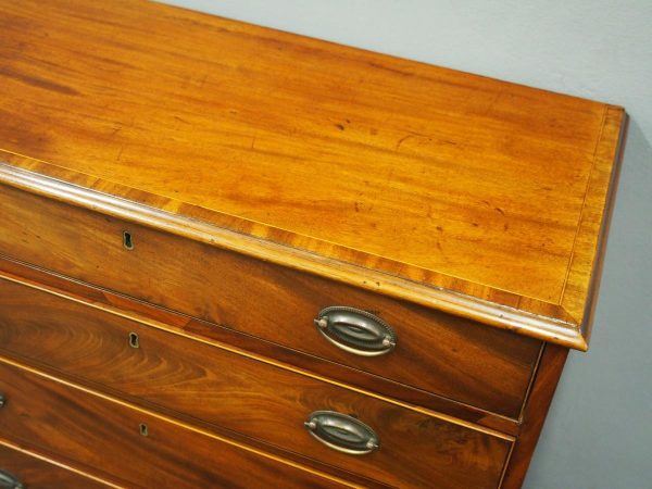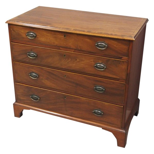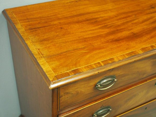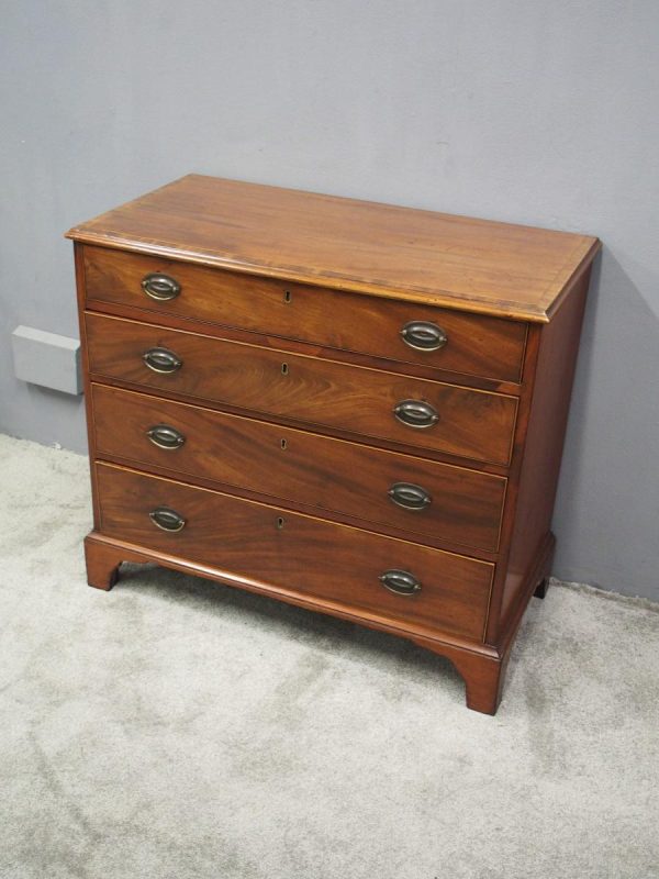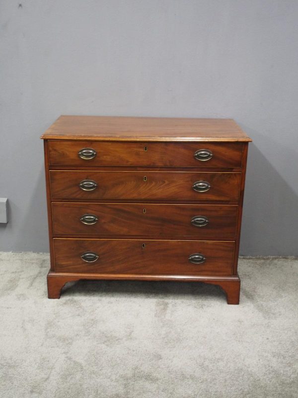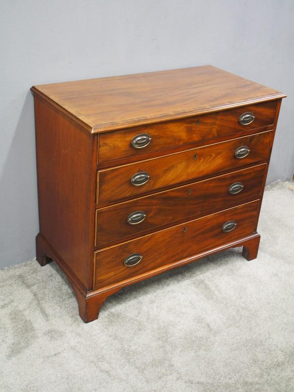 Circa 1790, neat-sized George III inlaid mahogany chest of drawers. The rectangular top in figured Spanish mahogany with boxwood stringing, cross banding and moulded foredges over 4 graduated drawers with oak liners, ebony and satinwood edging and oval stamped brass handles (19th century replacements). All standing on a moulded base over shaped bracket feet.