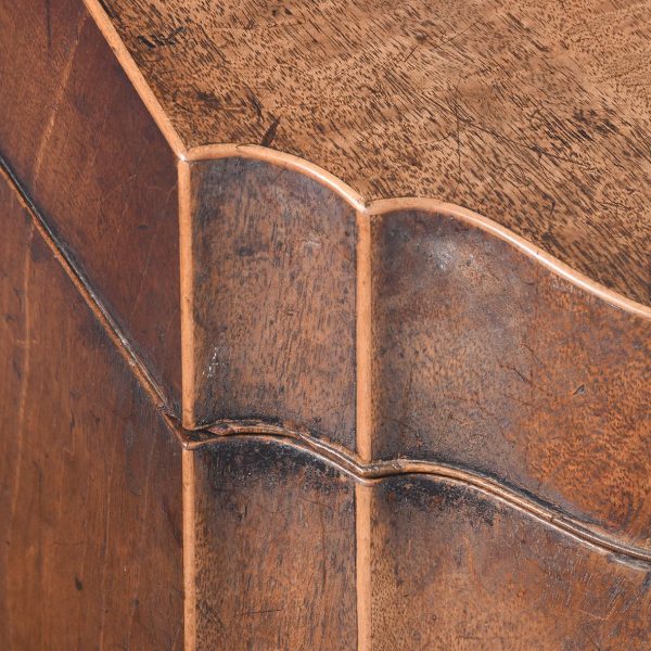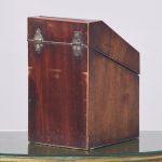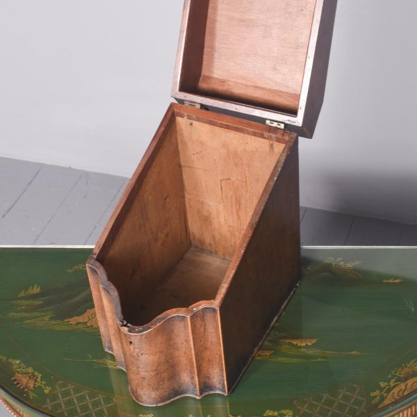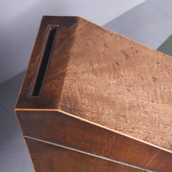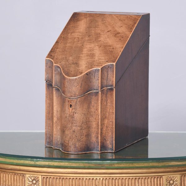 Circa 1780. A George III mahogany and inlaid shaped knife box, converted to a letterbox in Victorian times. The flat section of the top with an elongated aperture for posting letters, the sloping section with a shaped front framed in boxwood, with a deep frieze and beading beneath. The top is hinged and opens top reveal an uninterrupted interior, to the front is a small diamond shaped escutcheon, the front of the knife box follows the form of the top, with string inlay on all of the uprights and on the serpentine sections on the front.