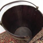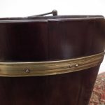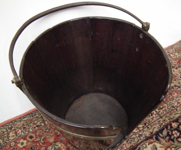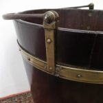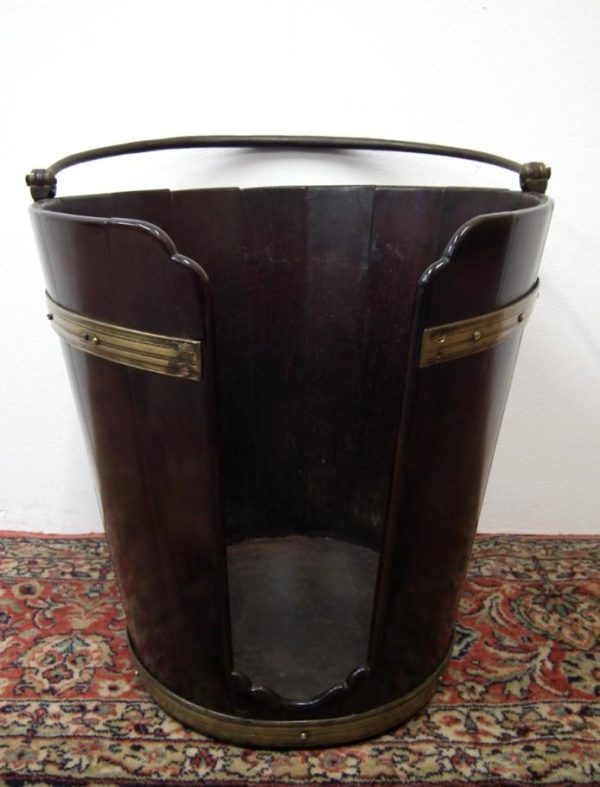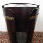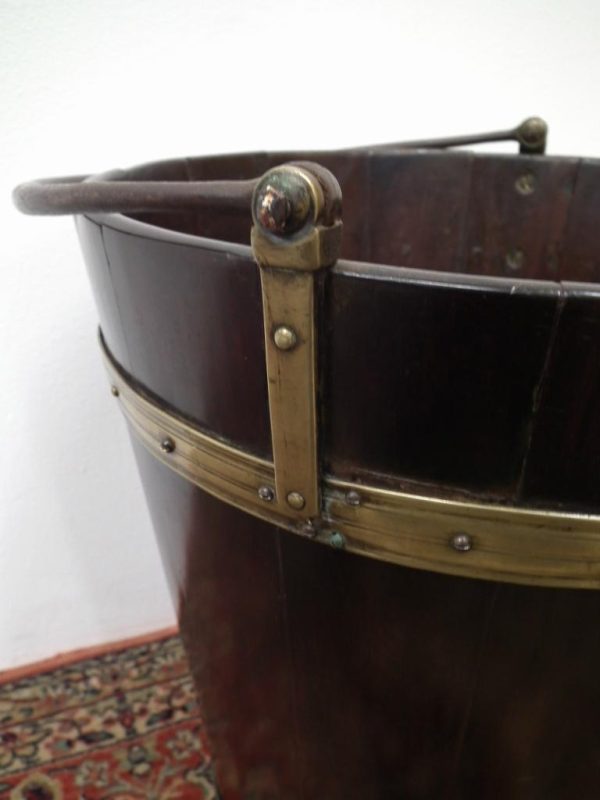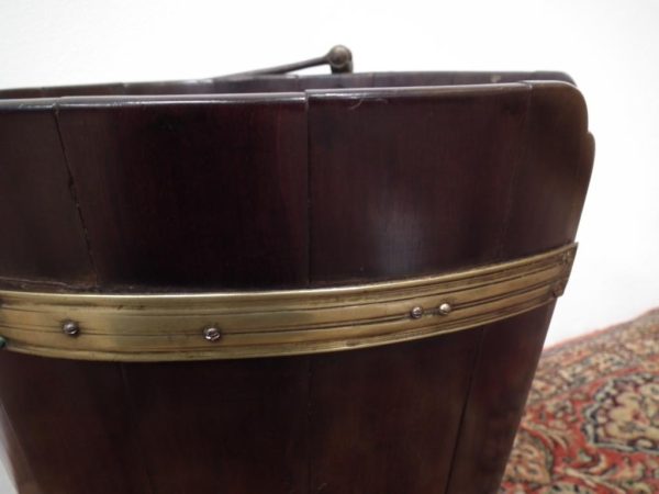 Circa 1775, George III mahogany, brass and steel plate bucket. The bucket has a tapering form and staved mahogany slats, and has an unusual steel lifting handle. Below this are two uprights which support the handle and a wrap around brass bezel which is ribbed. There is an open section with a stylish form in the middle for inserting and removing the plates. The bucket has excellent colour and is in good condition.