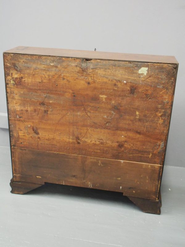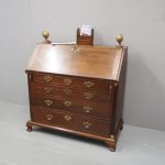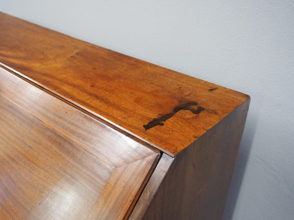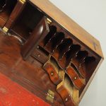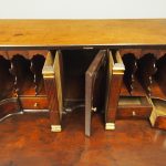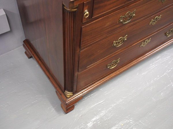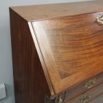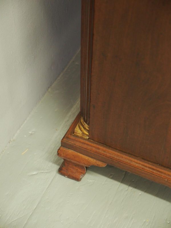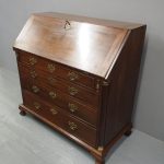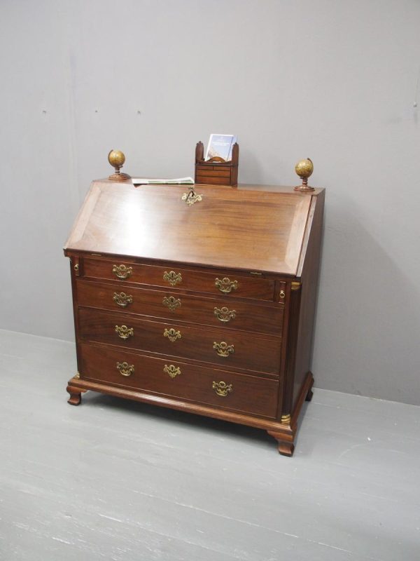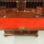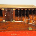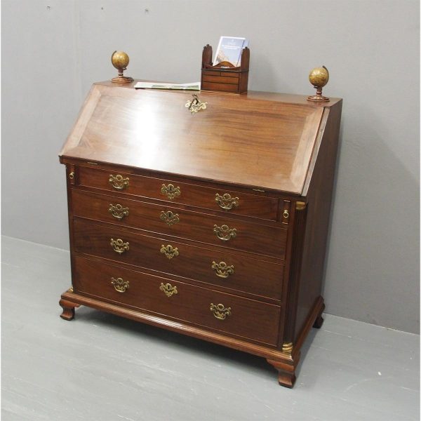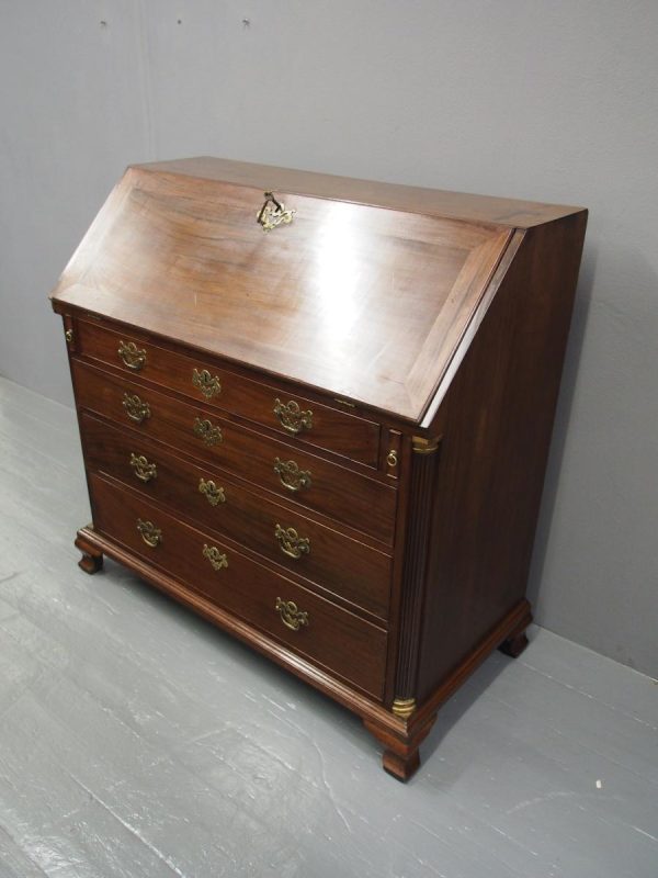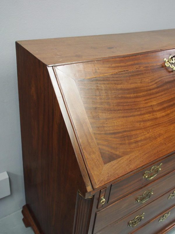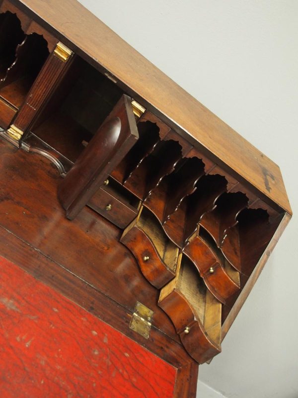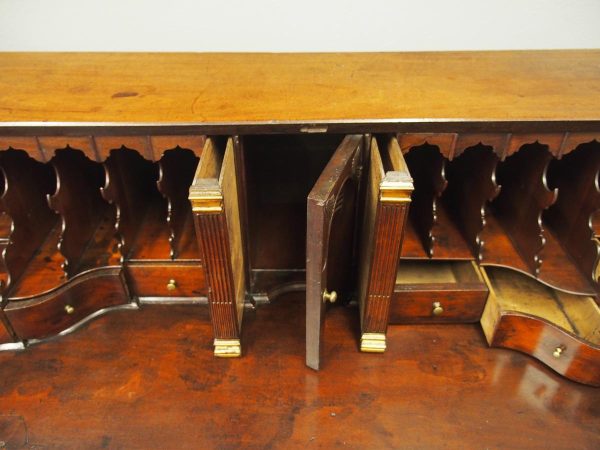 Circa 1770, George III bureau in Spanish mahogany. The cross headed flap with fretted brass escutcheon has its original lock and keys. It opens to reveal a red leather writing surface and outstanding fitted interior with: shaped drawers, book slides, neoclassical pillars hiding secret compartments and cupboard with shell carved door. Beneath are 4 graduated, oak-lined, cock-beaded drawers with fretted brass handles and escutcheons flanked by quarter columns with gilded capitals and bases. This is all over a moulded base with ogee bracket feet.