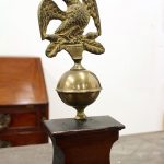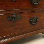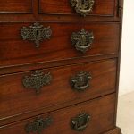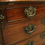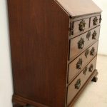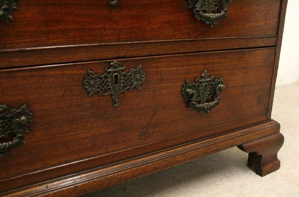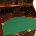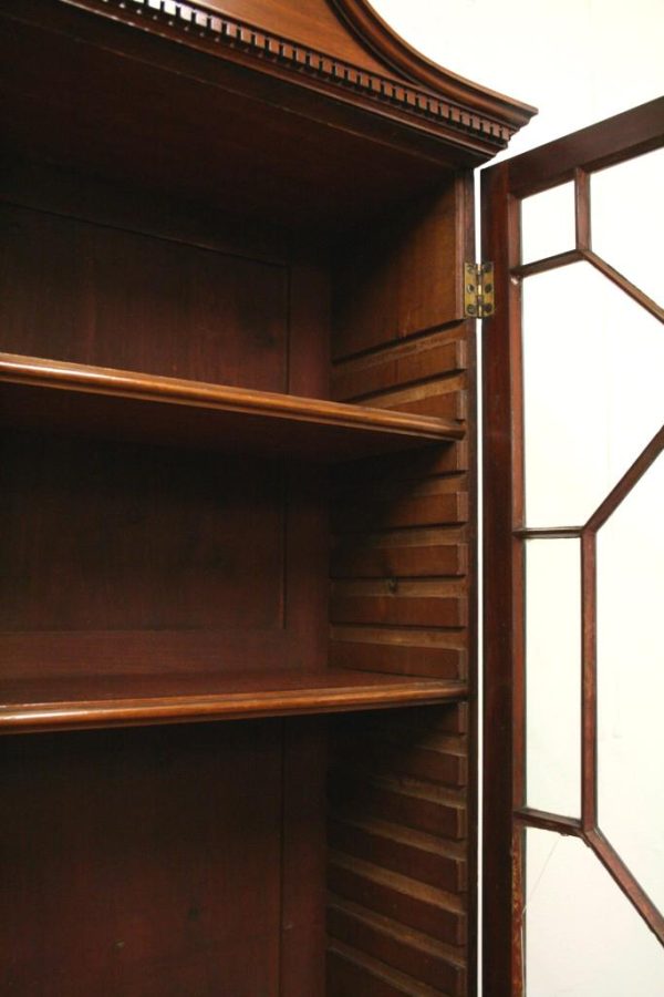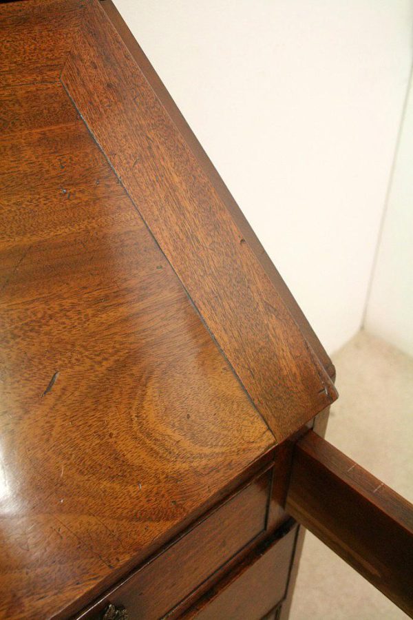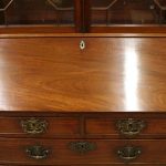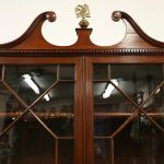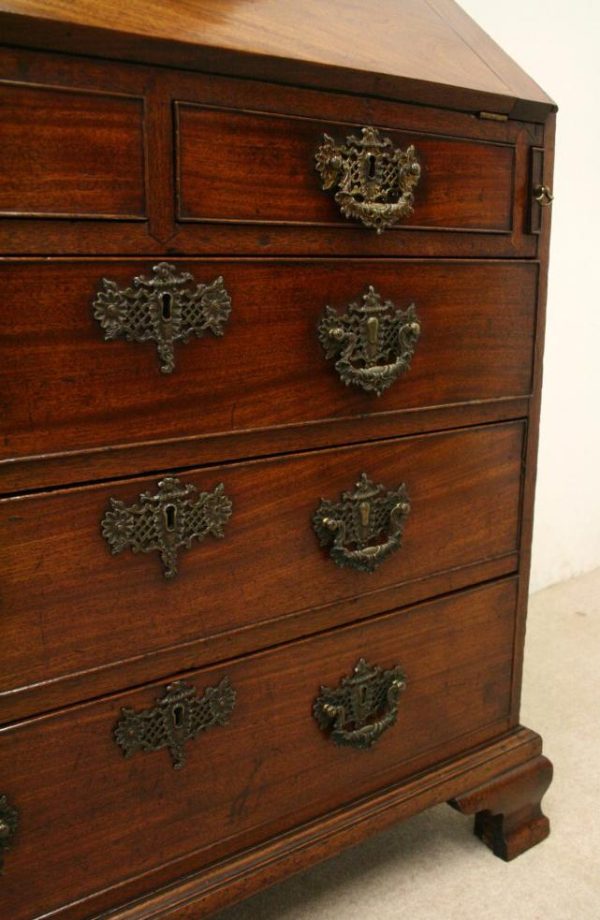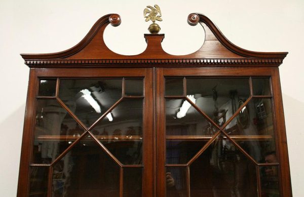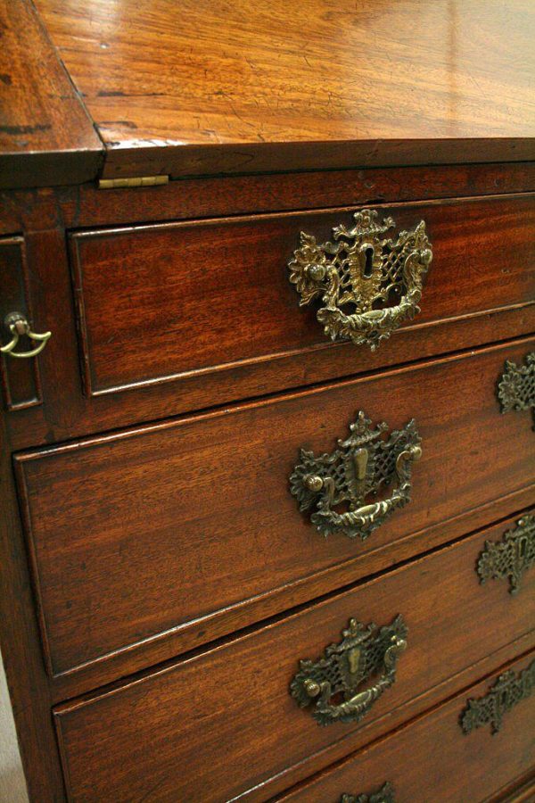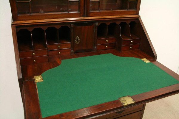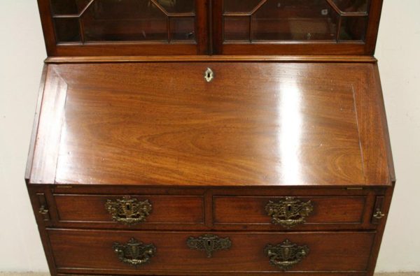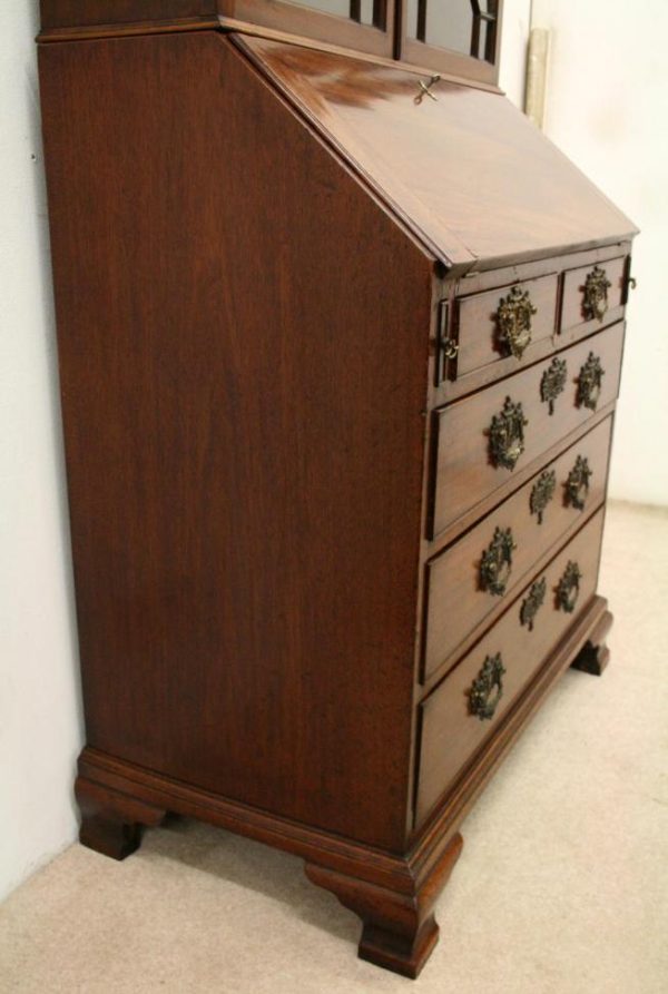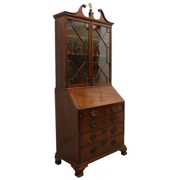 Circa 1770, George III mahogany bureau bookcase (marriage). The top has a swan-neck pediment with a raised centre section, with a cast brass finial of a mythical HoHo bird with a foliate base on a brass sphere, over a dentil frieze. Beneath this are two classical astragal doors enclosing a pair of adjustable shelves. The base has a fall front with a stylish brass escutcheon, and opens to reveal a nicely fitted interior with a green felt writing surface, various drawers and pigeon holes. There are two short over three long graduated drawers with wonderful Chippendale style cast brass handles and escutcheons. All the drawers have cock beadings and all stands on elegant ogee bracket feet. Good colour and patination.