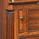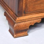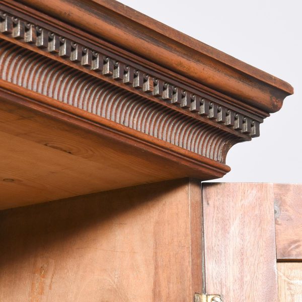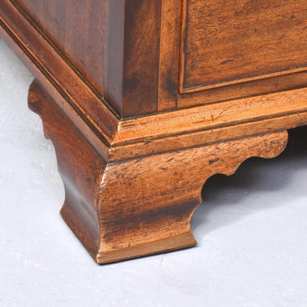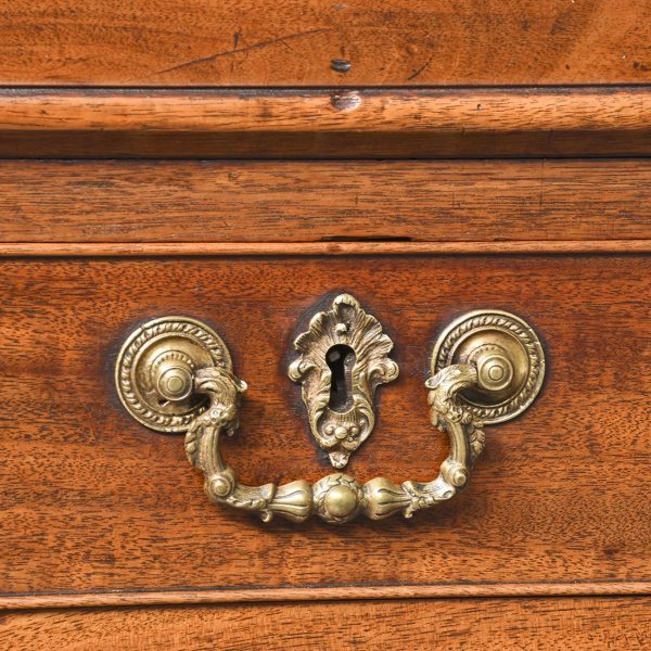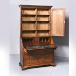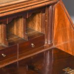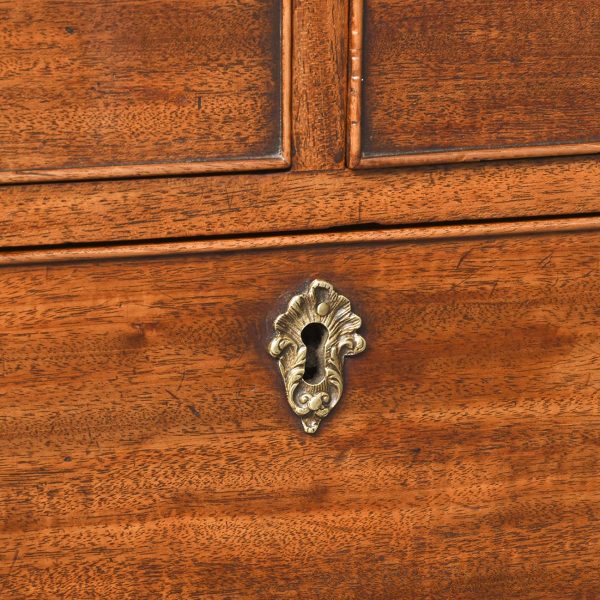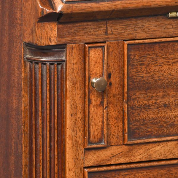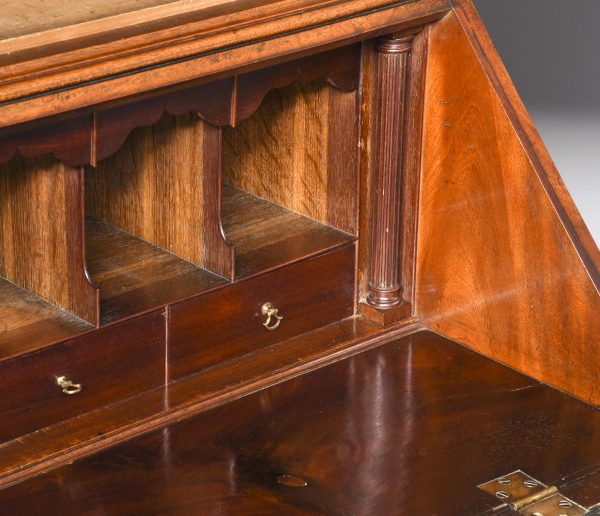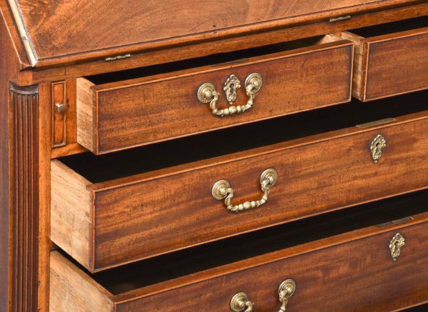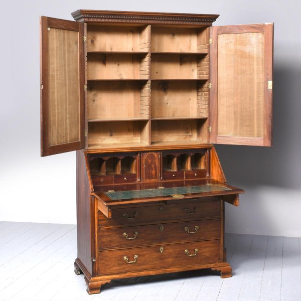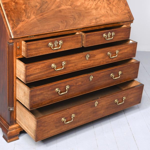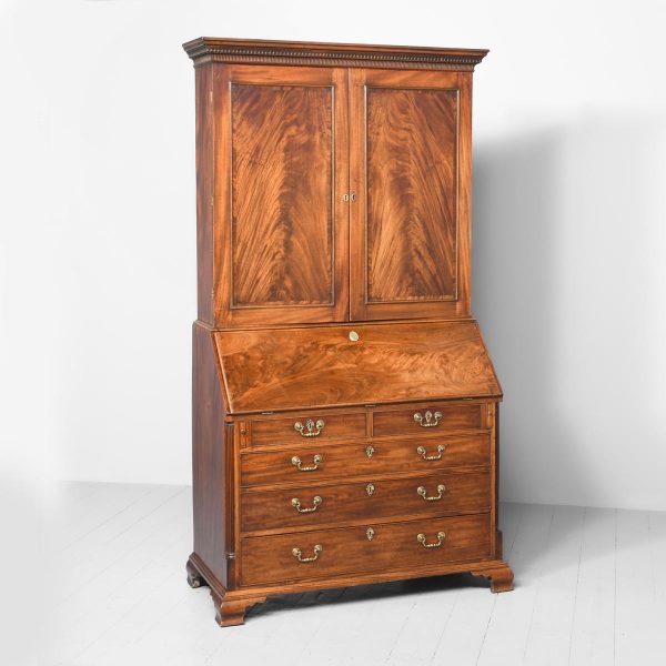 Circa 1770. George III mahogany bureau bookcase in totally original condition. Surmounted by a moulded dentil and fluted cornice, the bookcase section with two cross-banded doors and original brass escutcheons opening to a two-section bookcase, each with three adjustable shelves. The bureau with canted corners and neo-classical fluted pillars and a flap in fine Spanish mahogany with original escutcheon and steel lock. The interior with four secret compartments with Corinthian pillar facings, shaped frieze drawers, pigeonholes and drawers and a gilt tooled hide writing surface. With two short and three long drawers with original cast brass handles, steel locks and quarter cut oak liners all over a moulded base and ogee bracket feet.