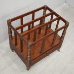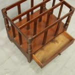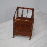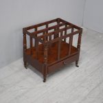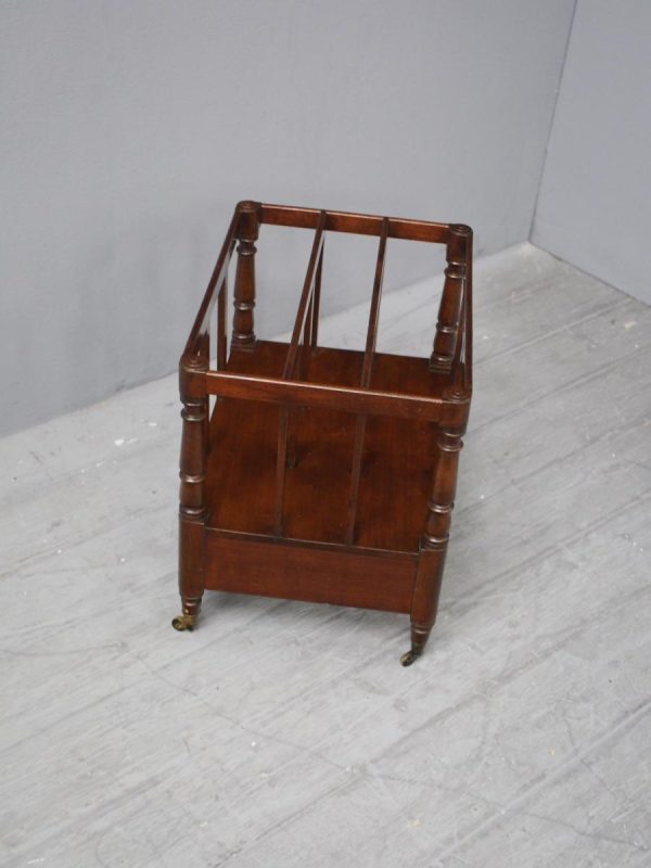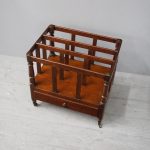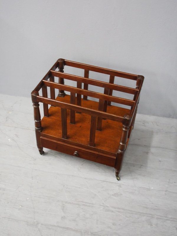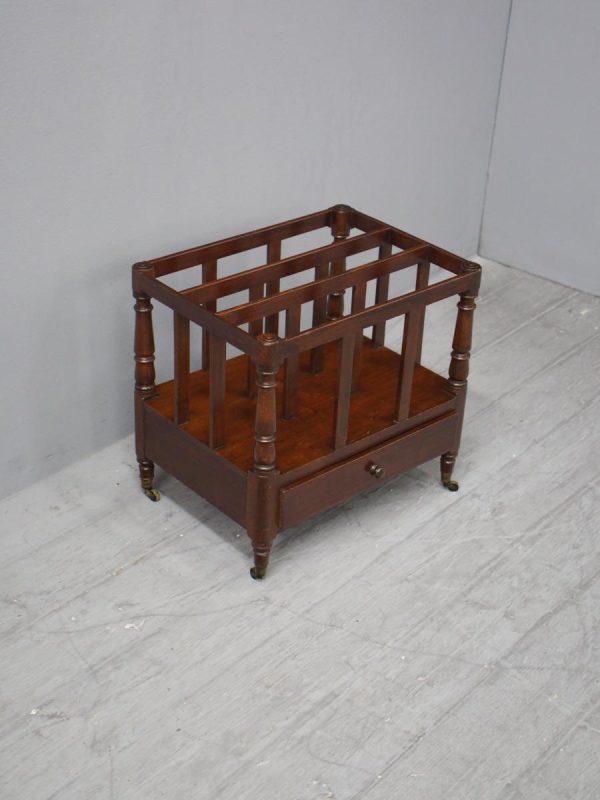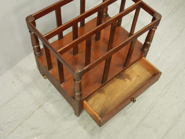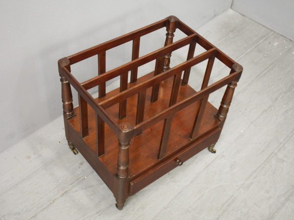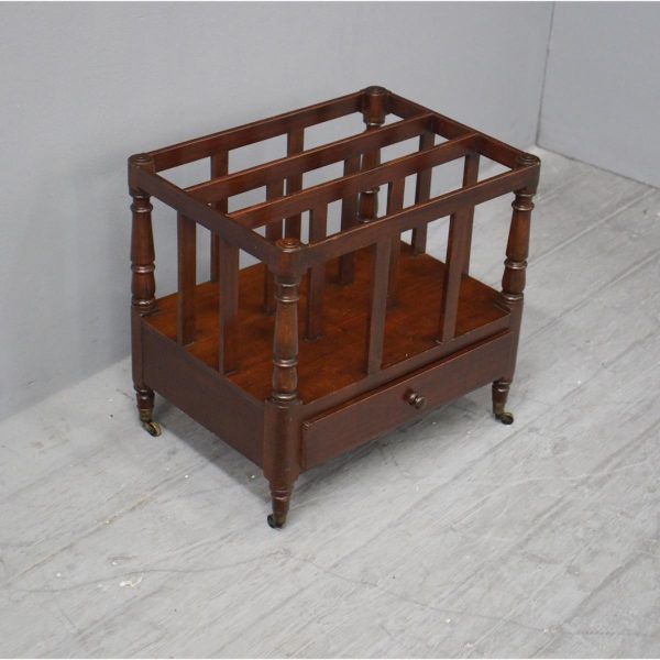 Circa 1800, George III mahogany canterbury. With ring turned supports and the corners capped by roundels, the three section canterbury has vertical slat divisions. This is above a cedar-lined, full-length drawer with a finely turned knob and is supported on neat turned feet with original brass caps and castors.