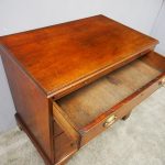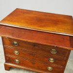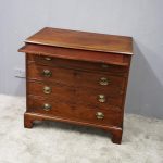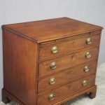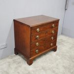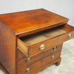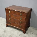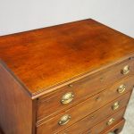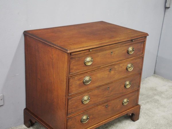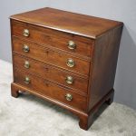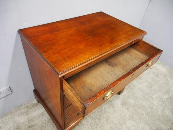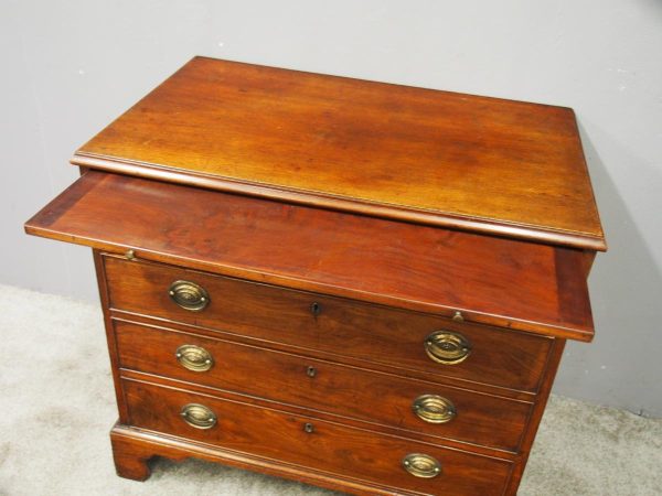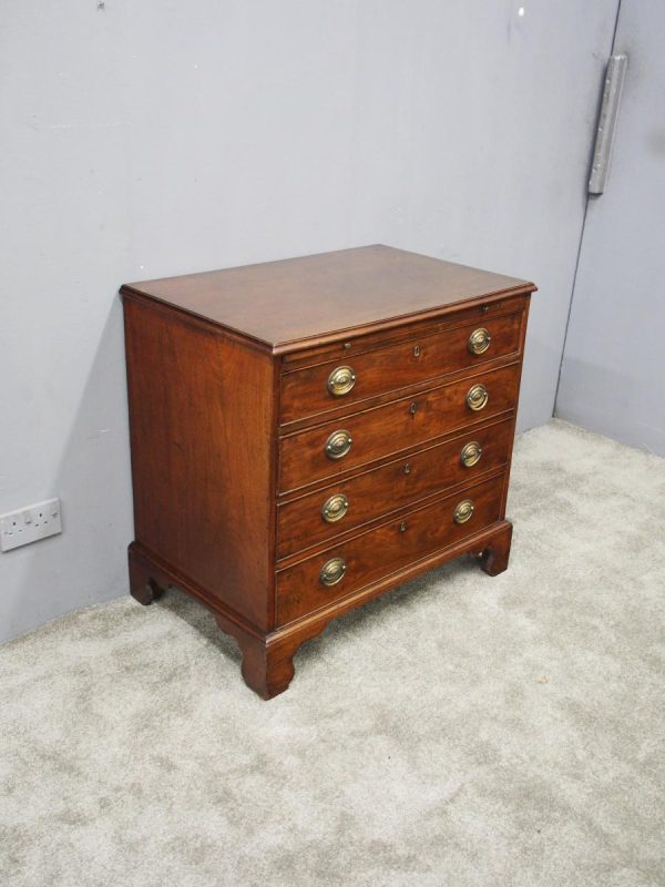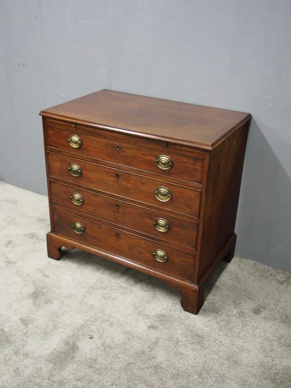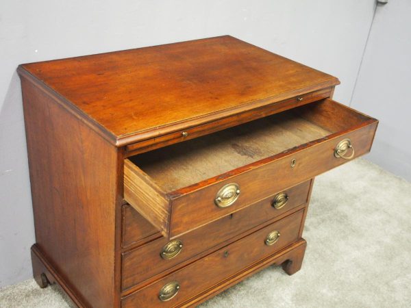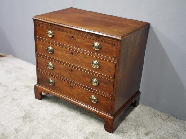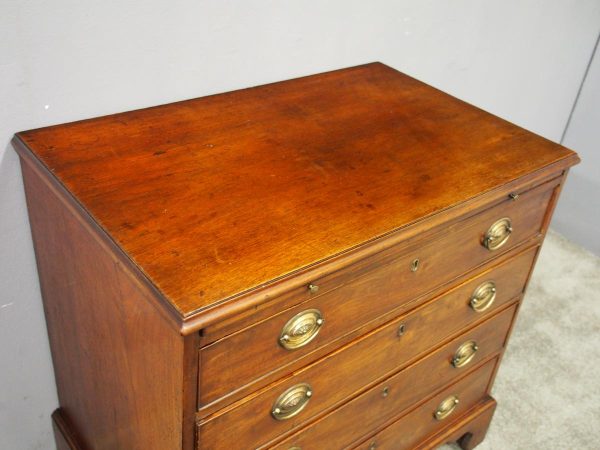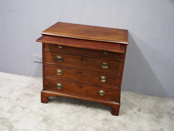 Circa 1780, neat sized George III mahogany chest of drawers. The rectangular top has a thumb moulded fore edge over a mahogany brushing slide with brass pulls. There are 4 graduated cock beaded, oak lined drawers with embossed oval brass handles (these are old replacements of approx. 100 years old). It is all sitting on a moulded base and its original shaped bracket feet.