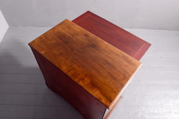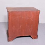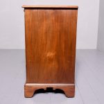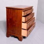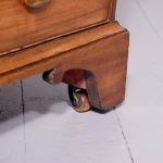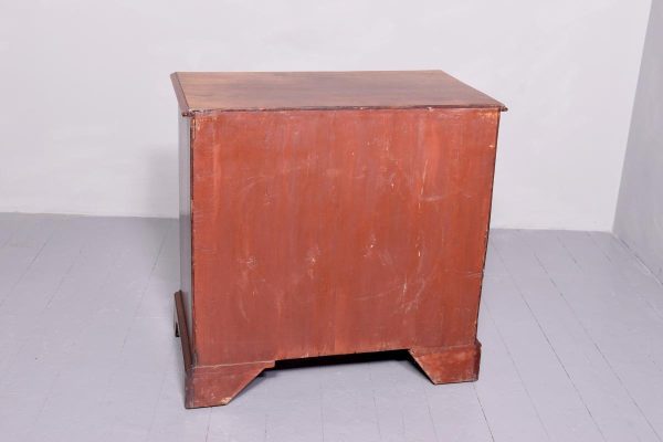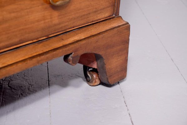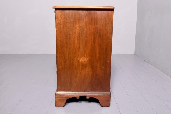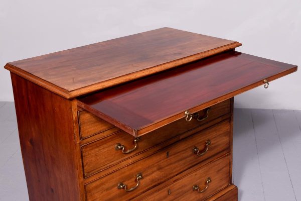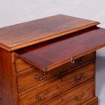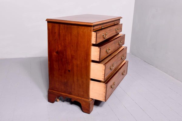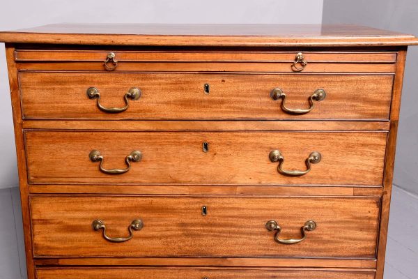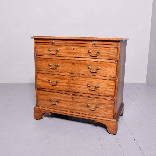 Circa 1770. A neat size George III mahogany chest of drawers, the top with fine figured mahogany with moulded fore-edge with a brushing slide beneath, with beaded fore edge and a pair of cast brass and gilded axe head drops, below a bank of four full length graduating drawers, each with original brass escutcheons, cast brass swan neck handles with elegant back plate and pommels, with a simple moulding beneath all resting on four elegant bracket feet with a small scroll on the inside