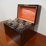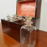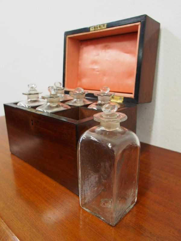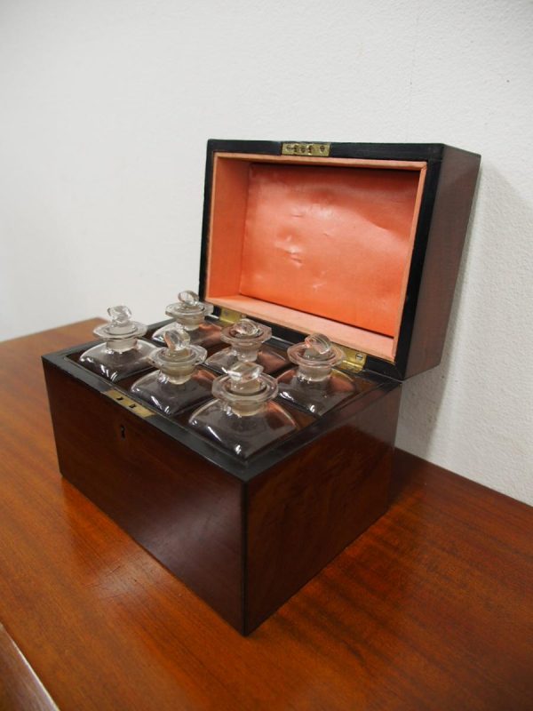 Circa 1800, late George III mahogany decanter box. It has a swan neck lifting handle, various pomels and back plates, and original hinges. Inside are 6 divisions with the 6 original bottles (some have chips to the necks) and stoppers, and the walls and lid are lined in fabric. It has a diamond shaped escutcheon and ebony inlay to the fore edges of the lid and sides of the box.
