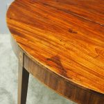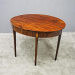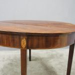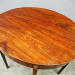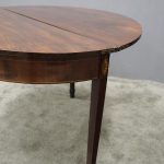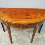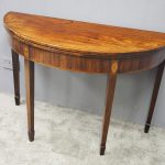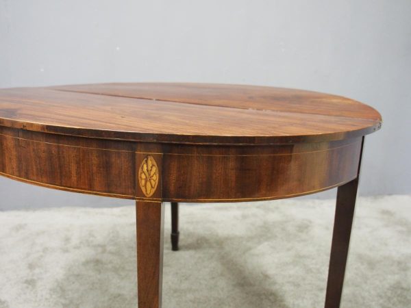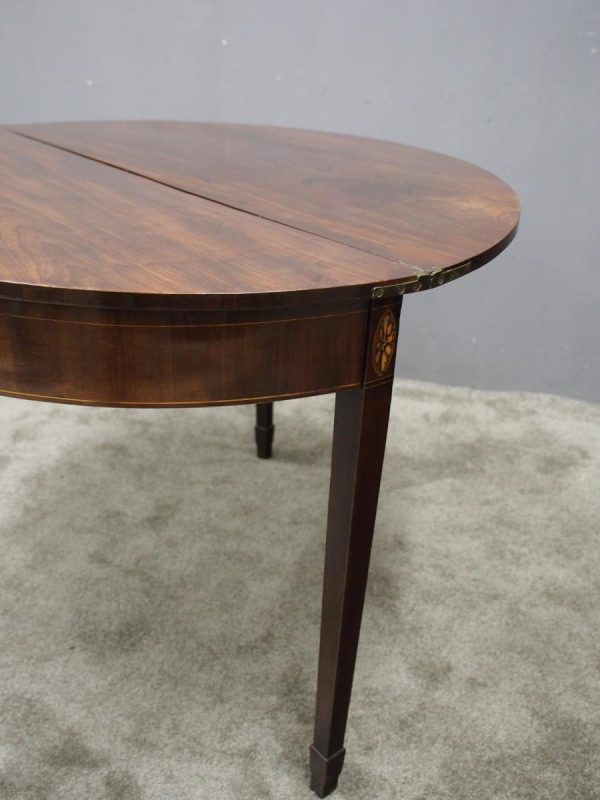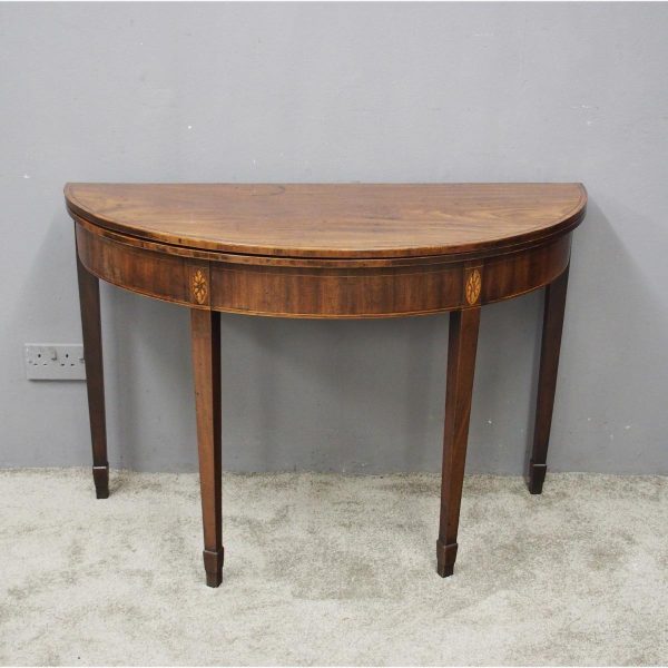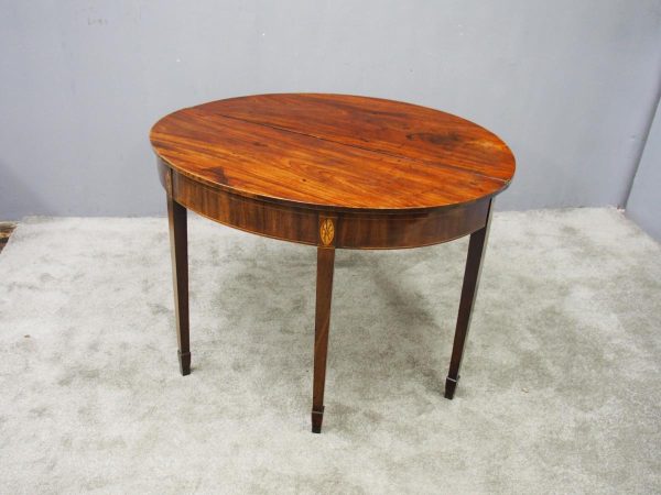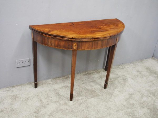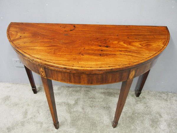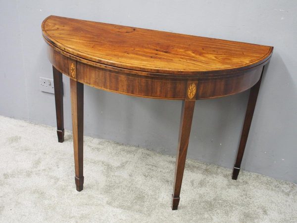 Circa 1790, generous sized George III demilune inlaid mahogany fold over tea table. The demi-lune top has boxwood and rosewood banding and opens to a polished interior of similar high quality. There is a cross banded and inlaid frieze, and it all stands on tapering supports with shell carved capitals and spade toes. The rear legs have a gate-leg action for assembly.