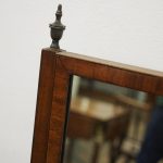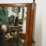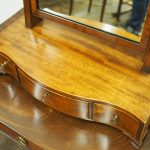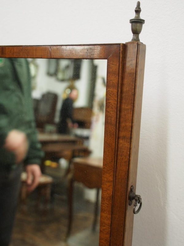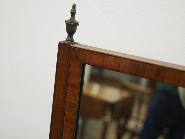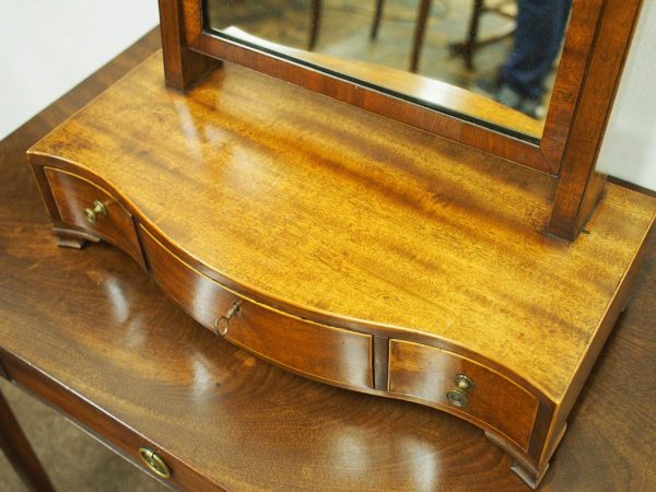 Circa 1800, George III mahogany dressing mirror. The rectangular mirror plate is in good condition within a crossbanded frame, on tapering supports with brass finials. The serpentine base is in figured mahogany with three frieze drawers and is all sitting on ogee bracket feet.