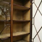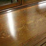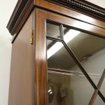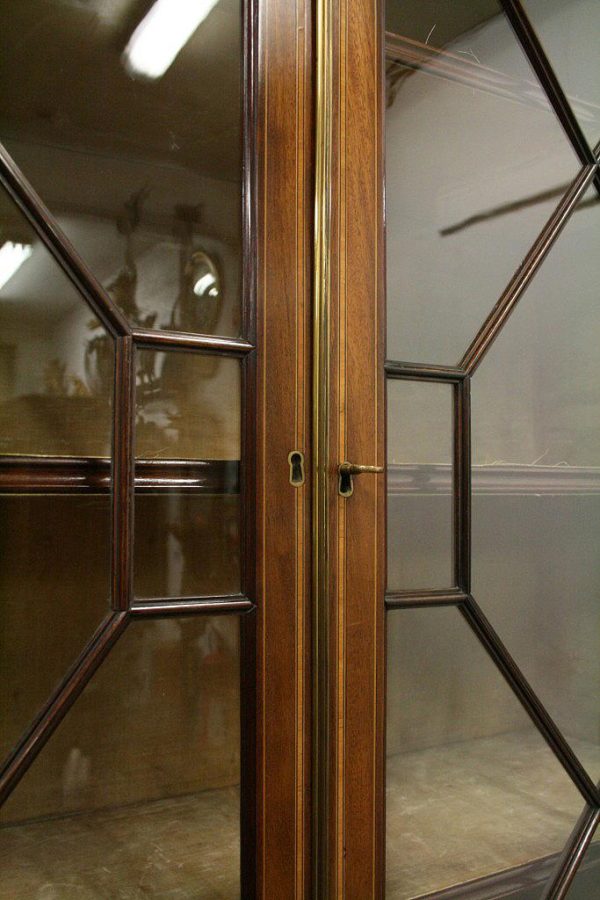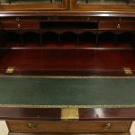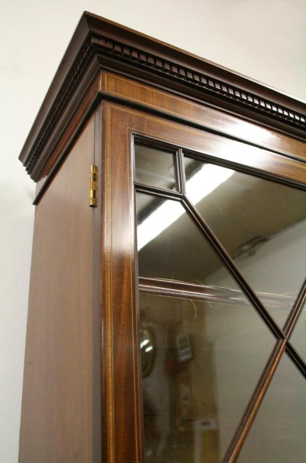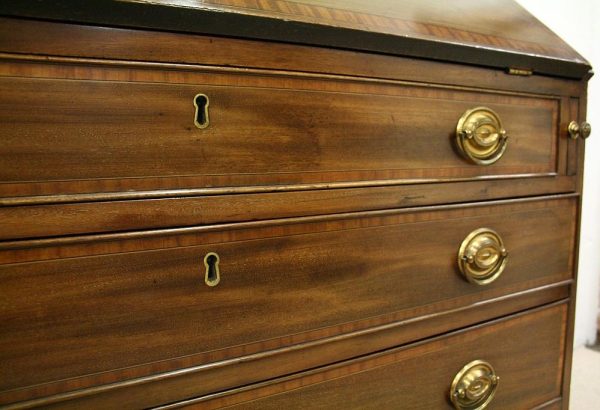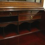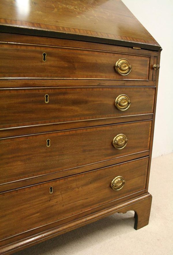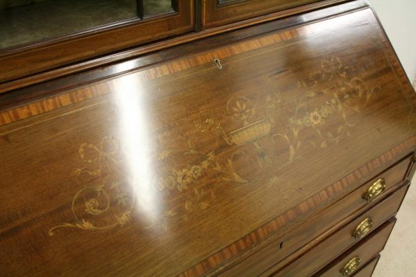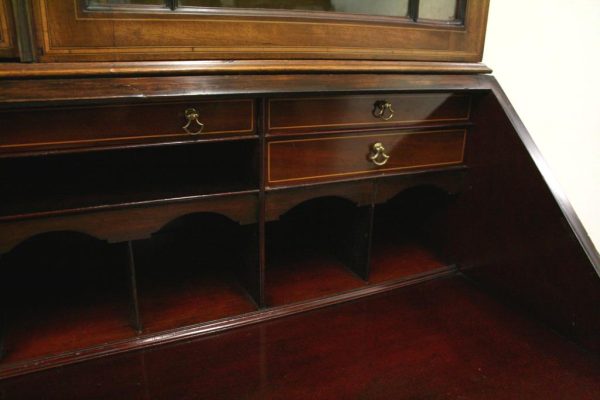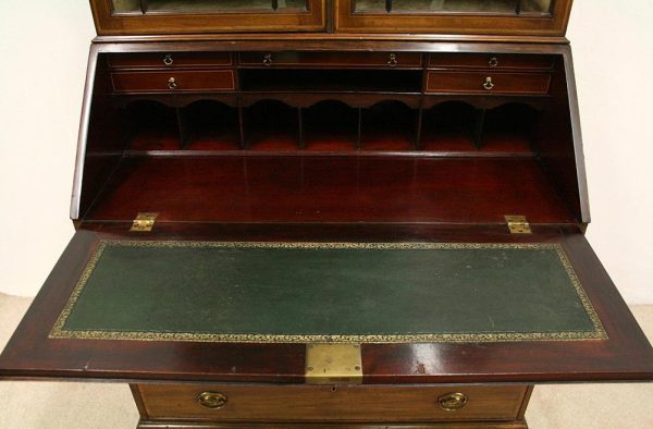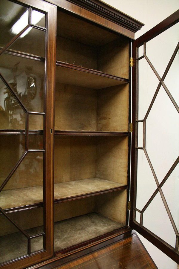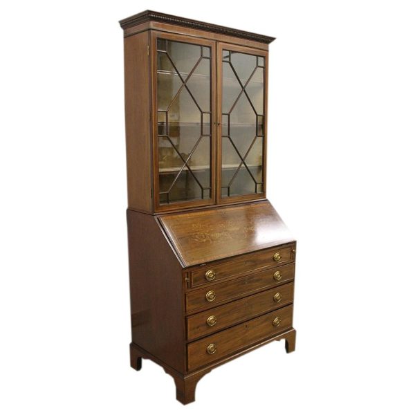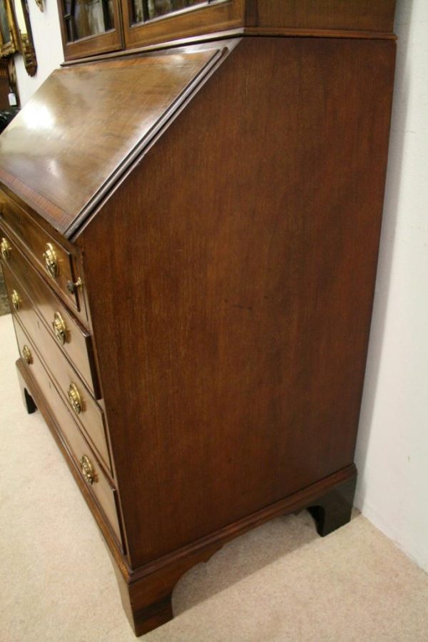 Circa 1780, George III mahogany inlaid bureau bookcase, the dentil moulded cornice above astragal glazed doors enclosing shelves, over the fall flap enclosing a fitted interior and four graduated long drawers, raised on bracket feet.