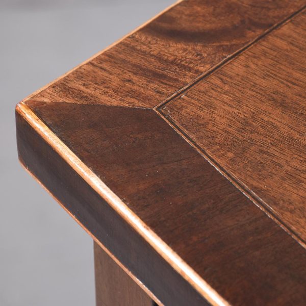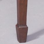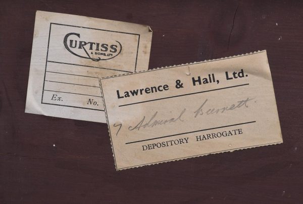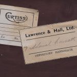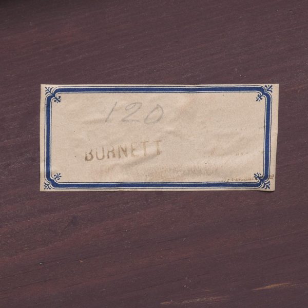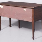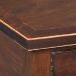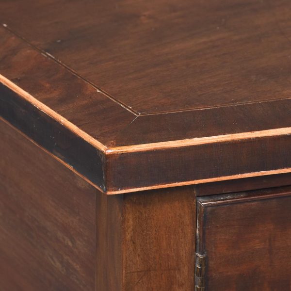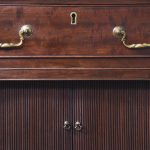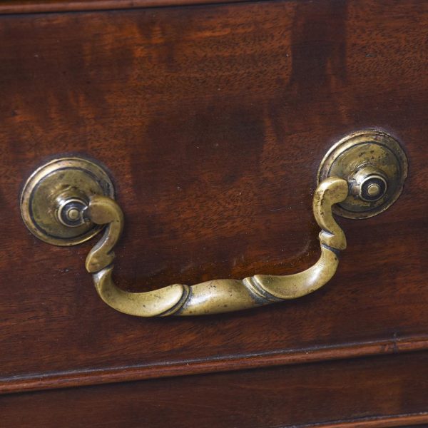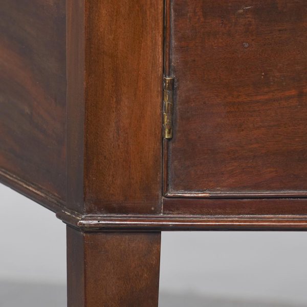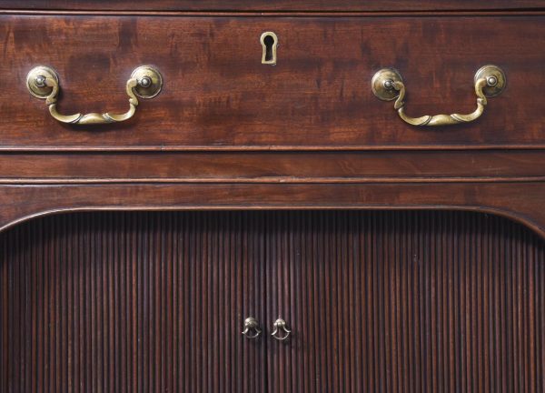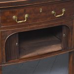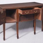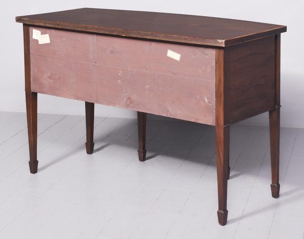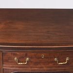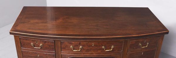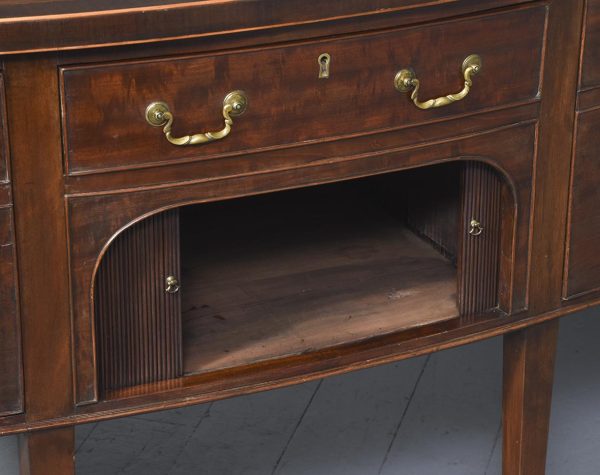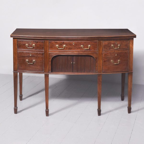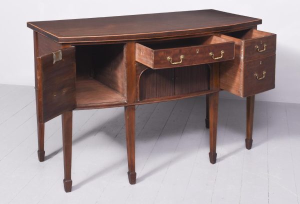 Circa 1790. A late George III mahogany and inlaid bow fronted sideboard. The top with broad banding framed by ebony and boxwood inlay with a boxwood fore-edge. The front with one long bow fronted drawer flanked by a pair of double drawers, each with the original cast brass swan neck handles with a combination of a double drawer and faux drawers which is a cupboard, beneath the central drawer are a pair of tambour doors with cast brass axe head drops, all supported on six square tapering legs, finishing on an extended spayed foot.