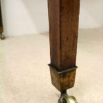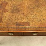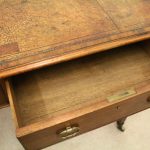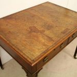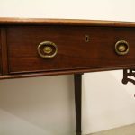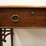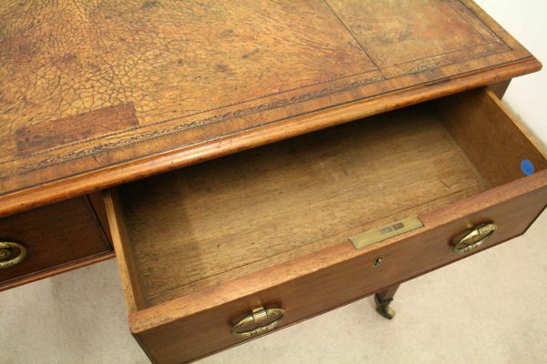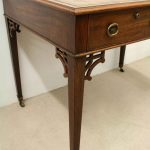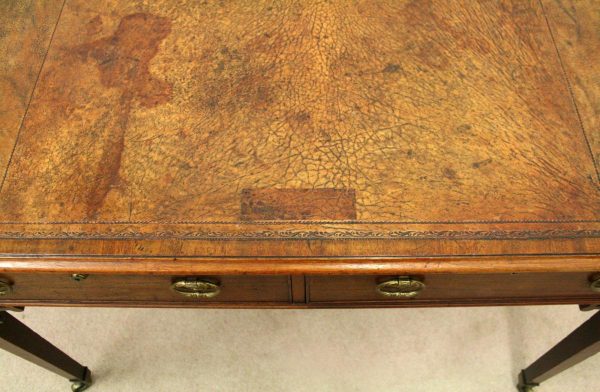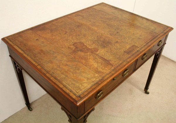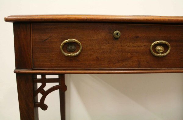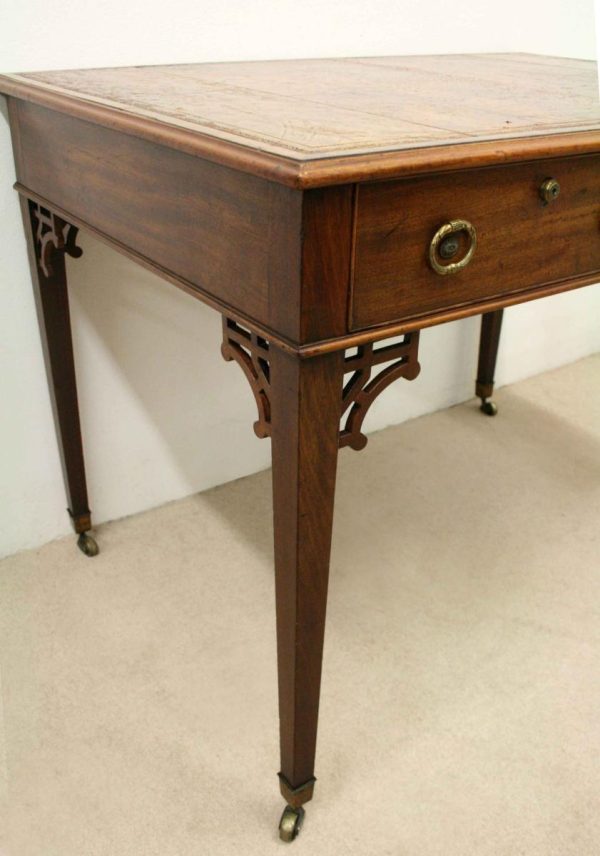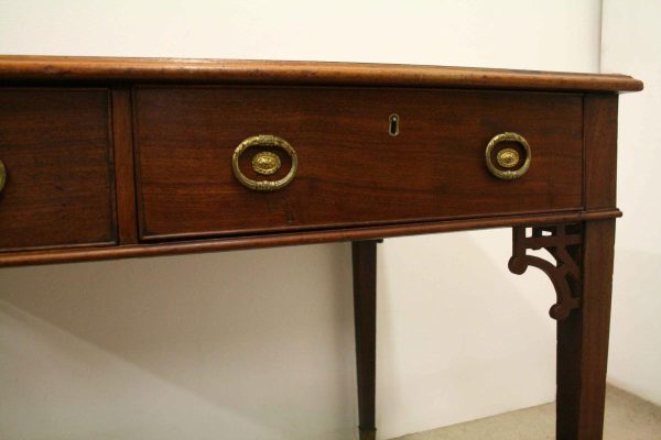 Circa 1775, George III mahogany library table/desk. The rectangular shaped top has a brown leather writing surface with tooled edges. There is a narrow banding and an ogee moulded fore edge. Below this there are two drawers at the front and two at the back, with oak liners. The drawers have simple rounded escutcheon and cast brass oval handles (one changed). Beneath the drawers is a fine ogee moulding and stylish Chinese Chippendale style open fretwork brackets on each of the corners. The table stands on four square tapering legs finishing on brass castors. Neat size, good colour and sturdy.