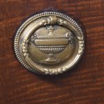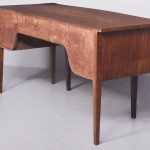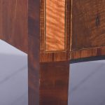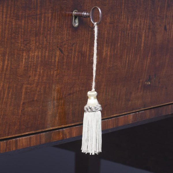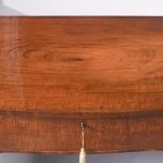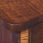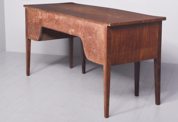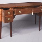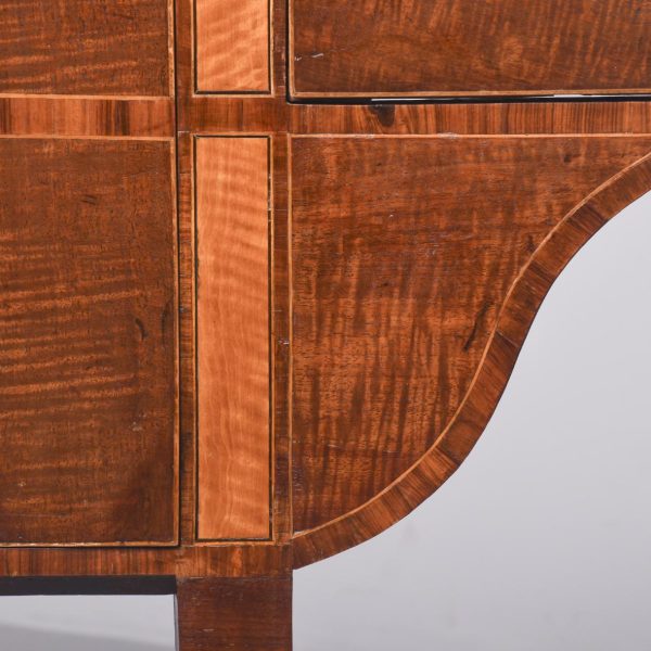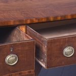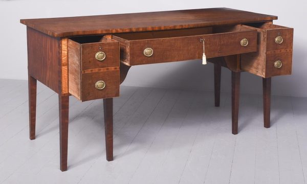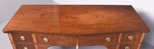 Circa 1780. A quality serpentine fronted George III mahogany sideboard. The solid top which has been cut out of the heart of the tree with the elongated concentric ring extending from the centre, the front with one large full-length drawer, flanked by a faux double drawers with similar handles, separated by panels of satinwood. The sideboard rests on six square tapering legs.