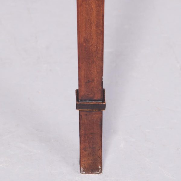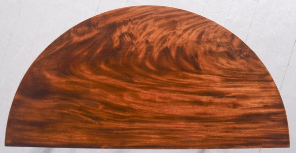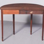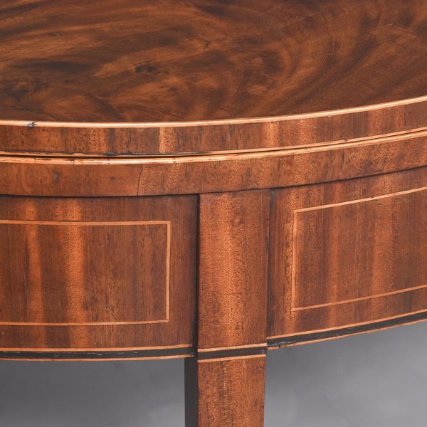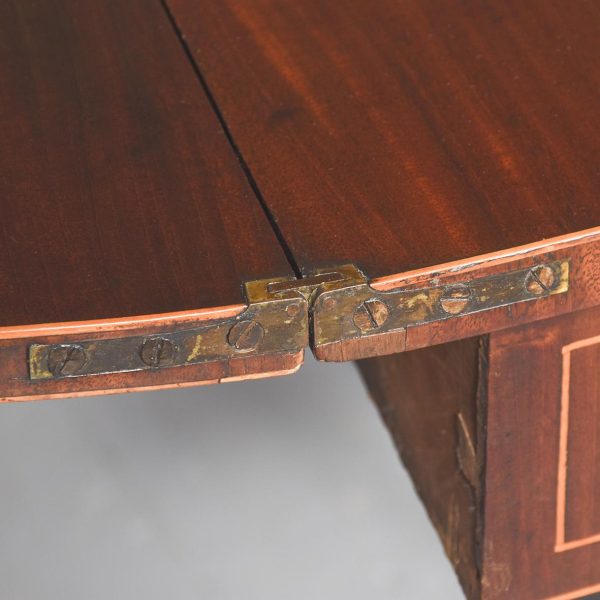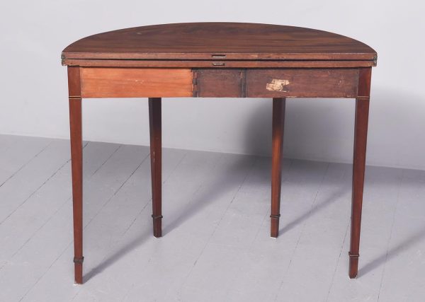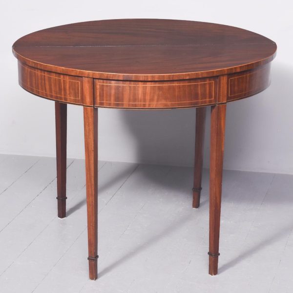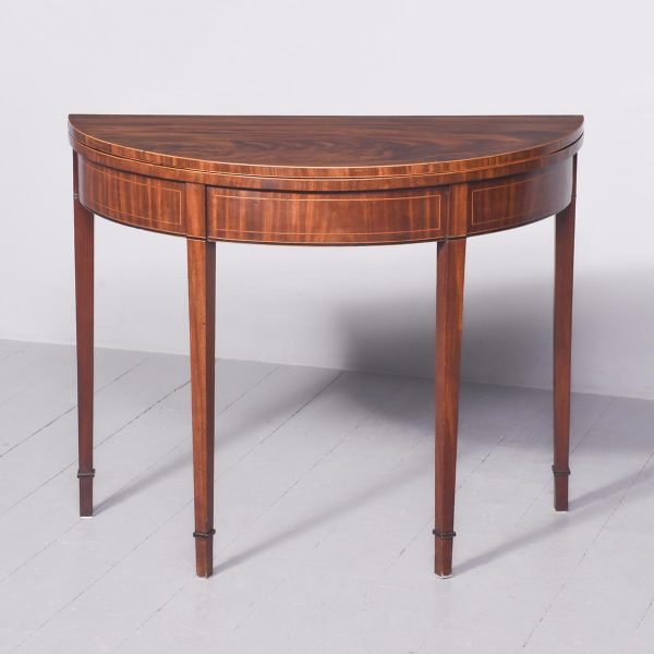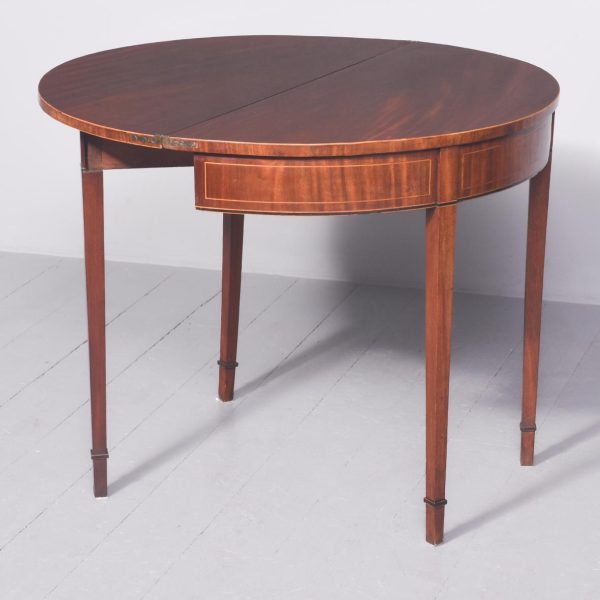 Circa 1800. A late Geo III mahogany and inlaid fold over tea table, the top in fine flame mahogany with boxwood inlay on the fore-edge. The hinged top opens to reveal a similar interior. The deep frieze with string inlay, ebony and box wood banding. The back legs are hinged and swing out to support the table when open, all resting on four square tapering legs with a beaded block just above the toe.