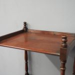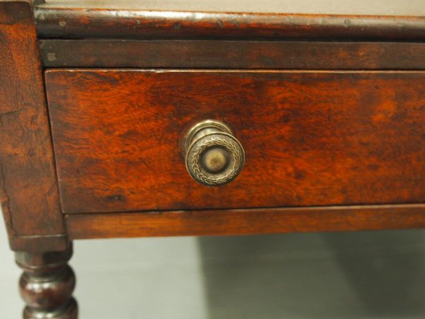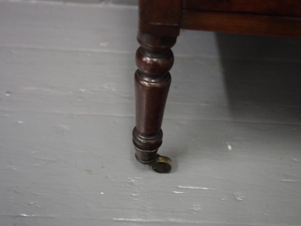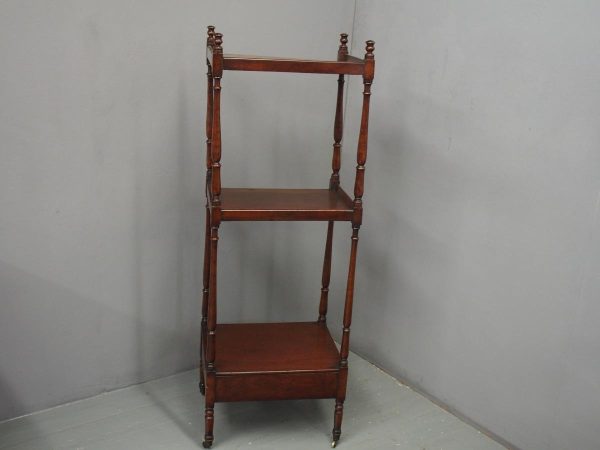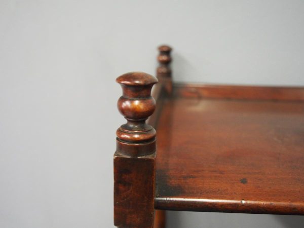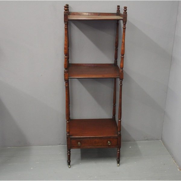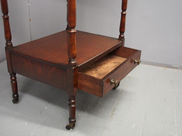 Circa 1800, George III three tier whatnot in figured Spanish mahogany. The three rectangular shelves with three-quarter galleries on fine ring and baluster turned supports. There are drawers to the base with brass handles and is all supported on neat ring turned legs over original brass caps and castors.