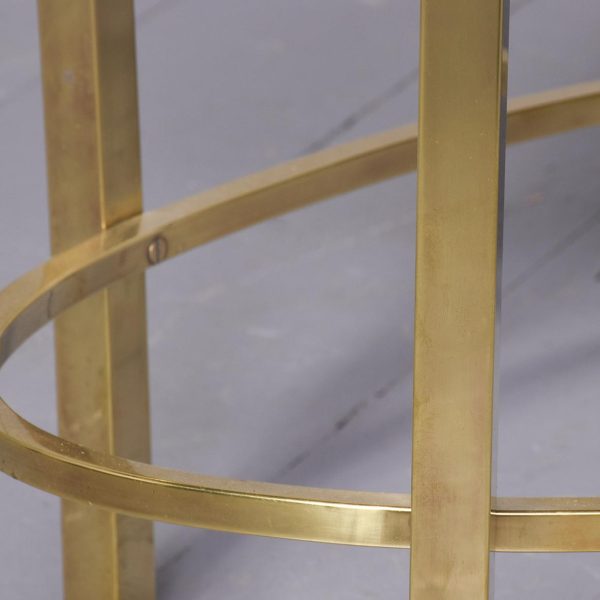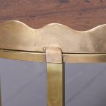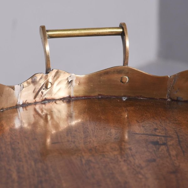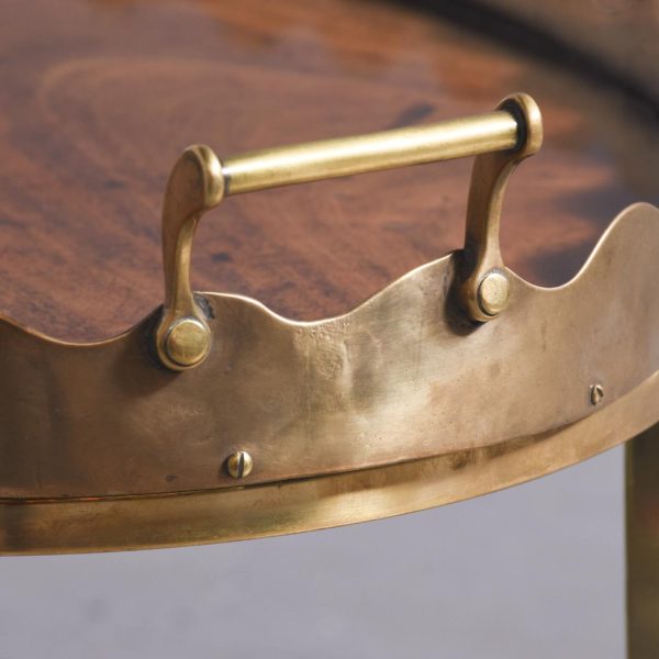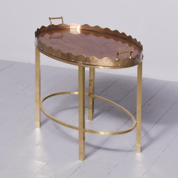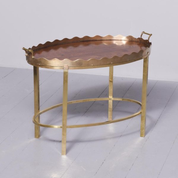 Circa 1780 and later. A quality George III mahogany oval tray, with wavy brass gallery and a pair of cast brass lifting handles, resting on an oval brass base supported on four brass legs with conforming stretchers.
