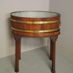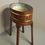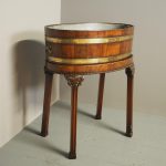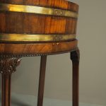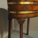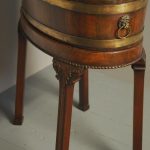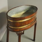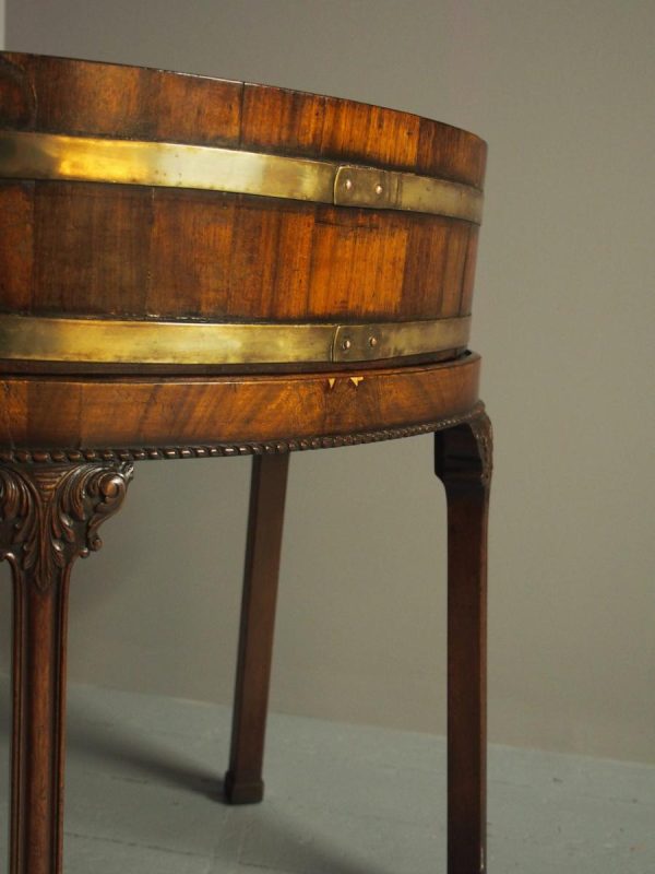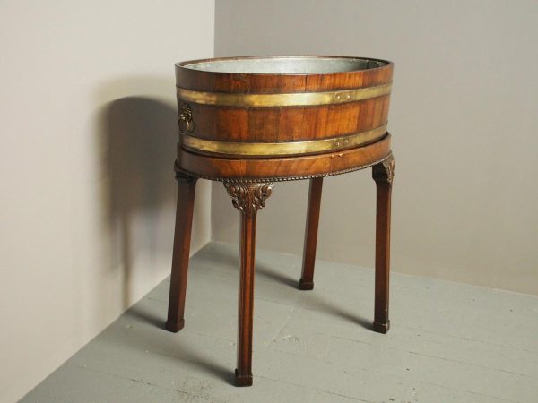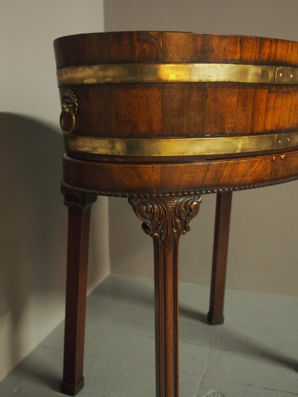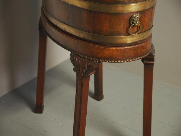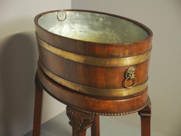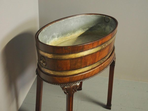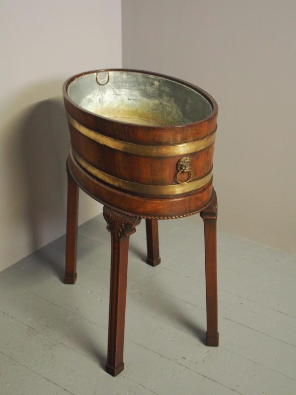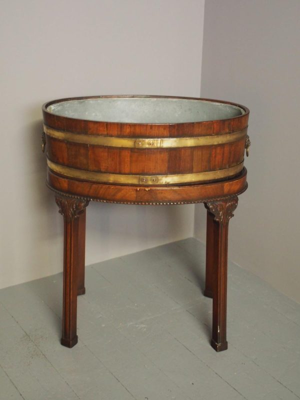 Circa 1800, George III open wine cooler. The brass-bound, oval wine cooler in finest Spanish mahogany with cast brass lion mask handles and original zinc liner. Supported on original stand with a cross-banded and gadroon-moulded frieze, over fluted square legs with acanthus carved capitals and block feet.