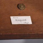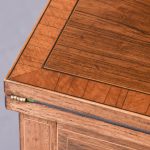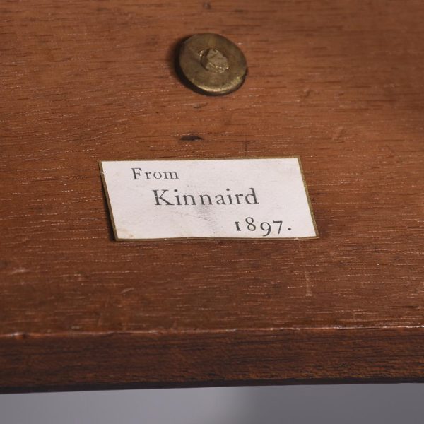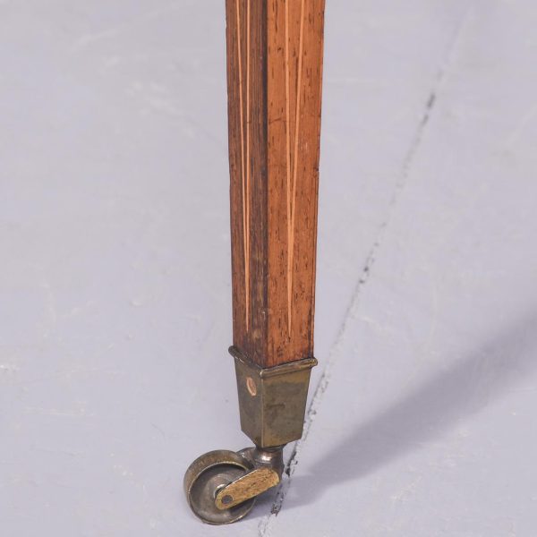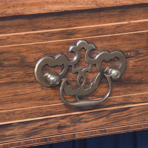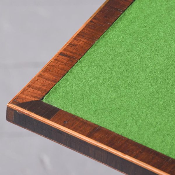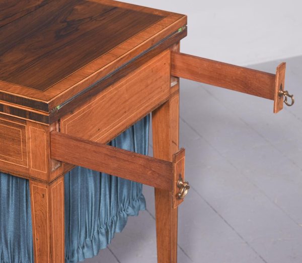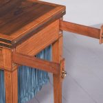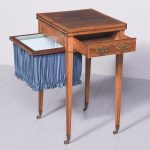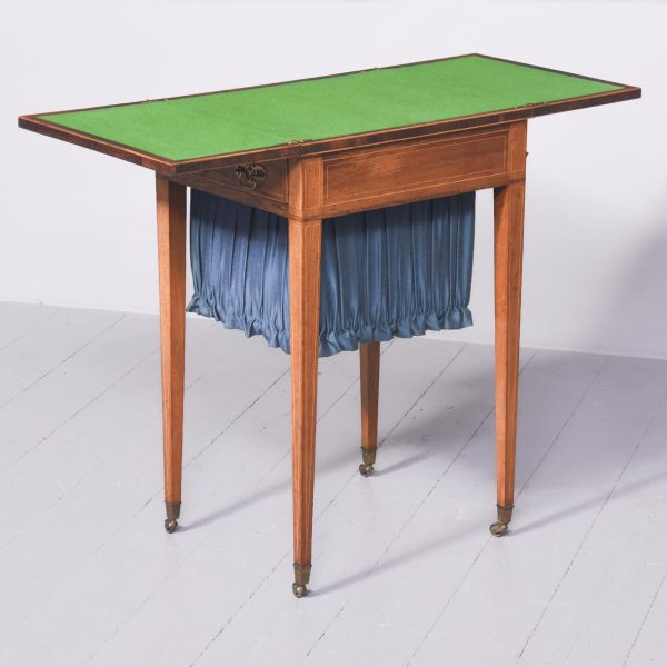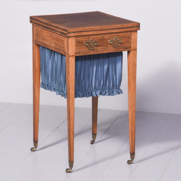 Circa 1800. A late George III rosewood, satinwood and inlaid games and sewing table. The hinged top in well figured rosewood with broad banding and string inlay, opens to reveal a felt lined interior, on the side a pair of lopers with original cast brass axe head drops to support the flaps, the other side with a drawer. The frieze is finished on all sides with banding and inlay, retaining the original sewing basket in fabric. The table rests on four elegant legs with string inlay which tapers, finishing on a brass cup and castor. Provenance ‘Kinnaird 1897’ on a label in the drawer.