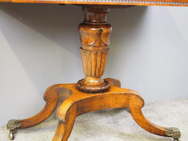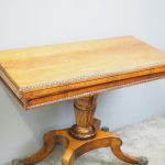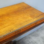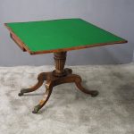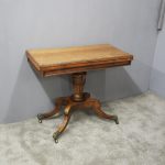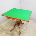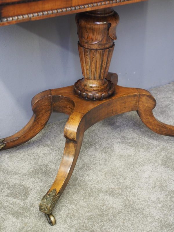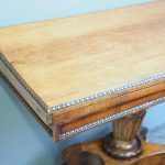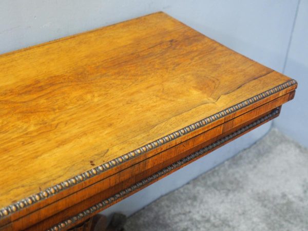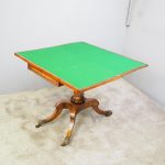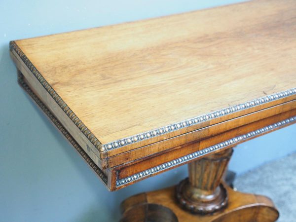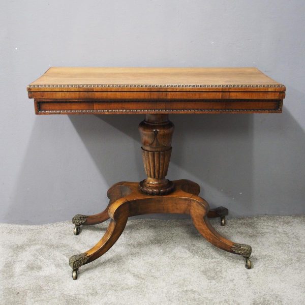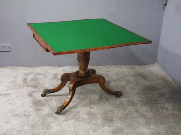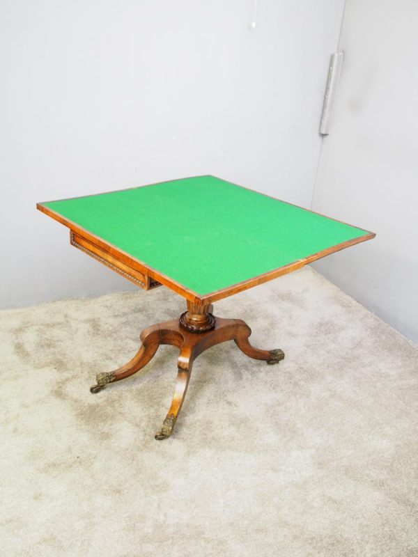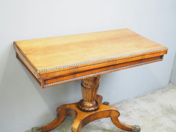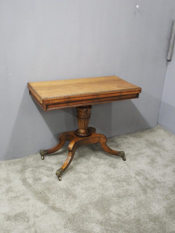Circa 1800, George III Scottish rosewood, fold over games table in the manner of William Trotter of Edinburgh. The rectangular top is in figured rosewood with a mellow colour and has an egg and dart beaded fore-edge, which opens to a green baize-lined interior. There is a panelled frieze with beaded mouldings, which is on a foliate carved and fluted tapering support. This has a ribbed collar and is over a shaped platform base, finishing on hipped cabriole legs with unusual oak leaf brass caps and castors.