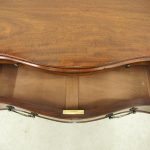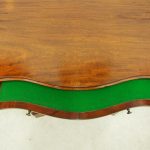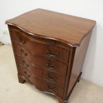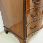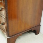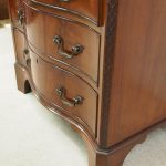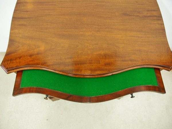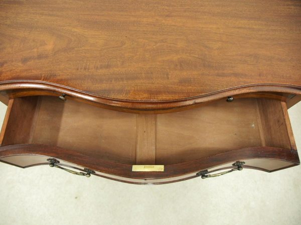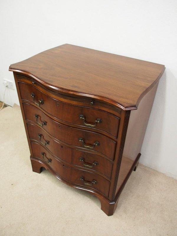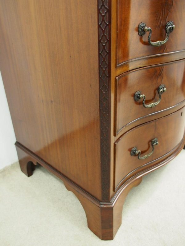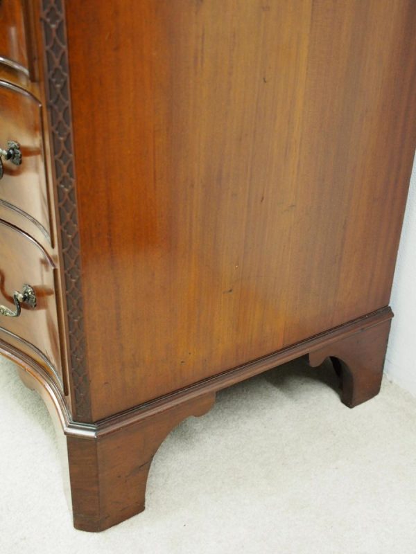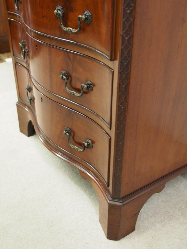 Circa 1900, George III Chippendale-style, neat-sized, serpentine front mahogany chest of drawers. The figured mahogany top with a moulded rim sits over a baize lined writing slope with brass pulls above four graduated drawers with cast brass bail handles and mahogany liners. The canted corners feature blind fretwork, and it is all supported by shaped bracket feet.
