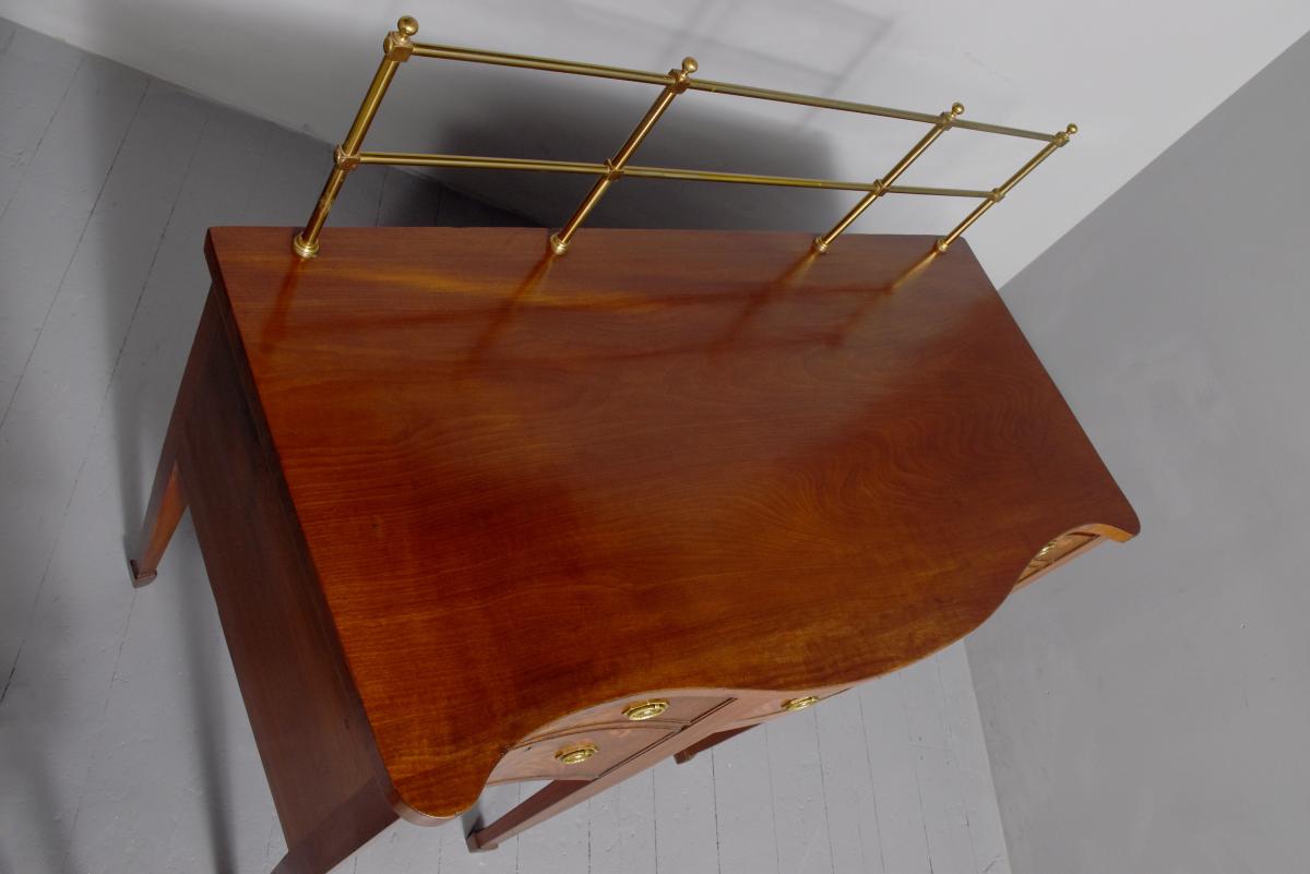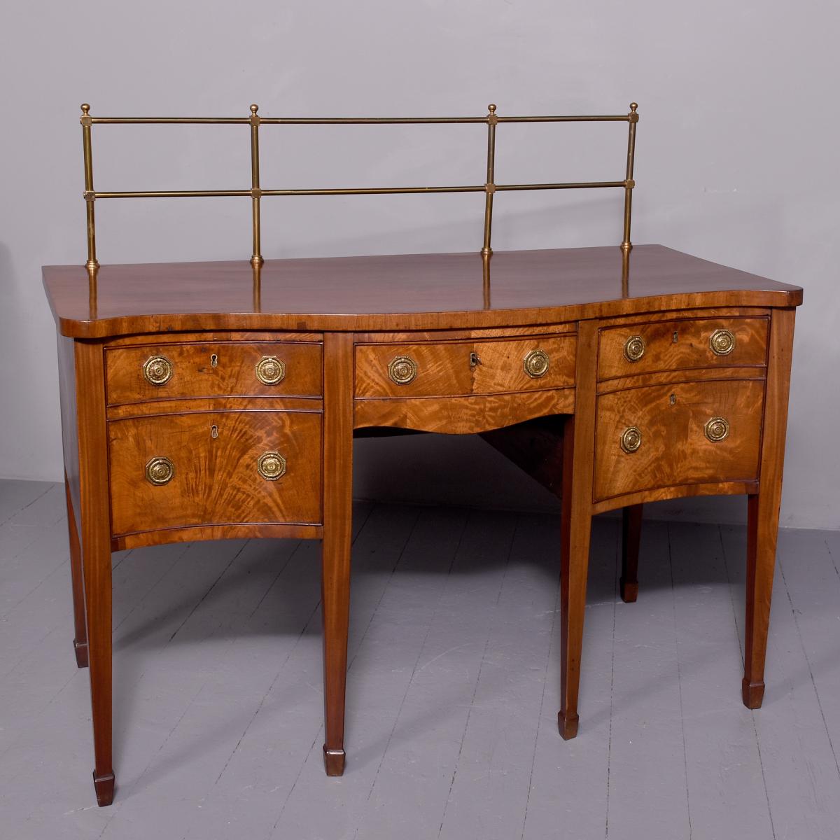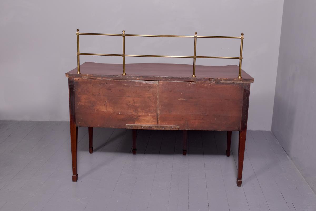 Circa 1780. A George III mahogany serpentine front sideboard, the top with a stylish brass gallery which rises to a height of 34 centimeters, the serpentine front in finest figured mahogany with a deep fore-edge, the front with a small drawer in the center and shaped apron beneath, flanked by a pair of double faux drawers, the one on the right is fitted out for wine bottles, the other has a removable tray, all the handles have cast brass back plates with circular and engraved ring handles, resting on six square tapering legs finishing with spayed toe.