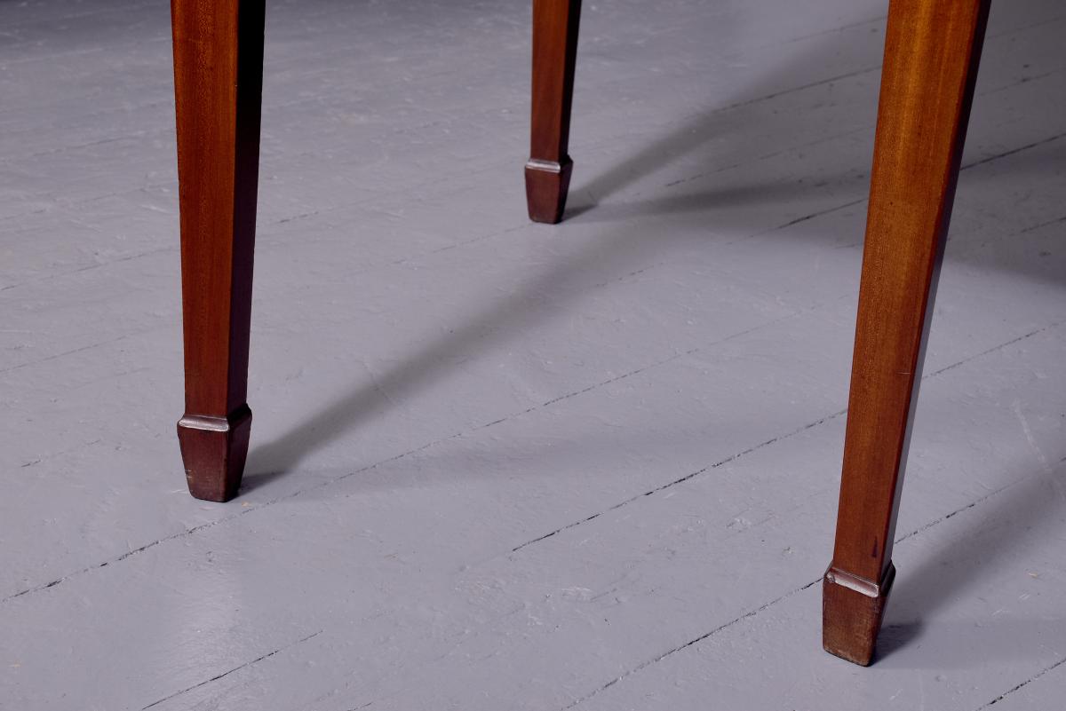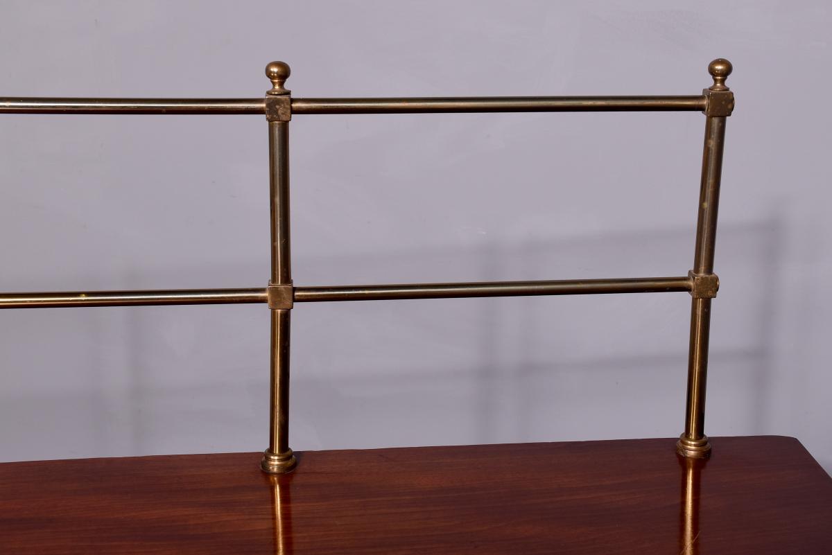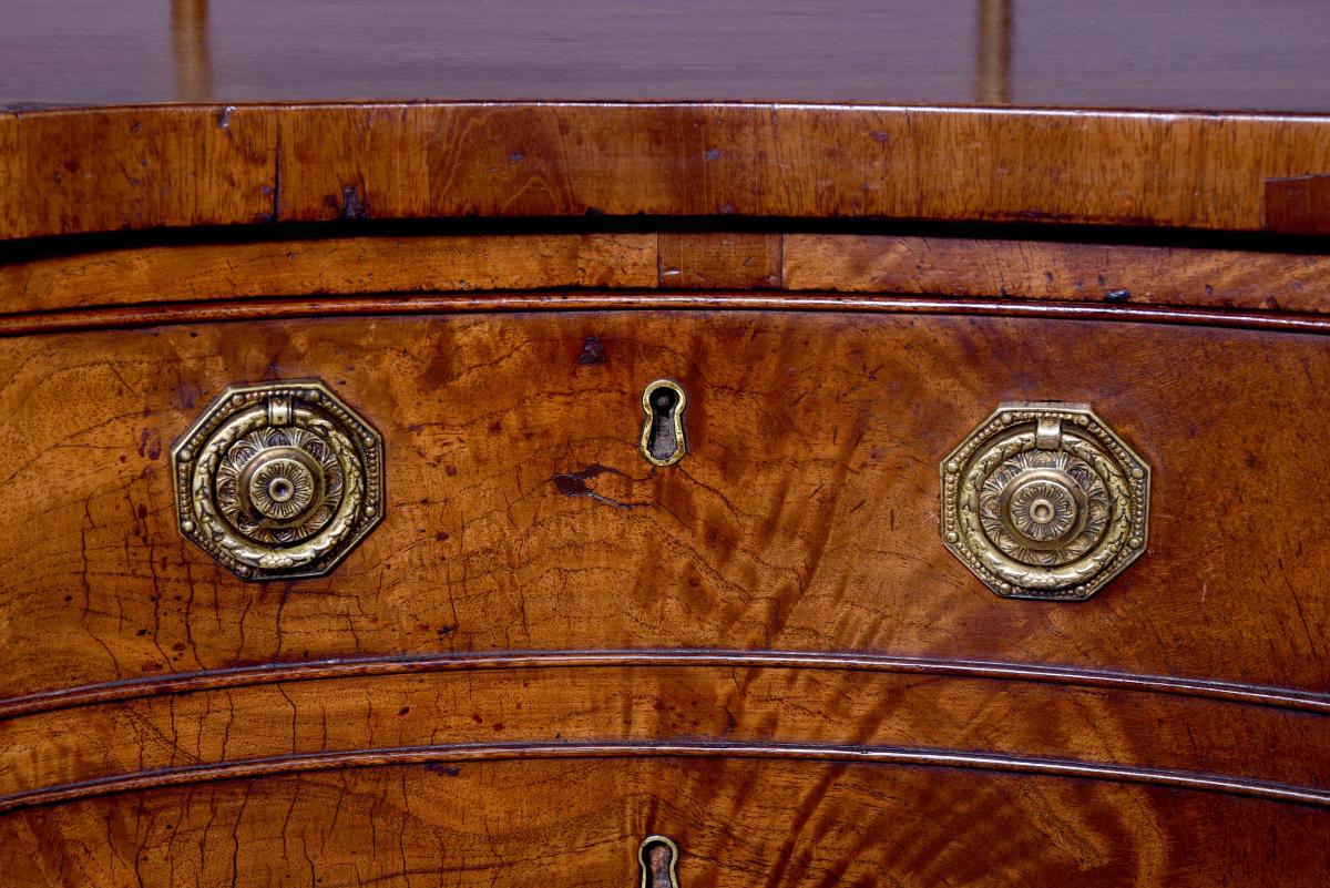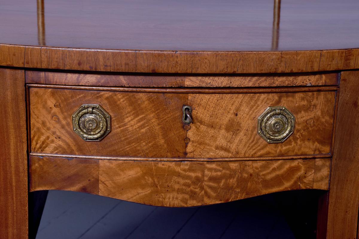 Circa 1780. A George III mahogany serpentine front sideboard, the top with a stylish brass gallery which rises to a height of 34 centimeters, the serpentine front in finest figured mahogany with a deep fore-edge, the front with a small drawer in the center and shaped apron beneath, flanked by a pair of double faux drawers, the one on the right is fitted out for wine bottles, the other has a removable tray, all the handles have cast brass back plates with circular and engraved ring handles, resting on six square tapering legs finishing with spayed toe.