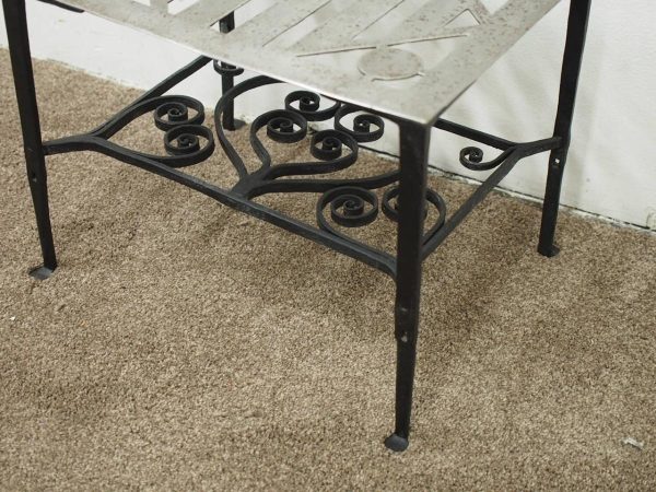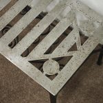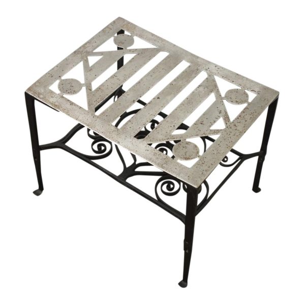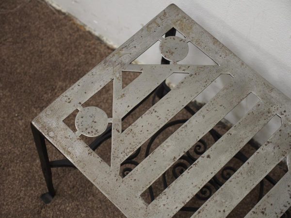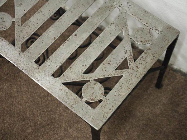 Circa 1800, George III steel and iron trivet. With interesting patterns to the top, and is riveted to a cast iron base with simple legs finishing on a pad foot. It has an unusual stretcher beneath with curling cast iron rods.