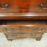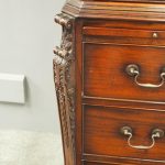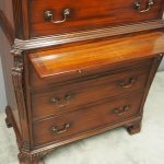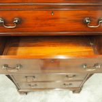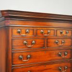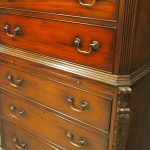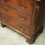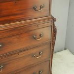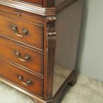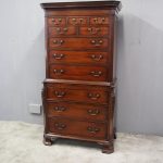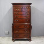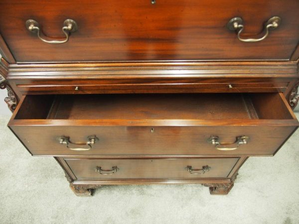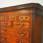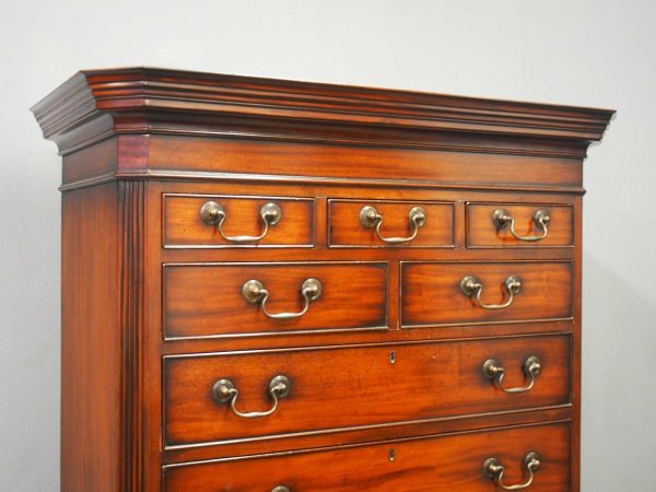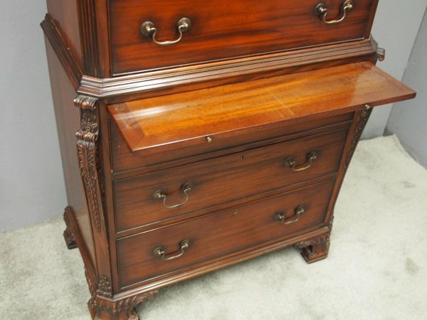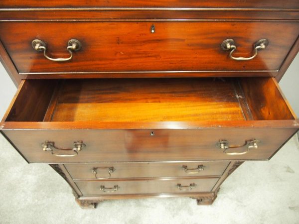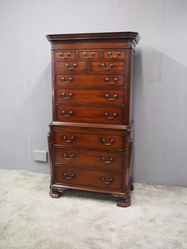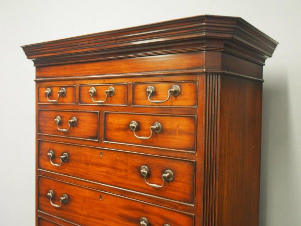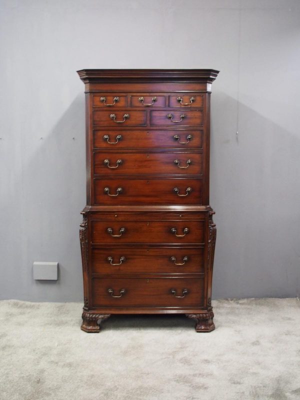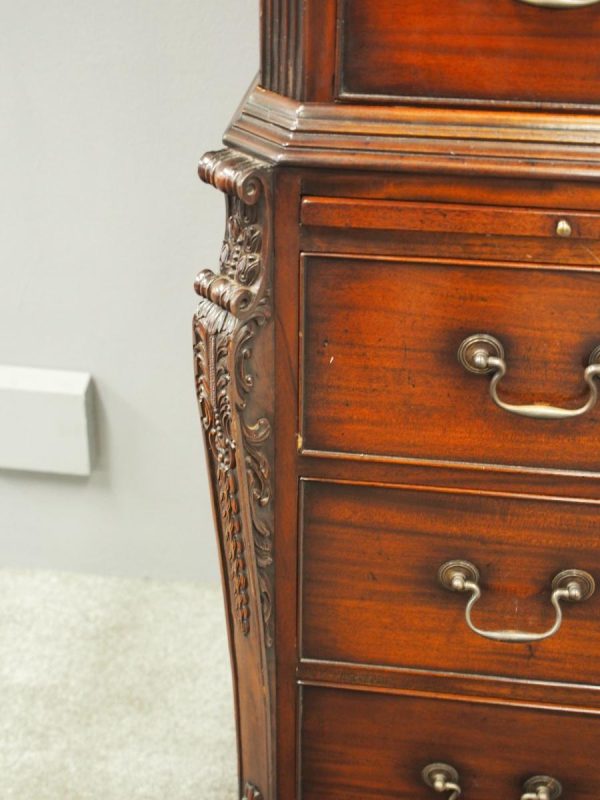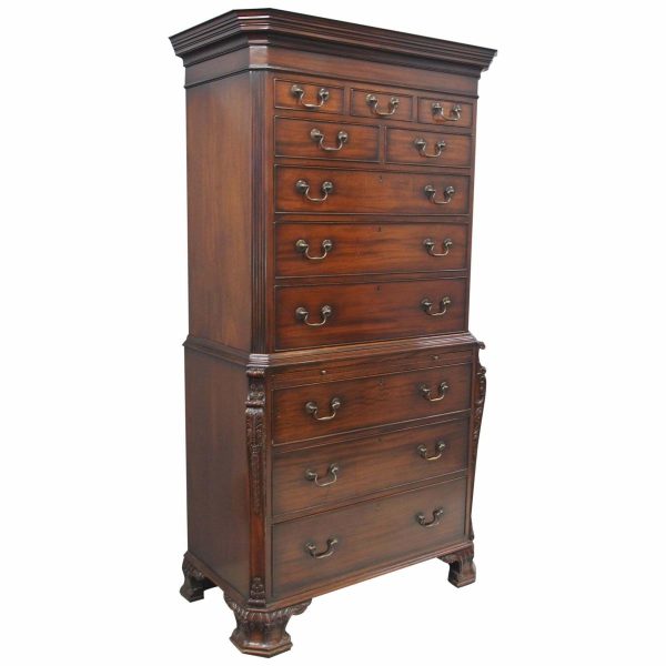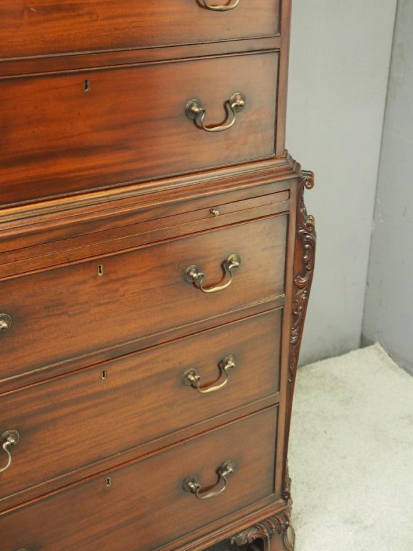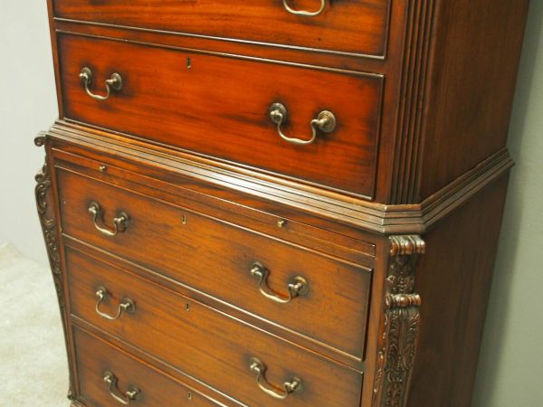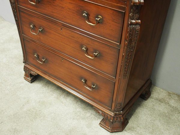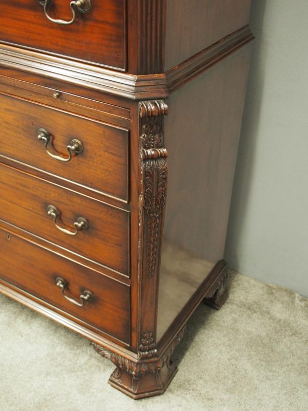 Circa 1990, quality reproduction George III style carved mahogany chest on chest of neat proportions. Surmounted by a stepped and moulded cornice above a plain beaded frieze, the upper section with fluted canted corners and an unusual 3 short over 2 short and then 3 full-length drawers with brass swan neck handles. The lower section with foliate-carved corner pilasters and with a brushing slide over 3 full-length graduated drawers. All supported on a moulded base and acanthus-carved ogee bracket feet.