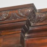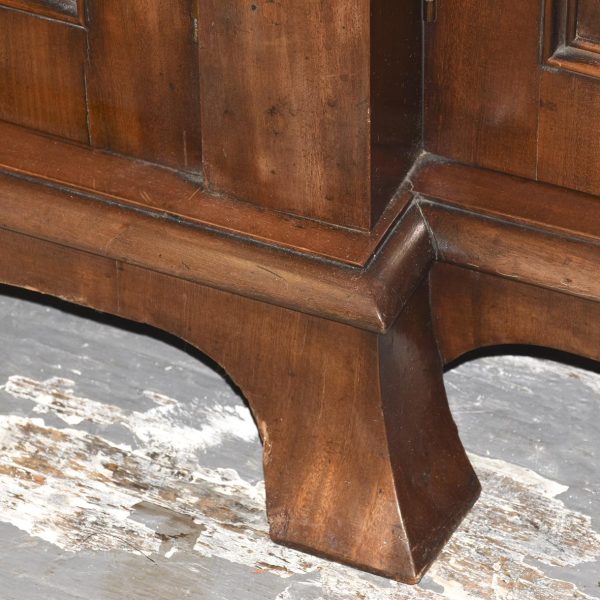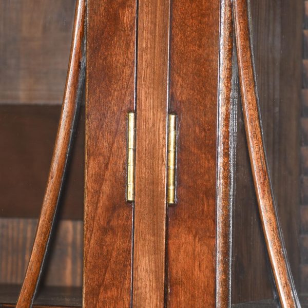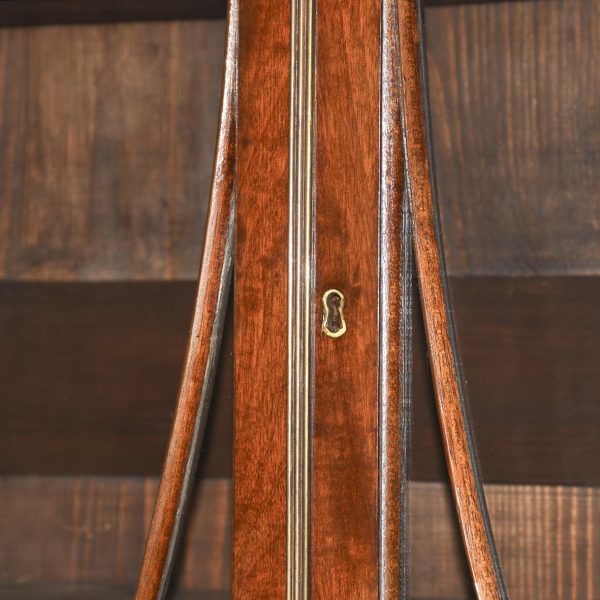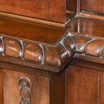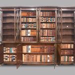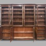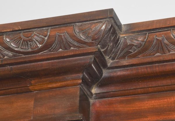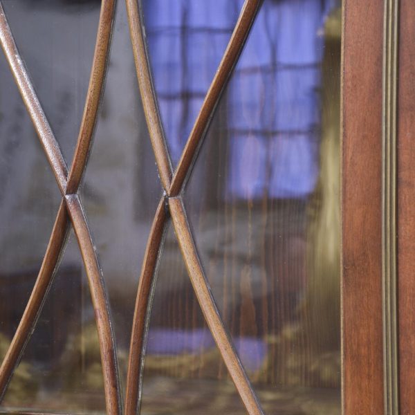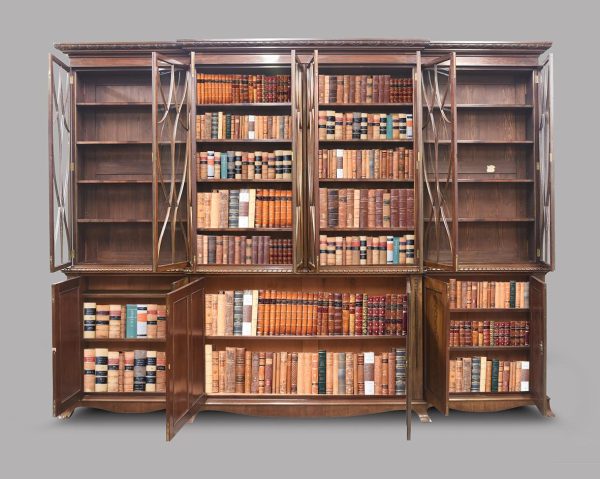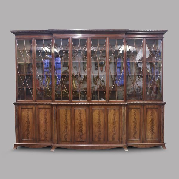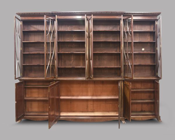 Circa 1890. A stylish mahogany George III style 8 door breakfront astragal glazed cabinet bookcase. The stylish carved cornice with lunette pattern, ogee moulding and simple frieze, the 8 glazed astragal doors each with a ribbed brass beading separating the doors and elongated elegant astragals. Inside each section there are 4 mahogany faced adjustable shelves, the base with a well carved dragooned fore-edge and four simple pilasters with carved tapering harebells, all the panels in matched flame mahogany with shelving inside. Beneath the bottom drawers there are three shaped friezes all on the front on squat splayed French bracket feet. The bookcase has excellent colour and patination and breaks down into several pieces.