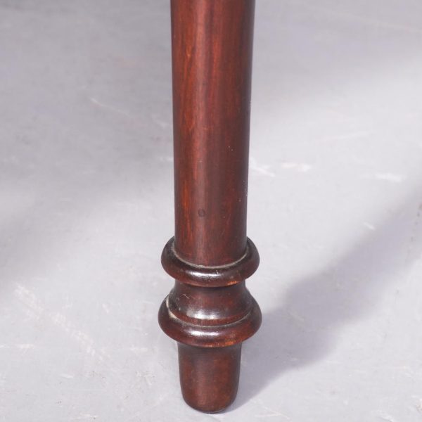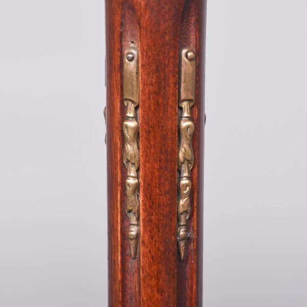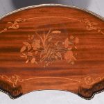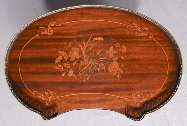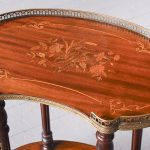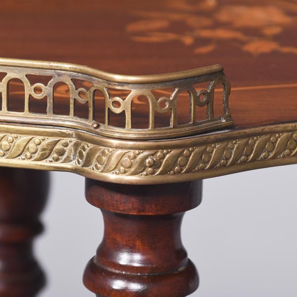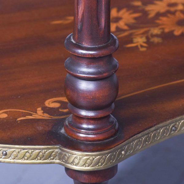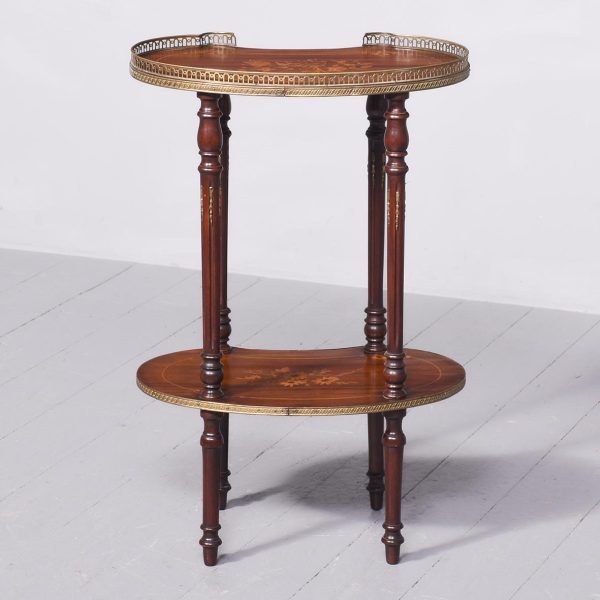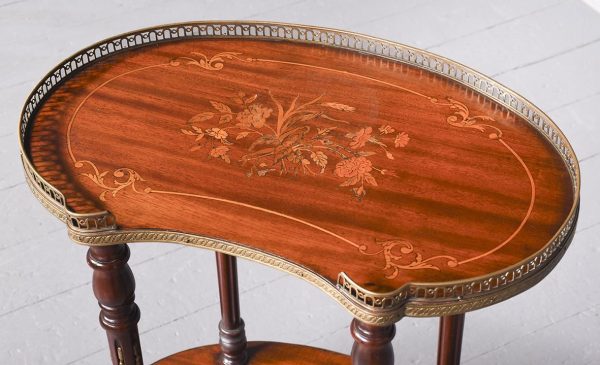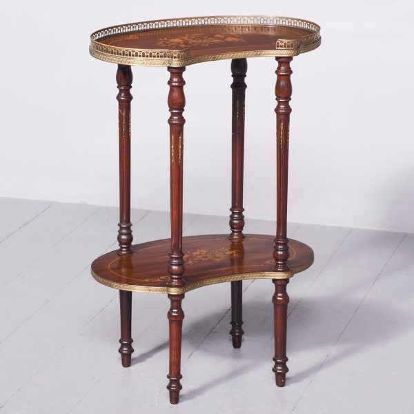Circa 1880, a George III style mahogany and brass kidney shaped two tier occasional table. The tiers are held in place by turned uprights with stylish ball finials. The three quarter wrap around gallery with open pierced fretwork on the top, and the fore edge of the shelves on top and bottom are covered in cast brass. As the legs continue down there is a small circular bezel and all stands on simple, elegant brass castors. Clean and sturdy with good patination on both tiers.