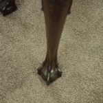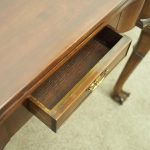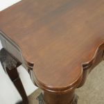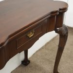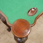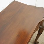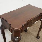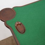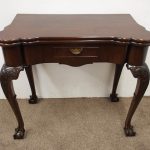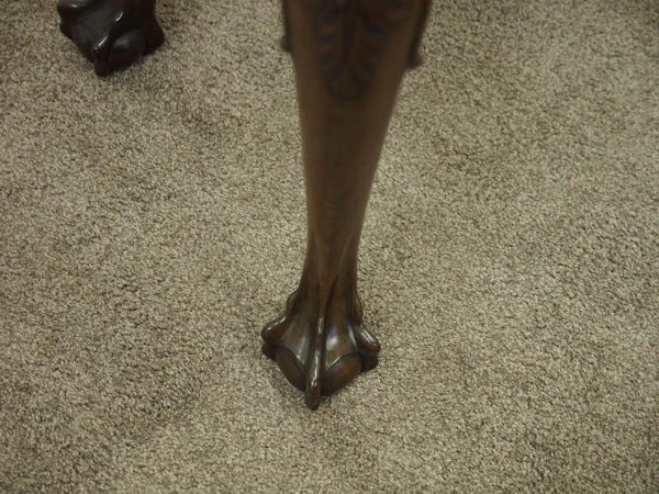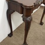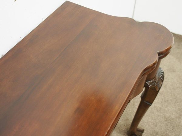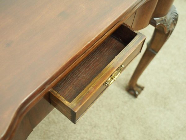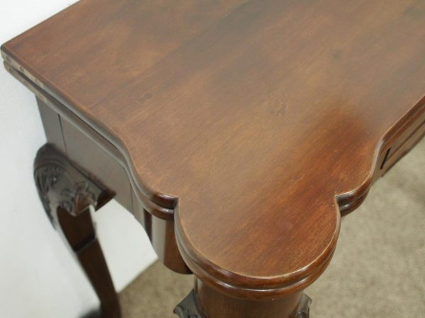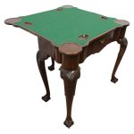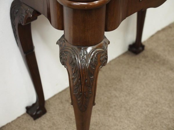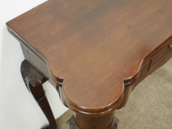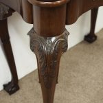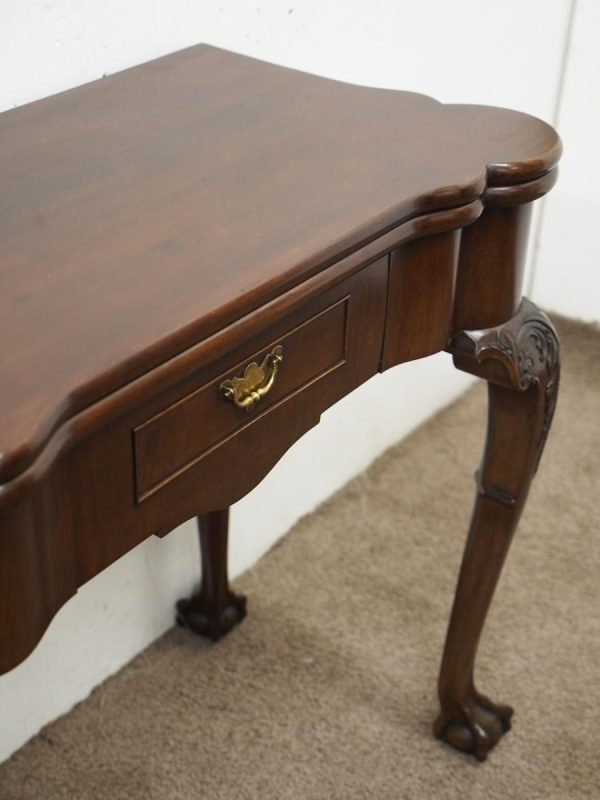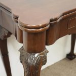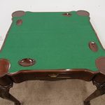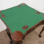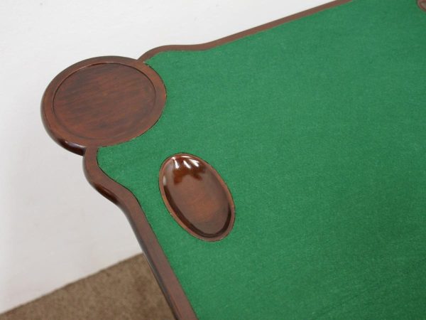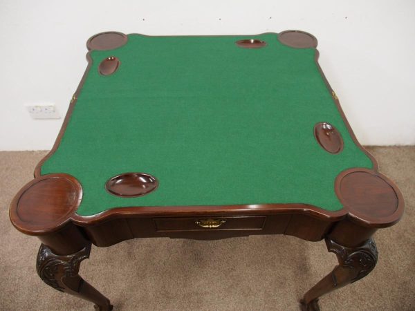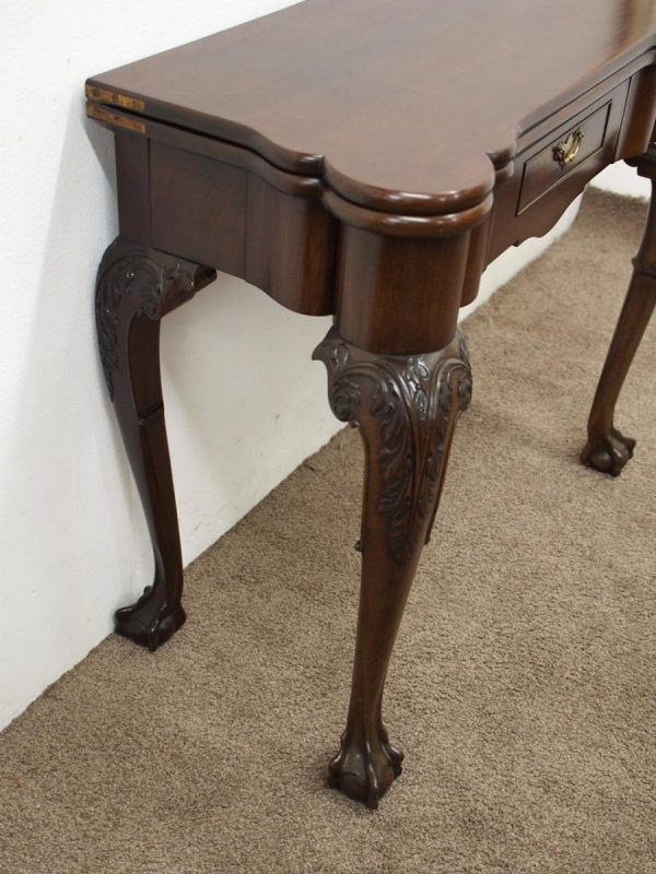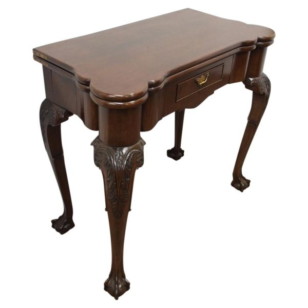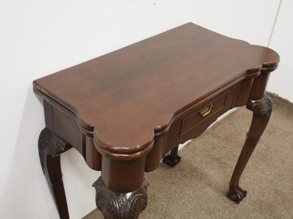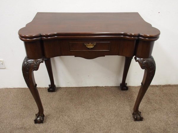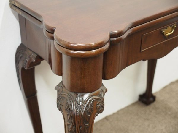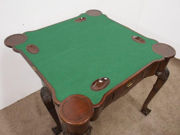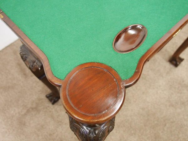 Circa 1900, early George III style card table in quality Cuban mahogany. The folding top with rounded outset corners opens to reveal a baize lined interior with counter wells. It has a shaped, crossbanded frieze with a single drawer and an engraved brass handle. This sits above a set of cabriole legs which have bold acanthus-carved knees and terminating in deeply carved ball and claw feet