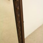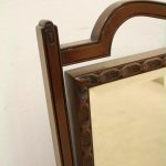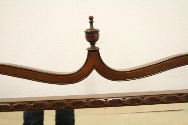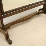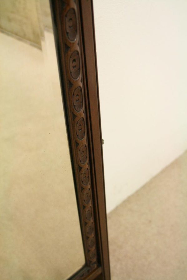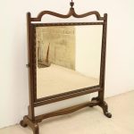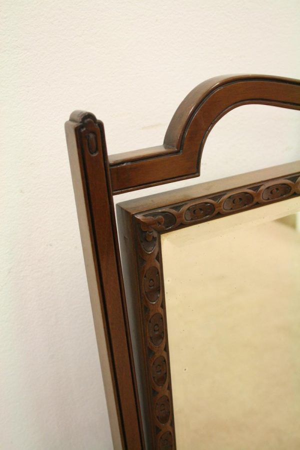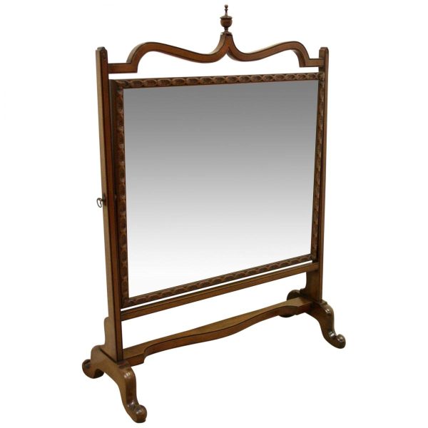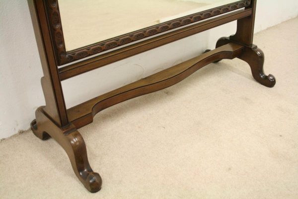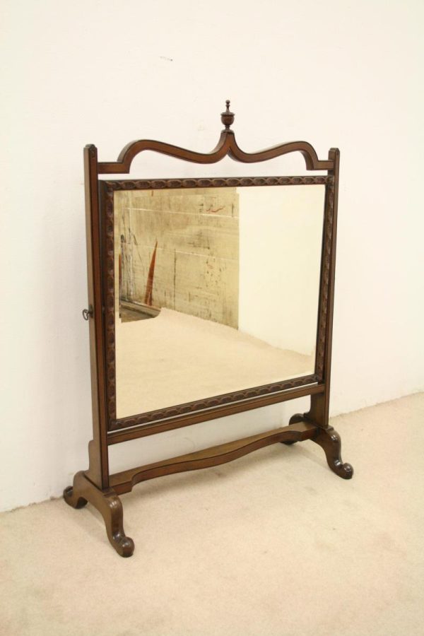 Circa 1900, George III style mahogany swivel mirror. Over the top there is a curved section which finishes with a stylish finial. There are 2 axe head drops holding the mirror in position and the frame of the bevelled edged mirror has a carved pattern that continues around the whole facing. Beneath the mirror there is a cross stretcher to give the mirror stability and below is a second shaped stretcher. From this the whole piece stands on 4 stylish pad feet which splay like a sofa table at the front and the back. The mirror has great style, colour and quality.