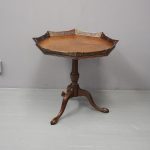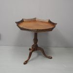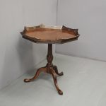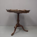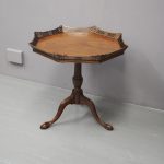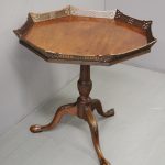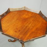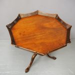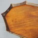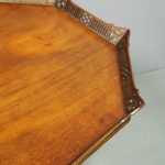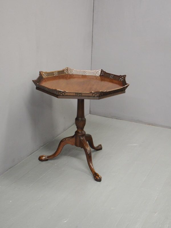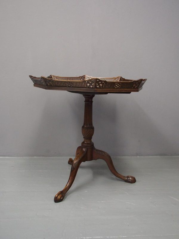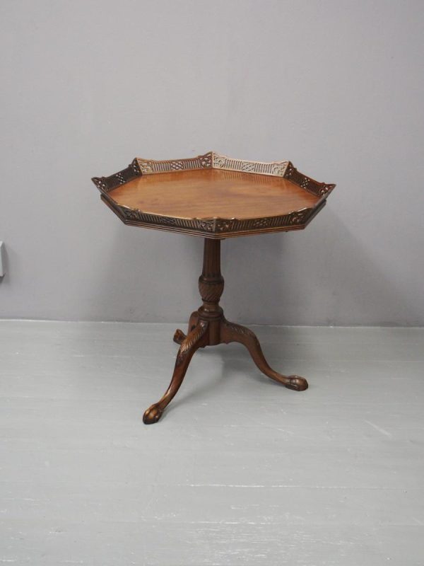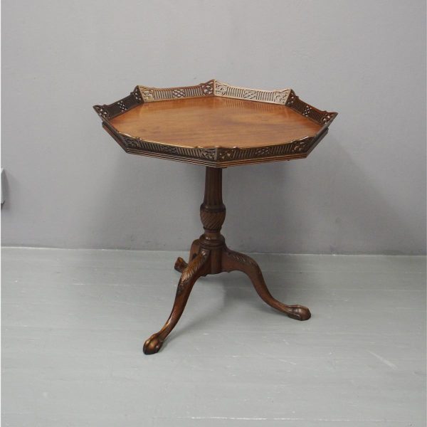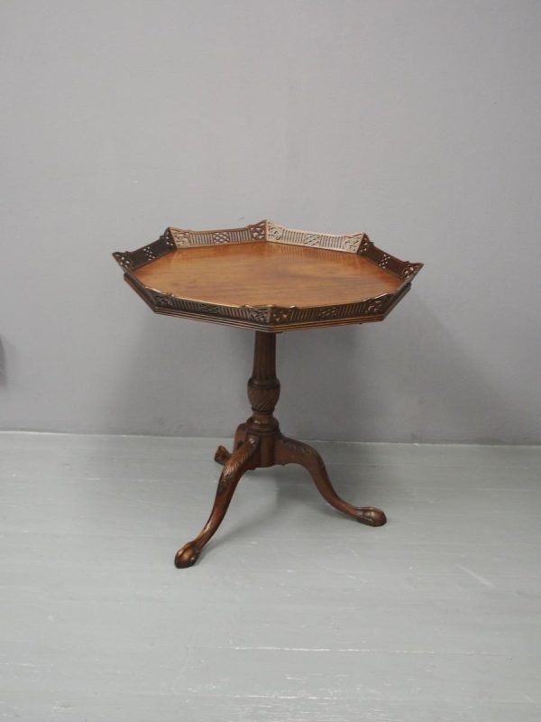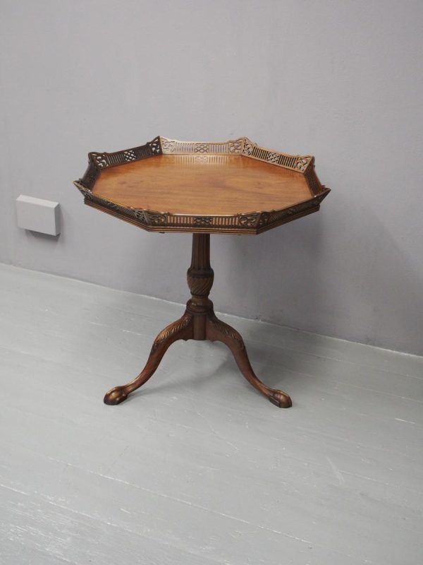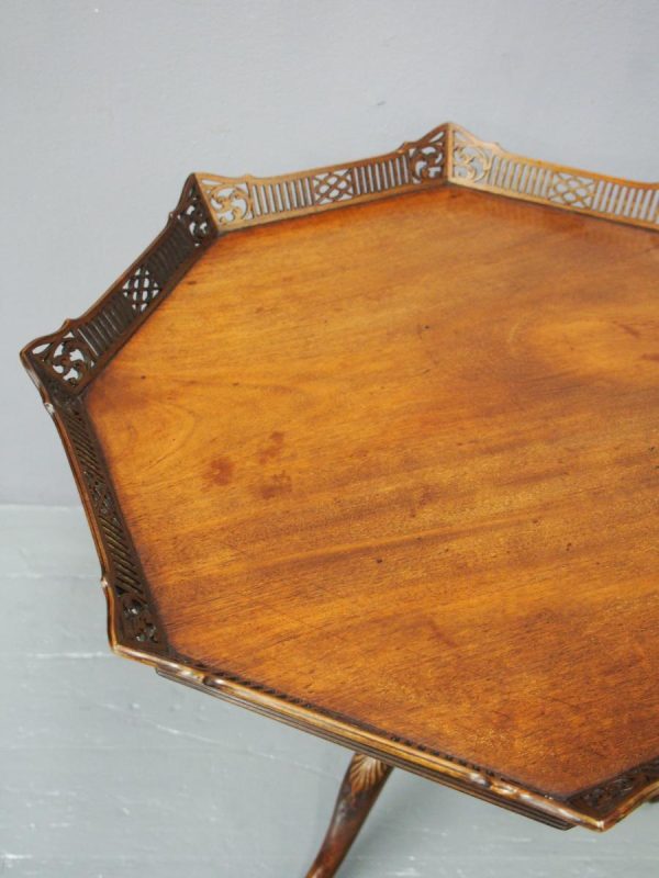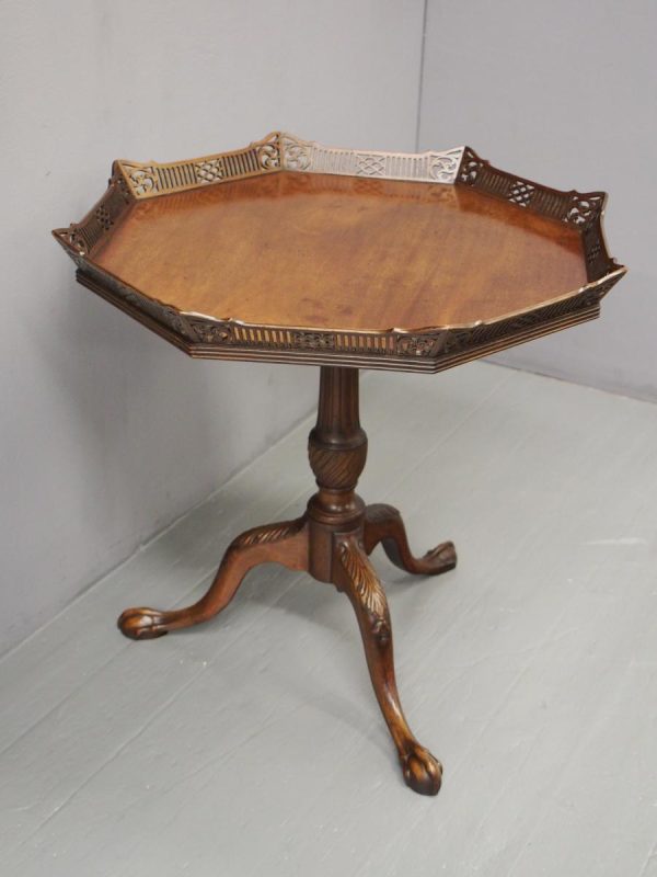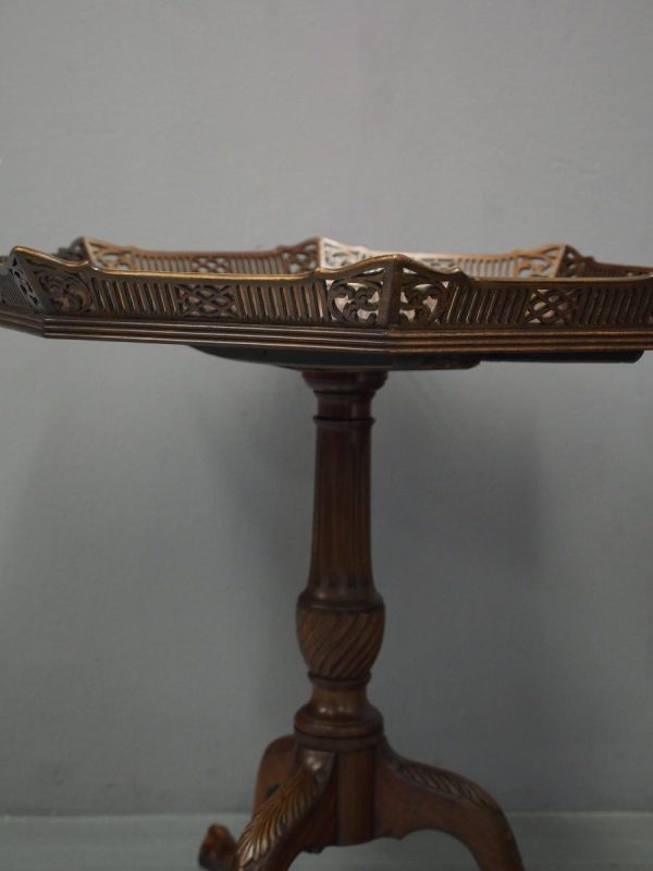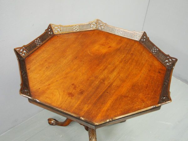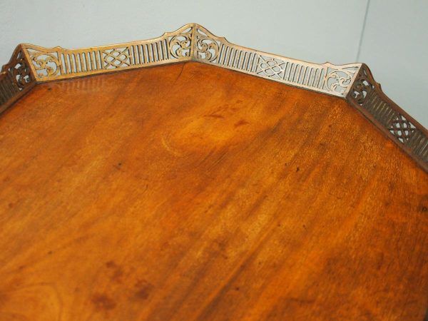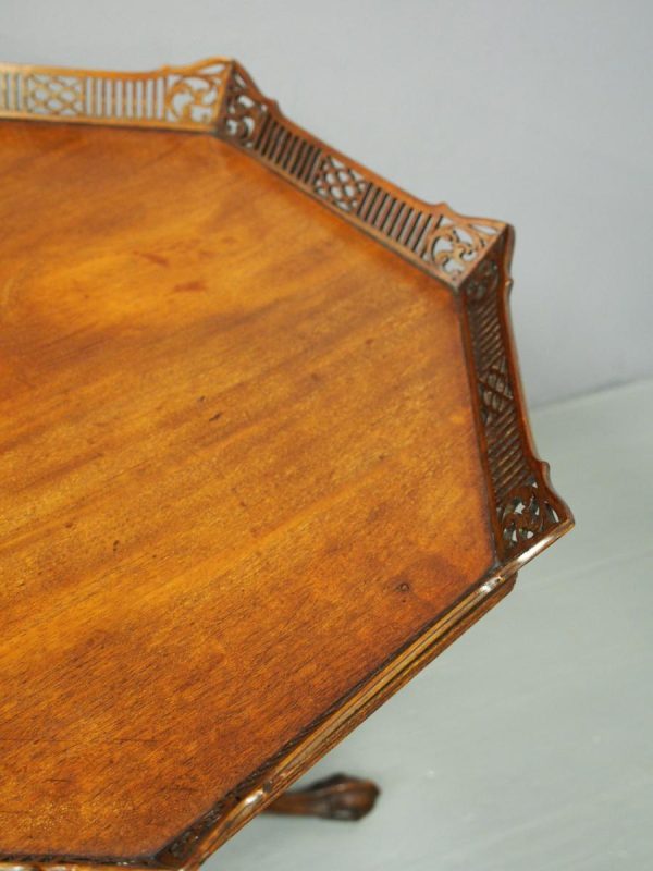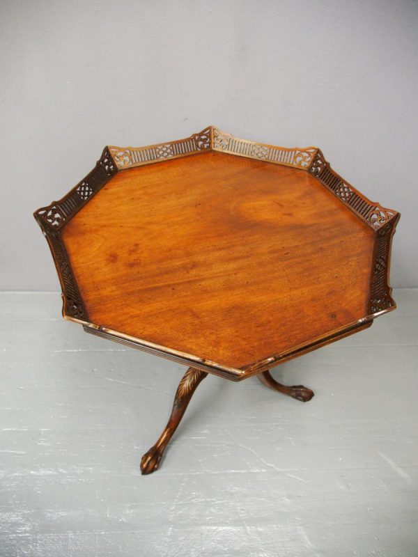 Circa 1880, George III style mahogany tray top table. The octagonal tray top has a fine fretwork gallery and stands on a fluted, turned balustrade support which is raised on 3 well carved cabriole legs finishing on a ball and claw foot.