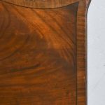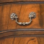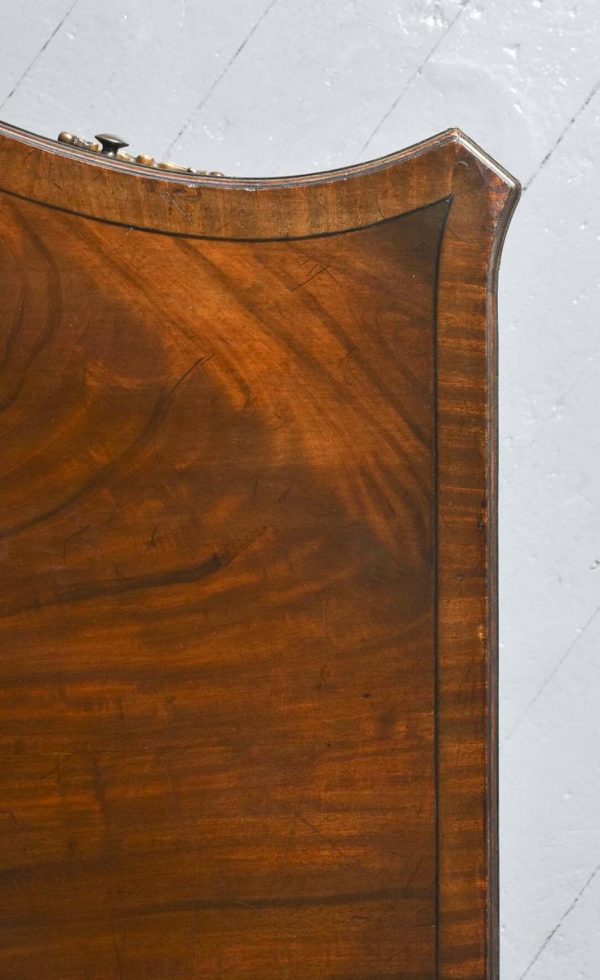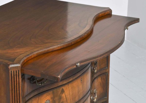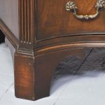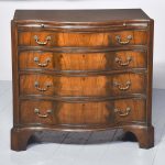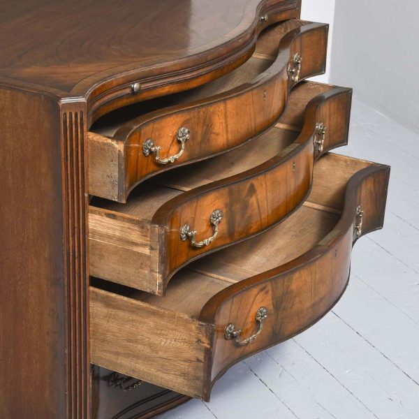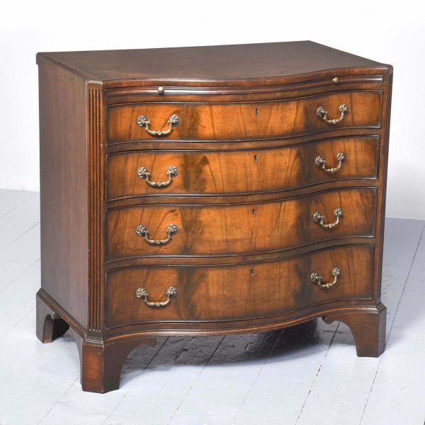 Circa 1920, George III style neat-sized, serpentine front walnut chest of drawers. The serpentine top in a figured, deep-coloured walnut with ebony string inlay and cross banding over a brushing slide with brass pulls and 4 graduated cock beaded drawers with solid drawer linings and cast brass swan neck handles, with fluted canted sides. All supported on a neat, moulded base on shaped bracket feet.