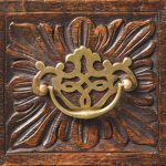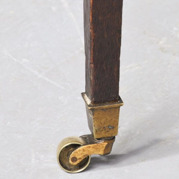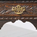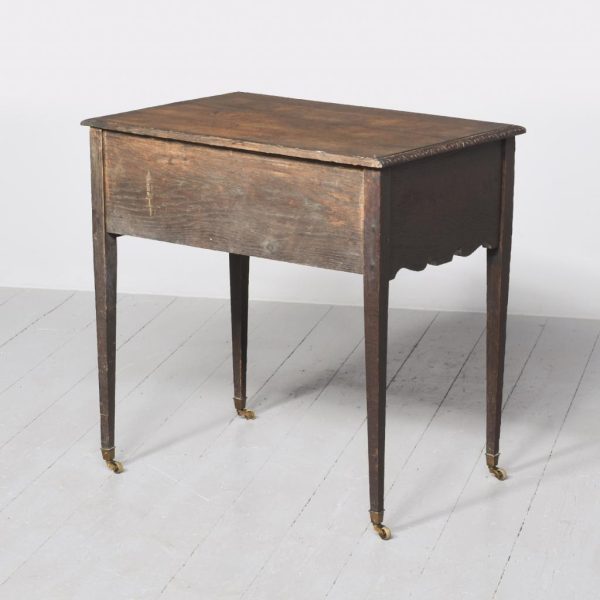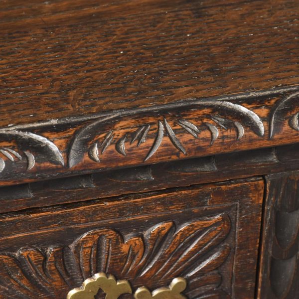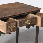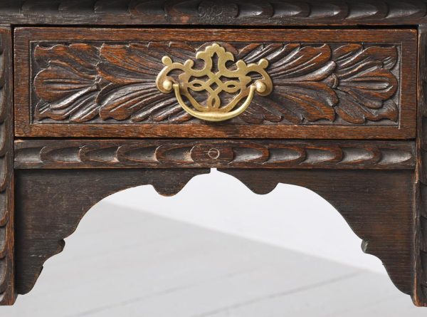 Circa 1880. George III style carved oak lowboy. Solid top with foliate carving fore edge, a configuration of one long drawer flanked by two smaller drawer drawers. All profusely carved with foliate carving, cast brass and pierced back plate handles, with a shaped and carved frieze beneath which continues around the sides. The table stands on four square tapering legs finishing on a brass cup, with brass castors beneath.