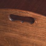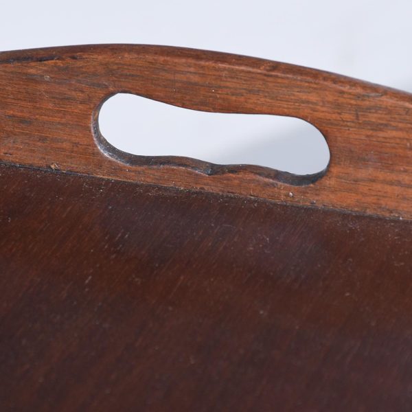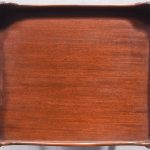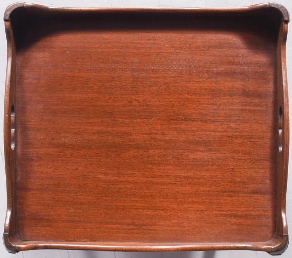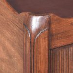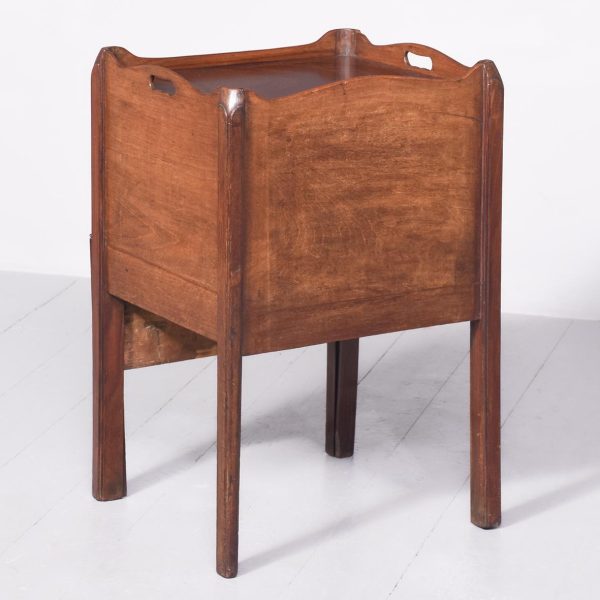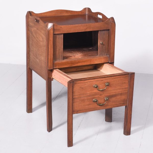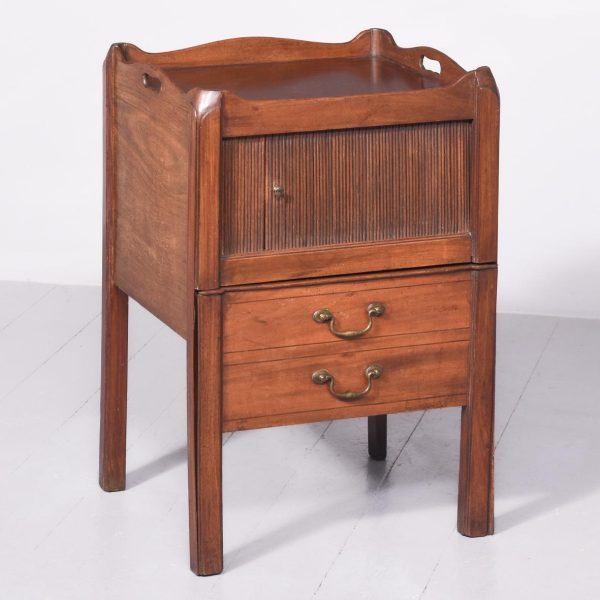 Circa 1790. George III tambour-front, tray-top bedside locker. The rectangular top with a shaped wrap around gallery with cut-out lifting handles above a tambour-front cupboard and two dummy drawers concealing one shallow drawer. All supported split, square legs.
