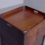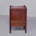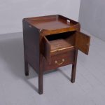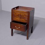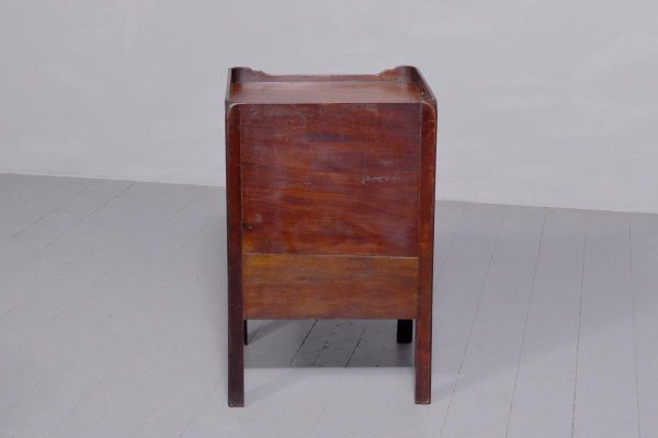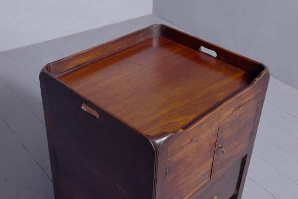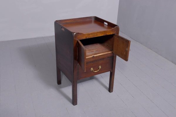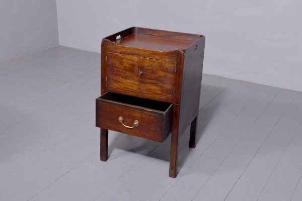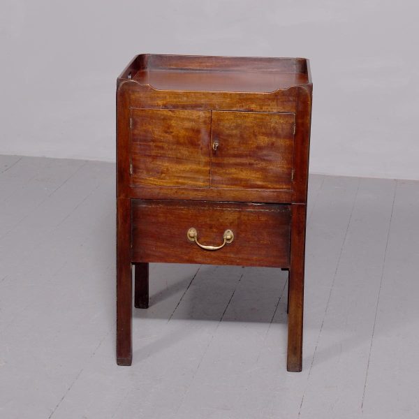 Circa 1780. George III tray top mahogany bedside table/commode of generous size. The top in a nice quality figured mahogany with a wraparound gallery with cutout lifting handles, above a two-door cupboard with brass axe head handles and a drawer with brass loop handle. All supported on square tapering legs with fluted corners. In excellent condition.