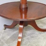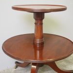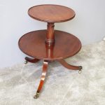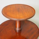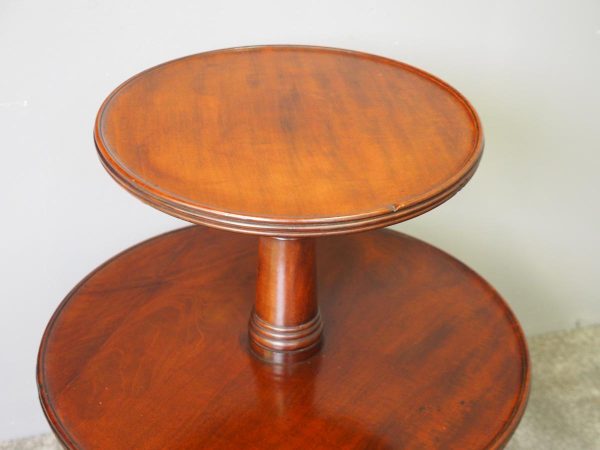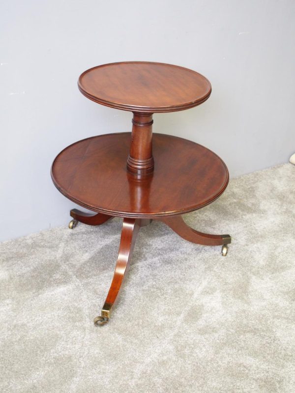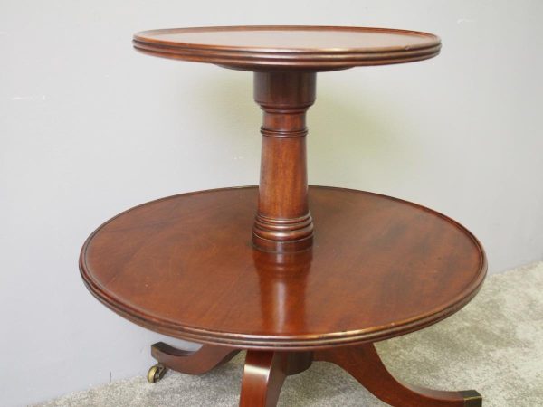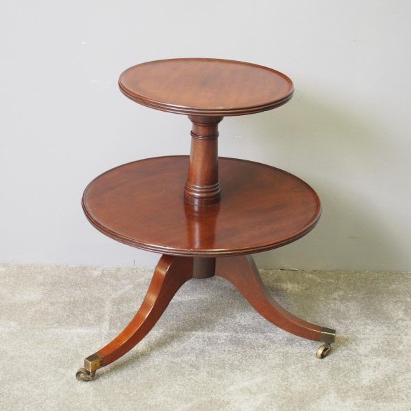 Circa 1790, neat sized George III two tier mahogany dumb waiter. The graduated, circular, dish-top tiers with fluted rims are supported on a gun barrel stem over 3 splayed tapering supports with brass castors. Diameter of top tier 44cm.