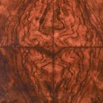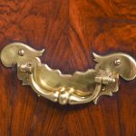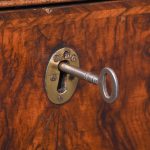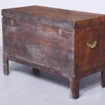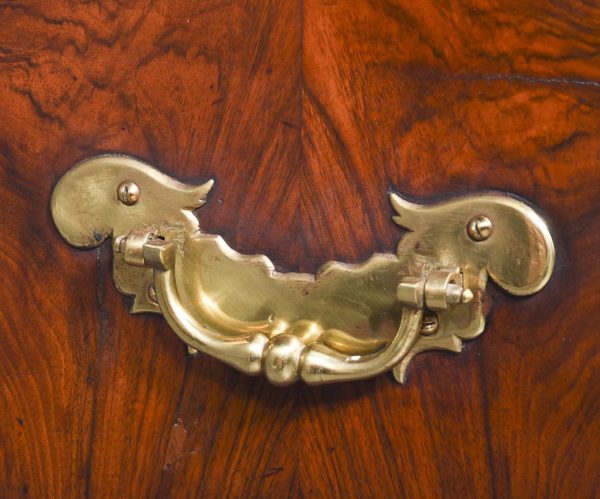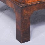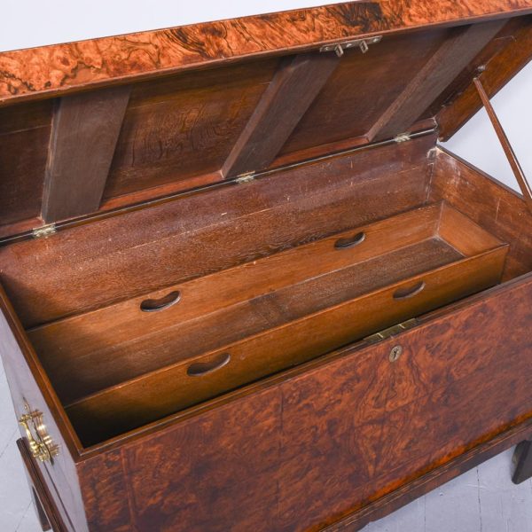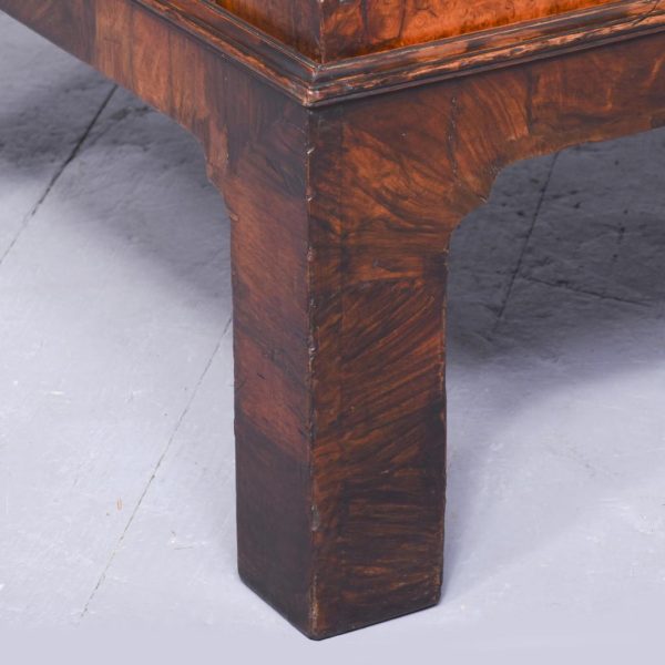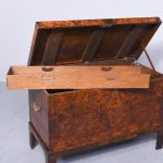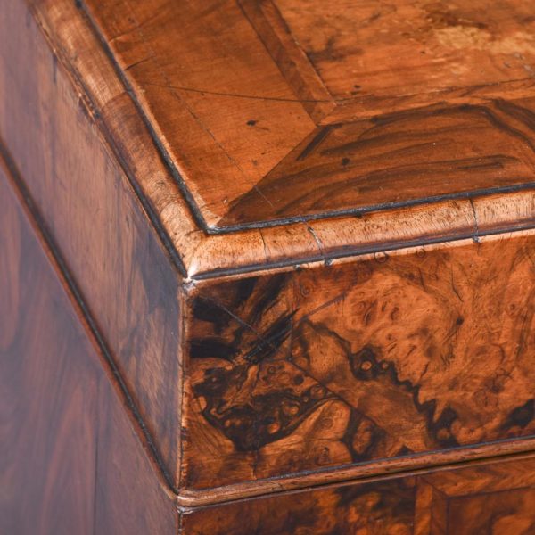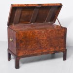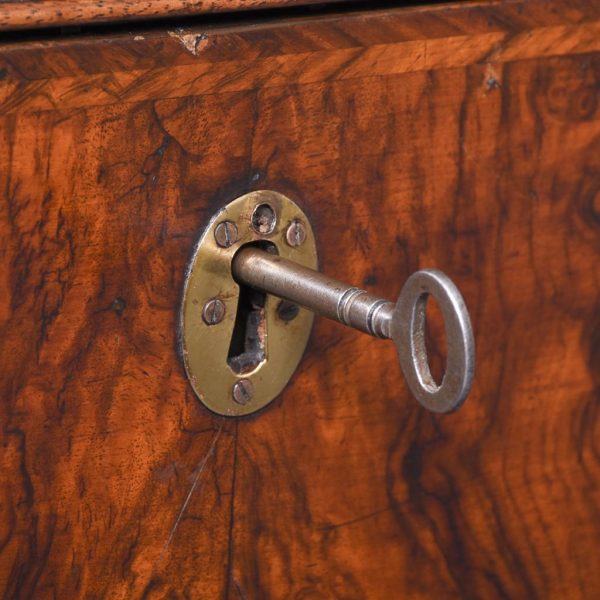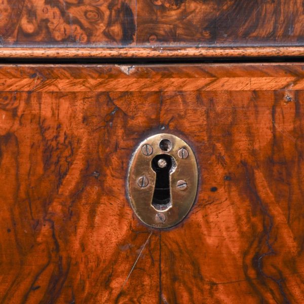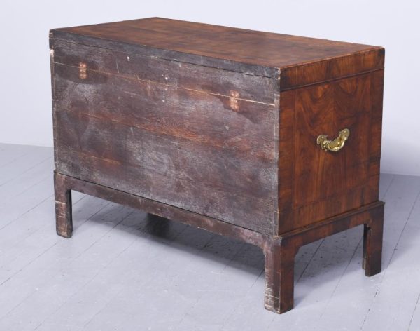 Circa 1770. An unusual stylish walnut trunk on stand. The rectangular trunk with quarter matching walnut, bordered with herringbone inlay and a broad-banding. The caddy shaped fore-edge with burr walnut panel to the front, the top is hinged and opens to reveal interior with one removable tray, and the entire carcass is made in oak. To the sides with elegant cast brass and gilded lifting handles, and veneered similar to the top, with an oval brass escutcheon with original working lock, with quarter matched burr walnut, with herringbone banding. The trunk sits on a simple base with the moulded fore edge, shaped frieze and resting on four tall walnut legs.