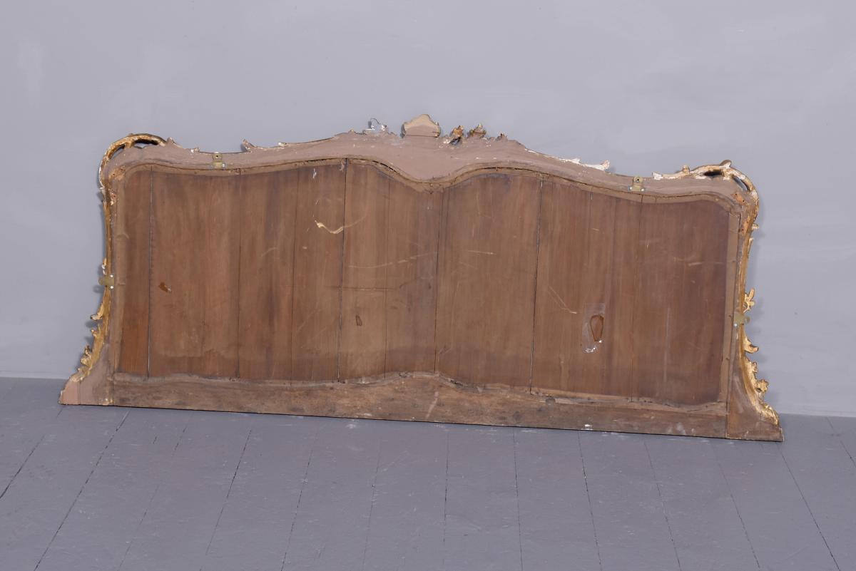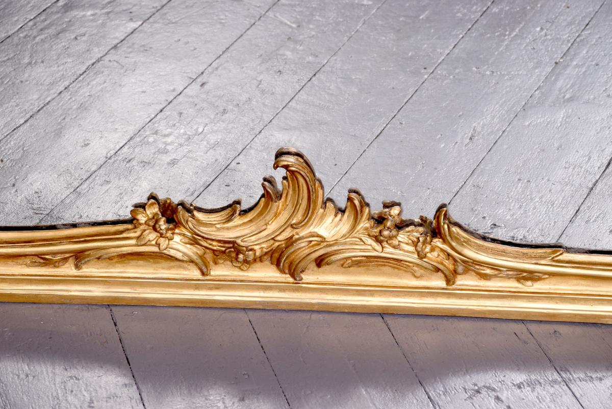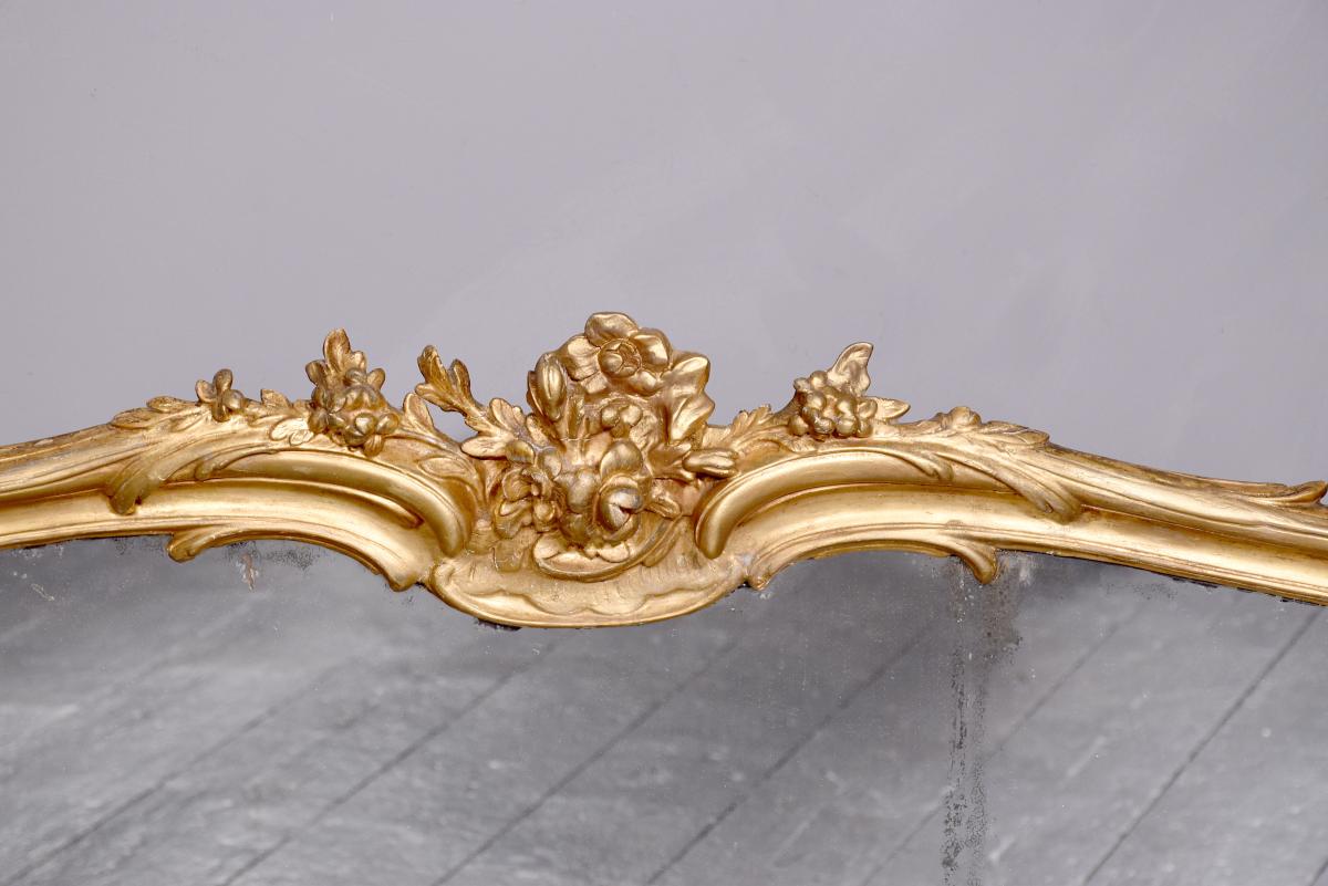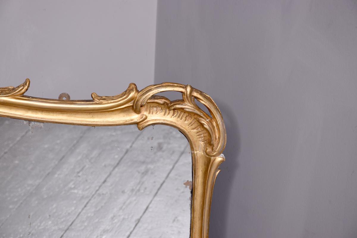 Circa 1820.   A quality George IV carved gilt wood and gesso elongated overmantel mirror, the shaped frame surmounted by a bouquet of flowers and extended foliate carving which flows over the moulded frame, with pierced corners with Rococo design which is repeated throughout, the bottom of the mirror with scrolling carved gilded gesso, punctuated by flower heads.  The elongated frame contains its original mercury plate.  All resting on a simple base.