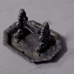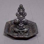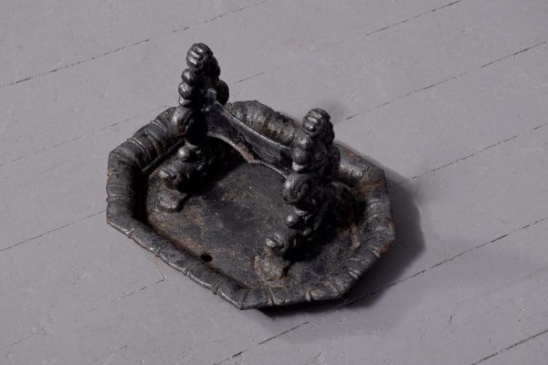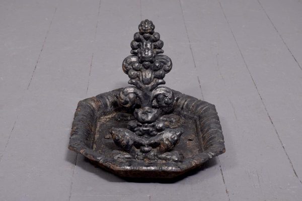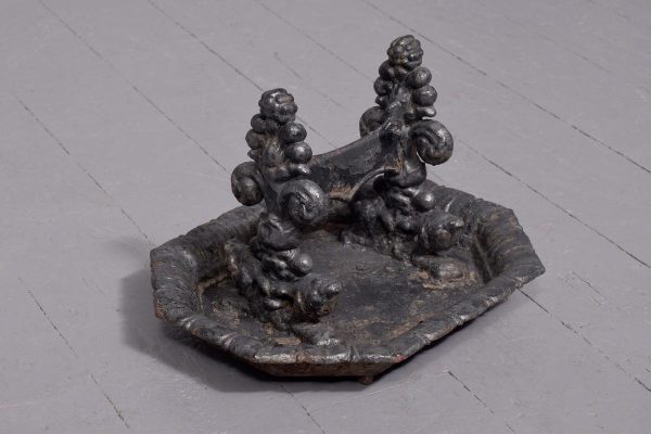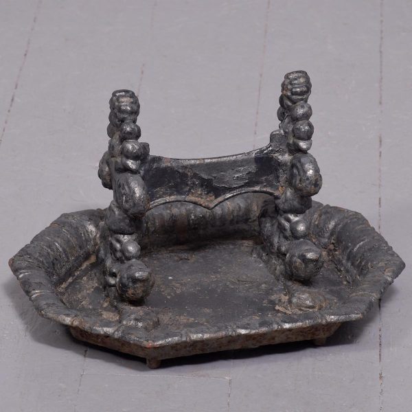 Circa 1825. Good cast iron George IV boot scraper, with its stylish cross bar supported on a pair of cast Fleur-de-lis with pierced casting towards the base which includes mythical dolphins, resting in a supportive tray with shaped foliate stylish sides within elongated hexagonal base.