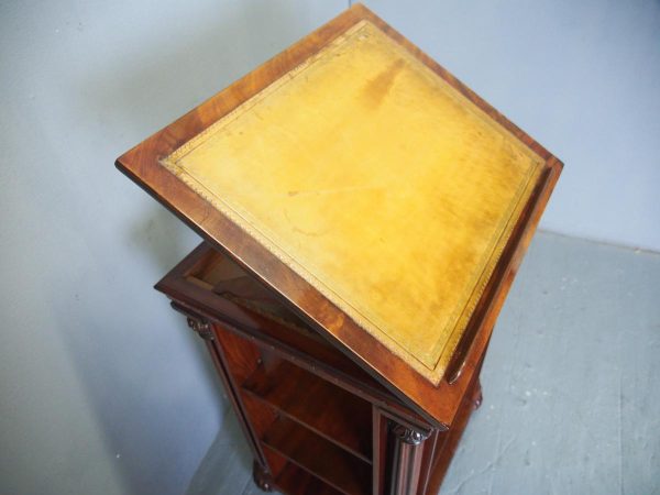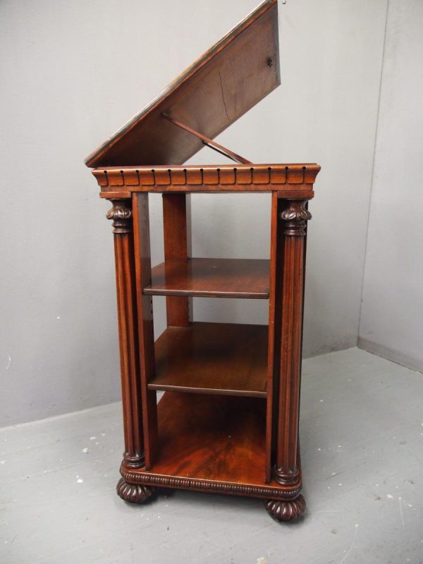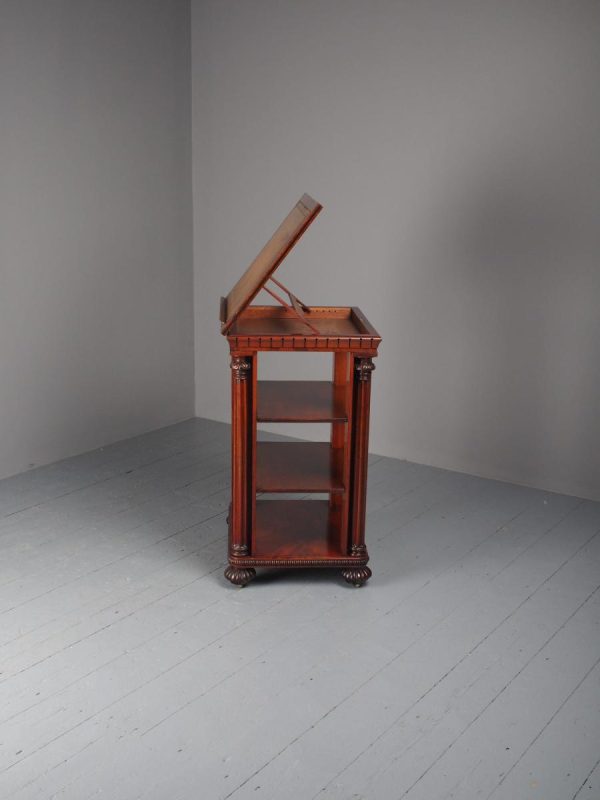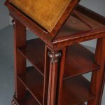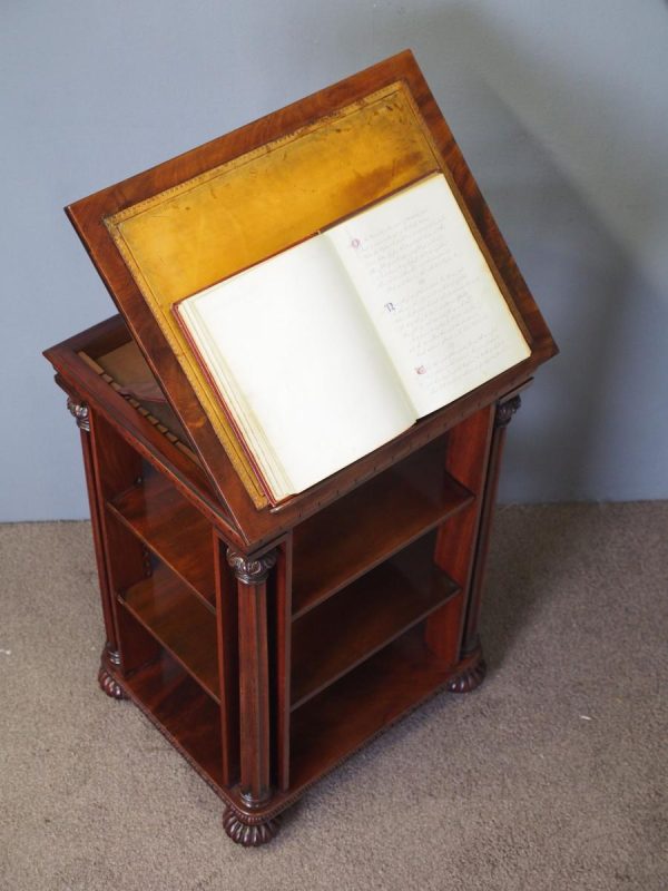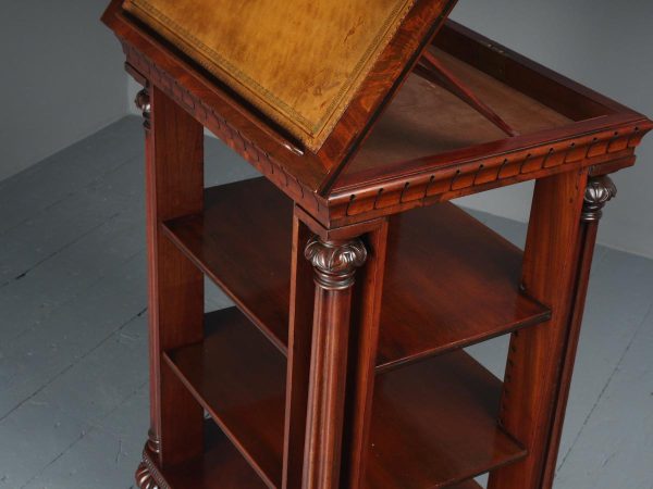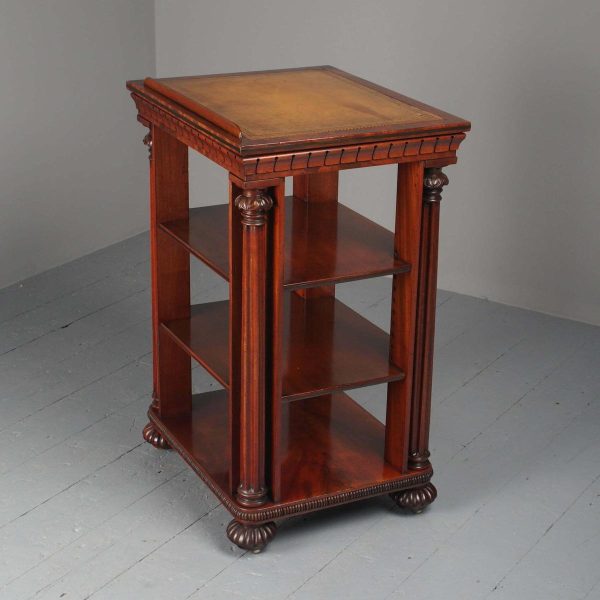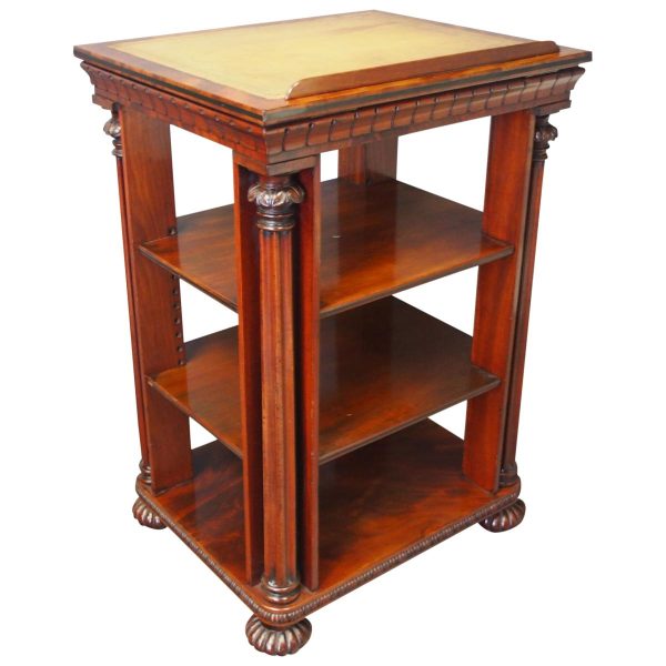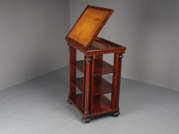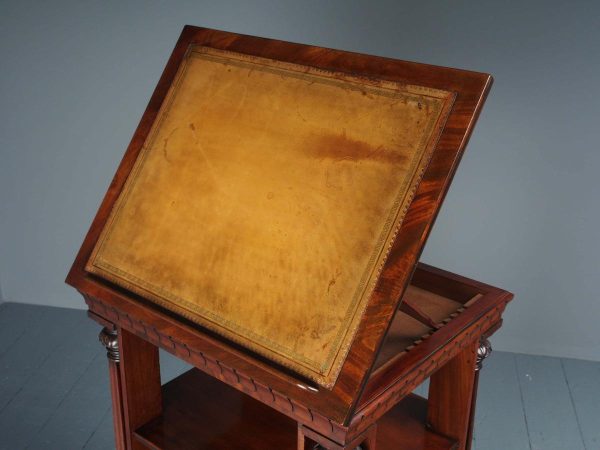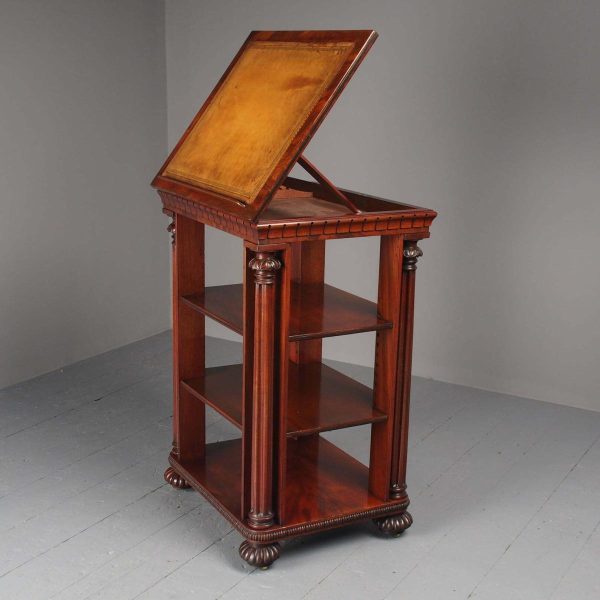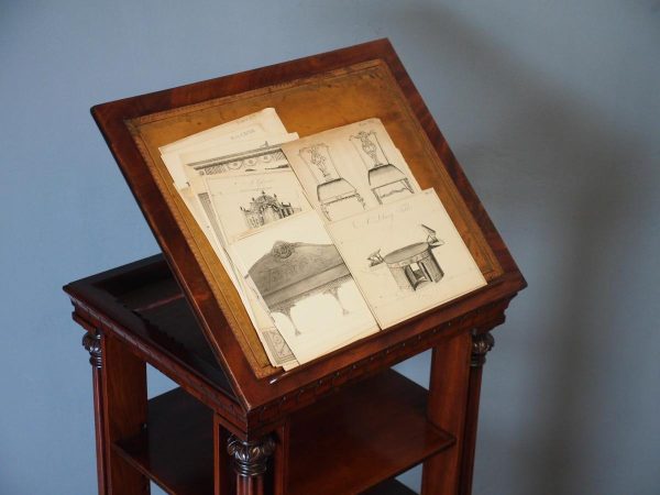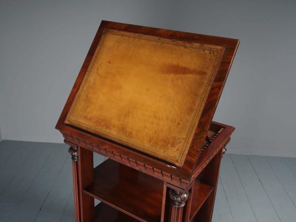Circa 1825, unusual George IV freestanding folio table or folio cabinet. With a tan leather, tooled top with a mahogany ratchet for height adjustment and it is also possible to lock it in position, with a removable book-rest which can be stored inside. With ebonised edges to the top and adjustable shelves, above two L-shaped pieces of wood with mahogany studs holding them in place. Flanked by classical columns with carved flower heads, ring turning and tapering down to a base with beaded fore-edge, on squat feet with cast brass castors. The book slide opens to 124 cm high.