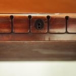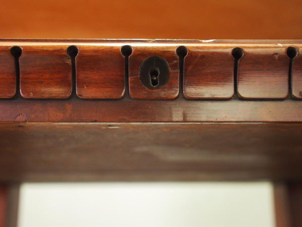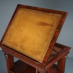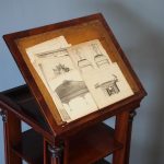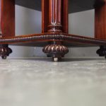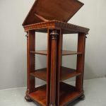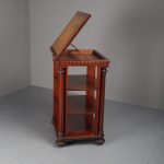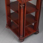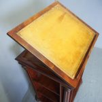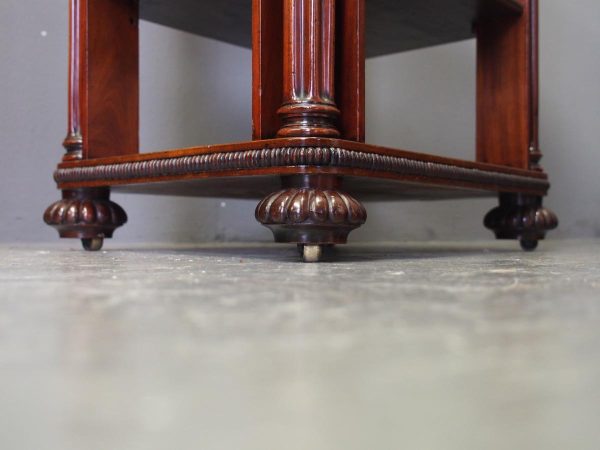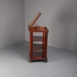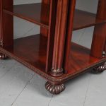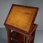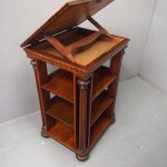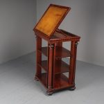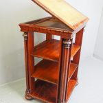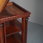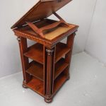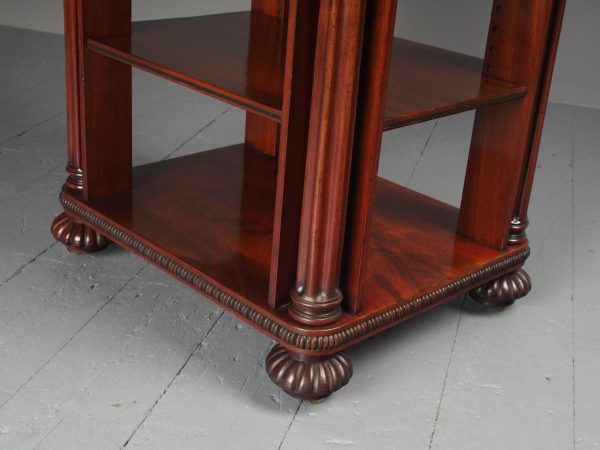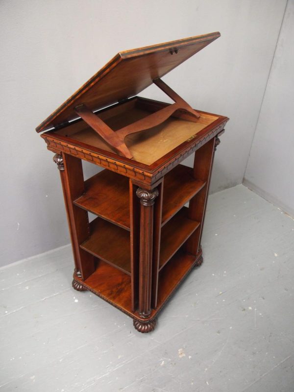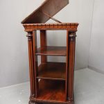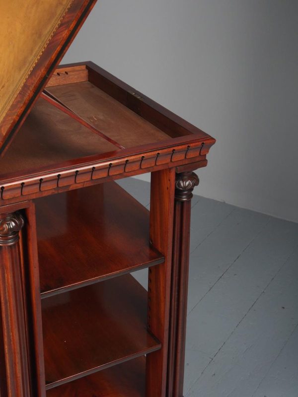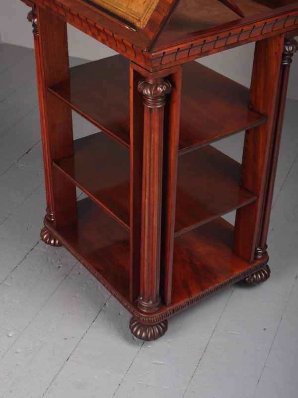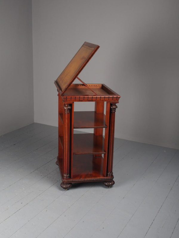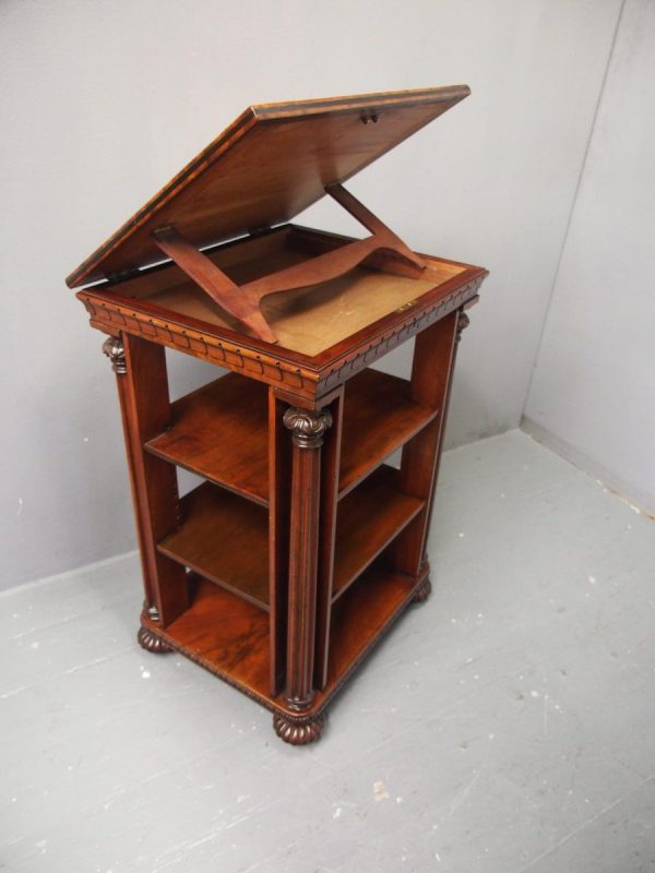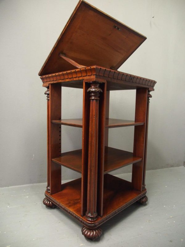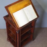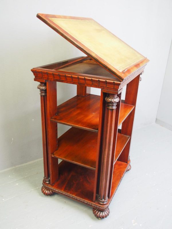 Circa 1825, unusual George IV freestanding folio table or folio cabinet. With a tan leather, tooled top with a mahogany ratchet for height adjustment and it is also possible to lock it in position, with a removable book-rest which can be stored inside. With ebonised edges to the top and adjustable shelves, above two L-shaped pieces of wood with mahogany studs holding them in place. Flanked by classical columns with carved flower heads, ring turning and tapering down to a base with beaded fore-edge, on squat feet with cast brass castors. The book slide opens to 124 cm high.