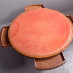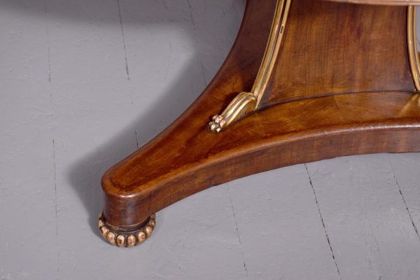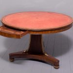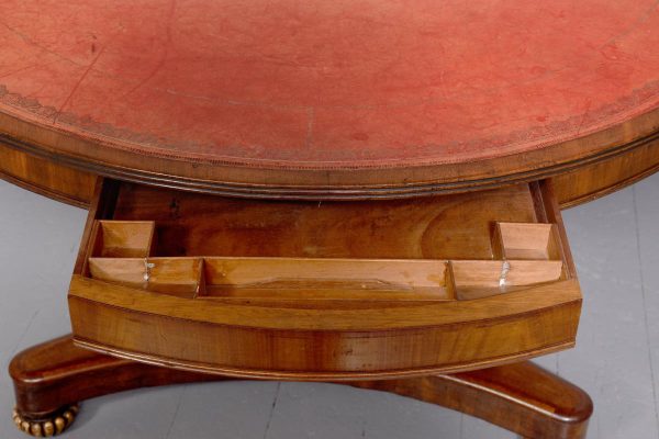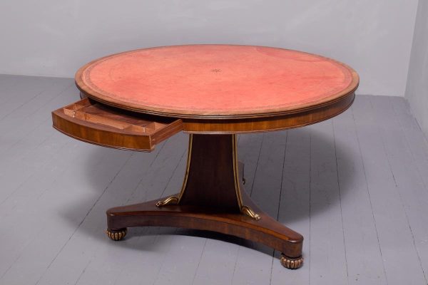 Circa 1820. A quality George IV circular mahogany drum table, the top with red leather tooled and gilded insert, with an elegant ribbed fore-edge and narrow frieze with beading to the base, this conceals the four drawers, all with mahogany liners with one fitted, the circular revolving top rests on a tapering tri-form, stem with a ribbed gilded facings finishing with gilded animal feet, resting on a tri-form platform base, supported by three tapering and fluted gilded bun feet.