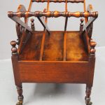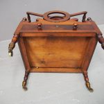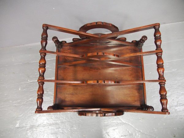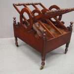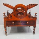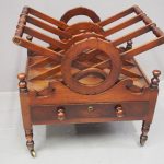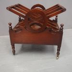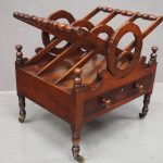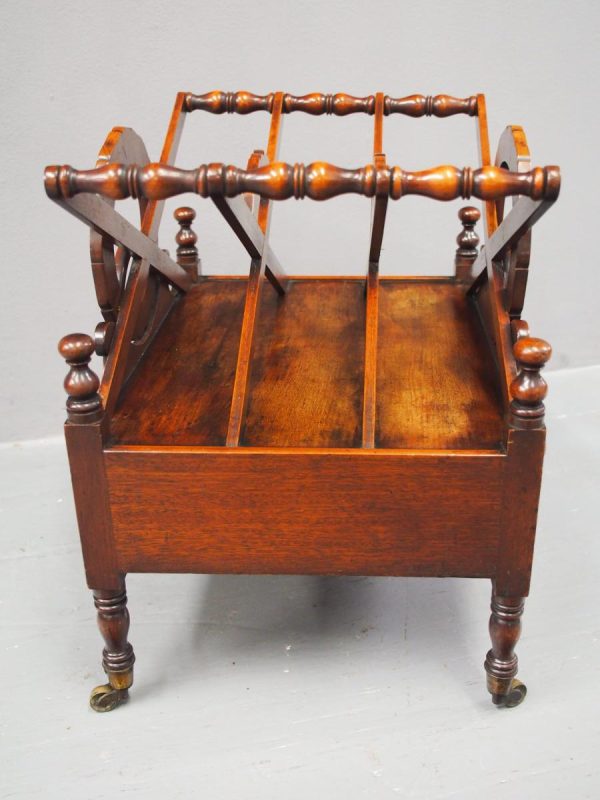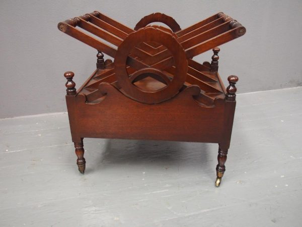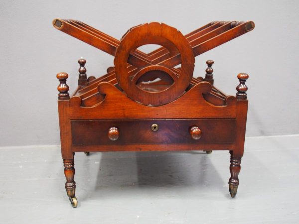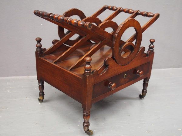 Circa 1820, George IV mahogany canterbury. With an unusual top that has 3 divisions in a cruciform shape, with turned sections between them, and a carved wreath attached to the stretchers. There are smaller versions of the wreath across it, and 4 small turned finials with a raised, shaped gallery to the front and back. Beneath is a full length drawer with quality flame mahogany veneers, a cast brass escutcheon and turned knob handles, and it stands on turned, ring turned and tapering legs on cast brass cups with brass castors.