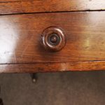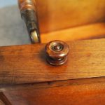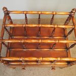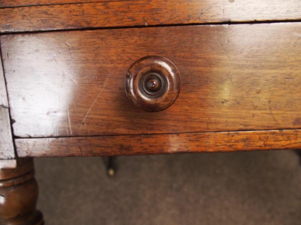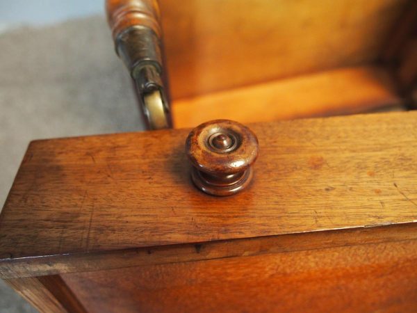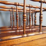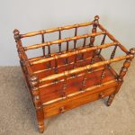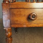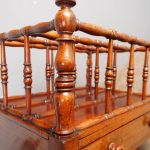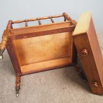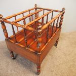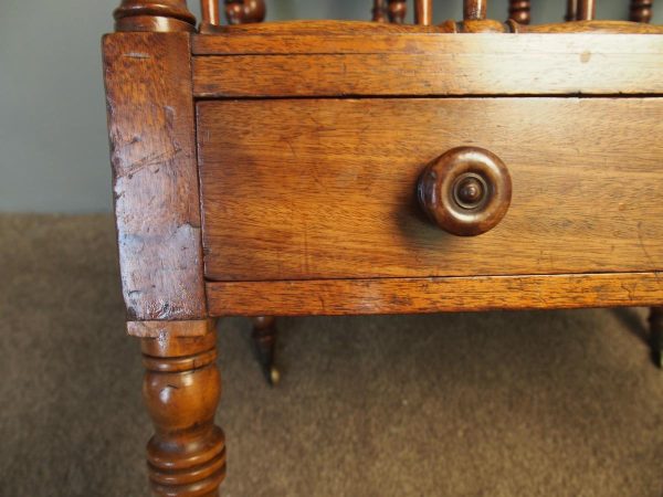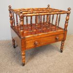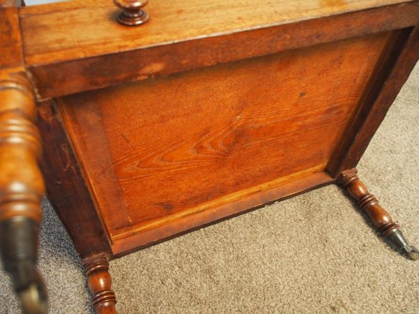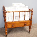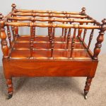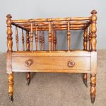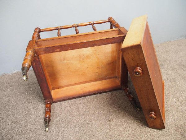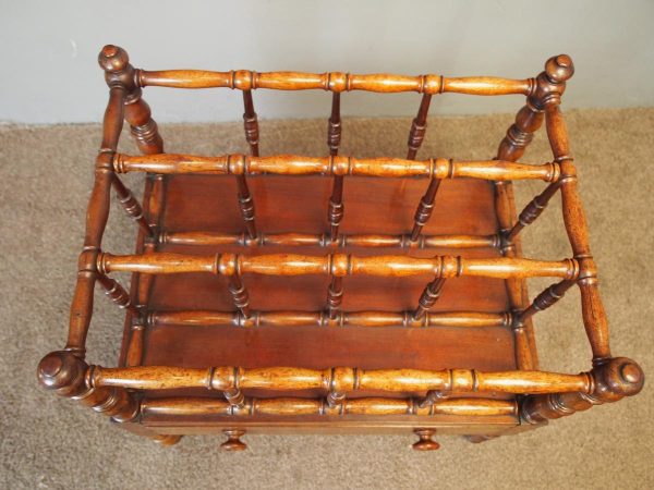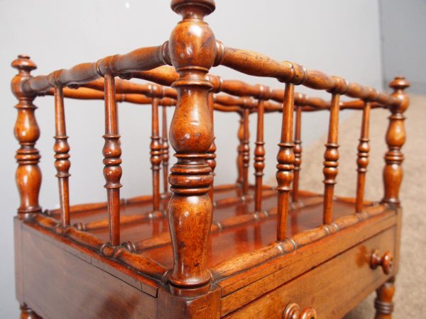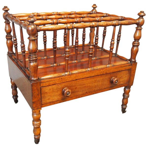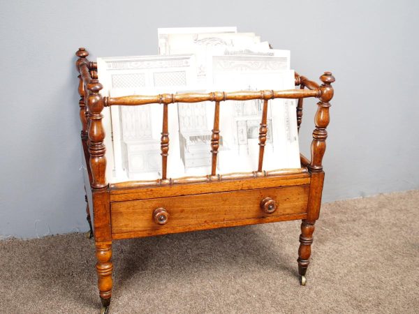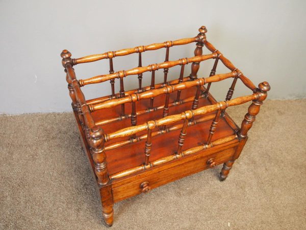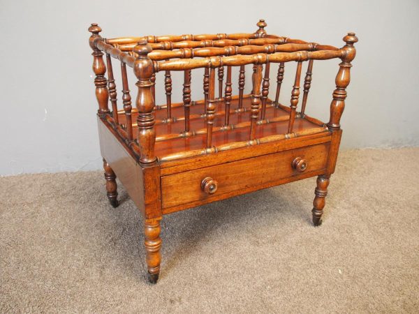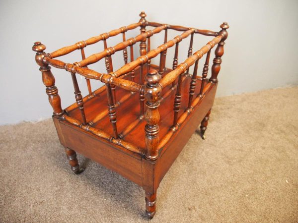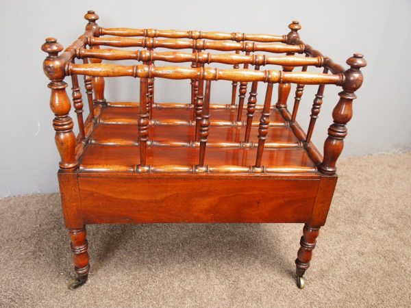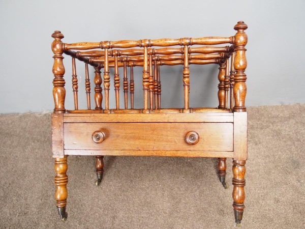 Circa 1830, late George IV mahogany three-division canterbury of traditional shape and form. The divisions separated by turned tops and spindle uprights over a full length drawer with fine carved turned handles, and on tall, turned, tapering legs on brass cups and brass castors.