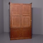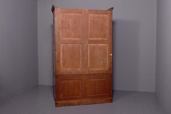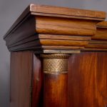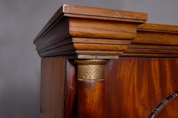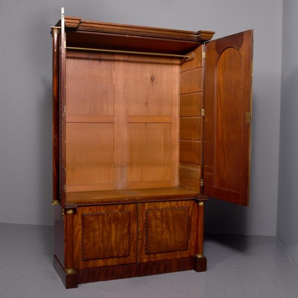 Circa 1820. A large mahogany two-part linen press, the top with elegant cornice with extensions to the ends, the front with a pair of full length doors with arched proud panels with egg and dart beading and a stylish brass beading between the doors, which open to reveal an uninterrupted interior with a brass rail on the top, the doors are flanked by a pair of circular columns with incised brass capitals and bases, the base section which follows the form of the top with two smaller doors with similar beading, inside one removable or adjustable shelf, the doors are also flanked by a pair of turned columns, all resting on an enclosed plinth which follows the form of the columns and doors.