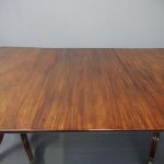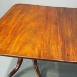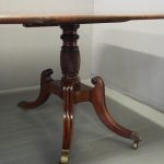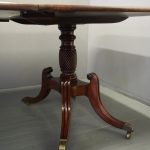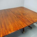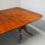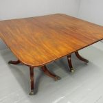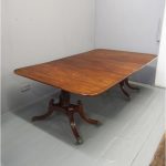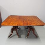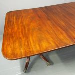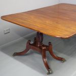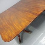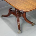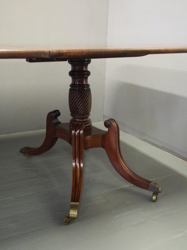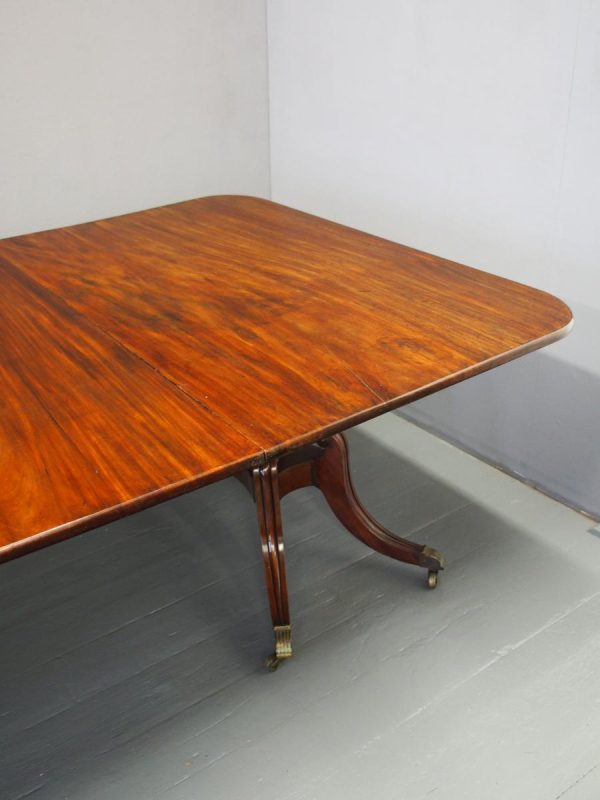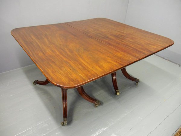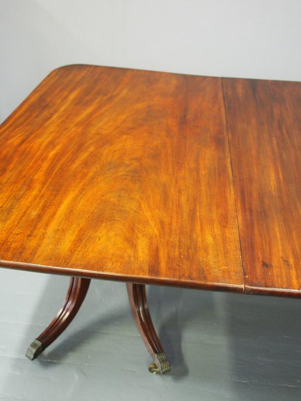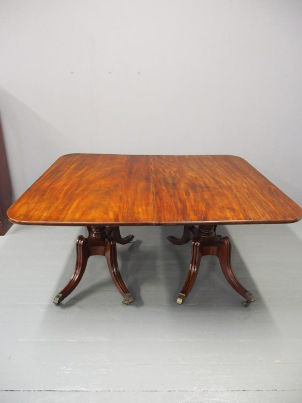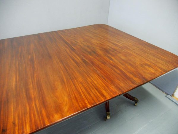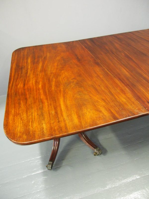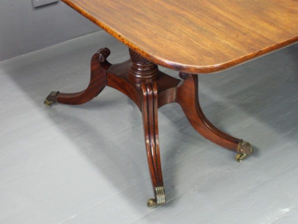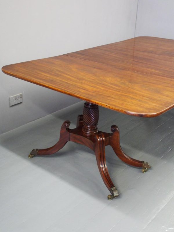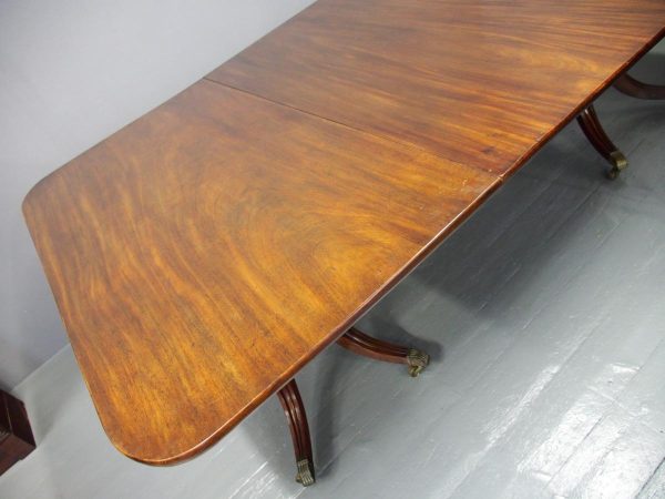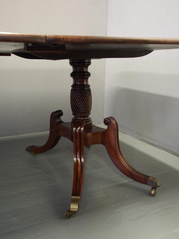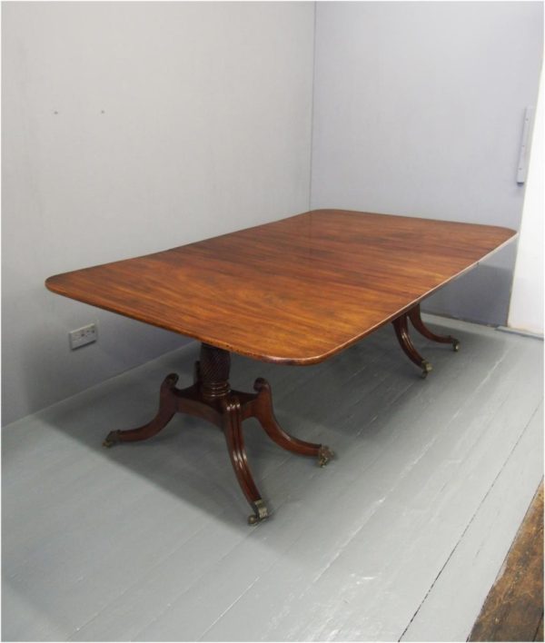 Circa 1820, George IV mahogany twin pillar dining table with 1 extra leaf. The rectangular shaped tops and rounded corners with a simple moulded fore-edge. Each side of the top sits on a block with a ring turned and twisted column which is carved and fluted above further ring turns. They stand on a platform base with 4 hipped sabre cabriole legs with C scrolls to the top and carved roundels, brass inlay and finishing on a cast brass foot. The extra leaf is held in place by 4 brass clips.
