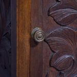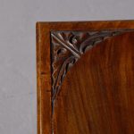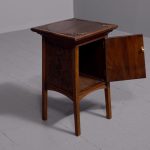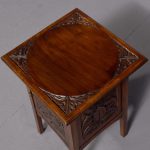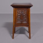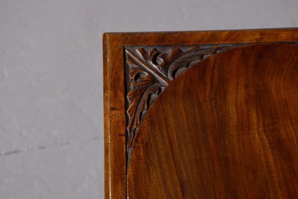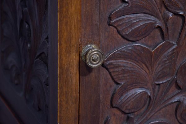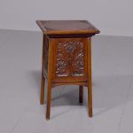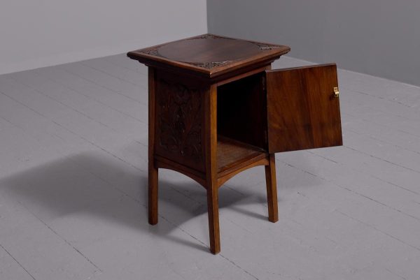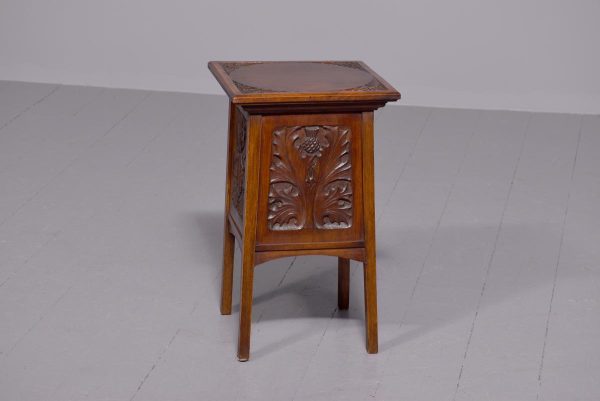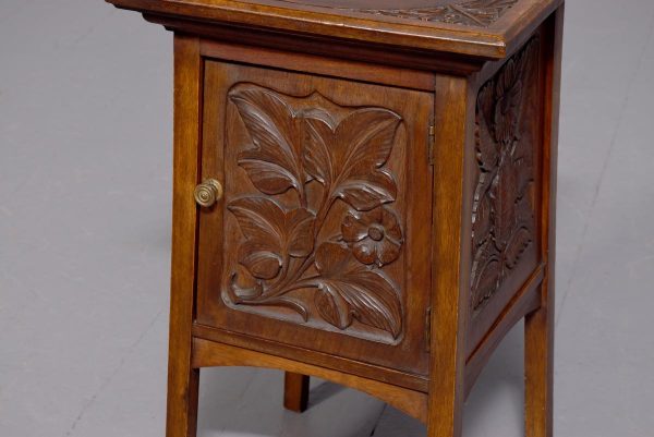Circa 1890. Arts and Crafts neat-size, mahogany carved side table with cupboard. The rectangular top In fine figured Spanish mahogany with foliate carved margins, and a moulded rim above a finely foliate-carved single door with flowers and a brass handle, opening to cupboards. The sides and back carved with different flowers including thistles (Scottish made?). All supported on tapering square legs.