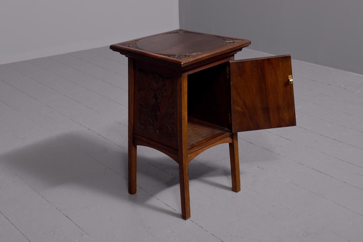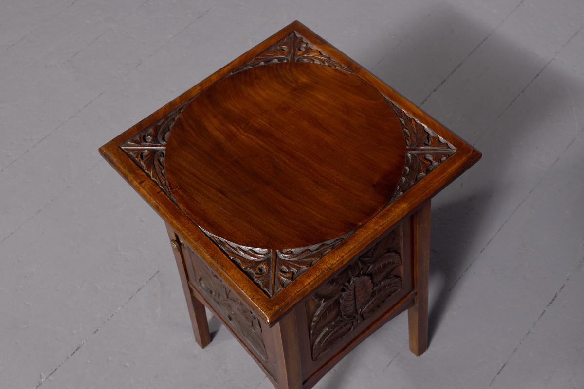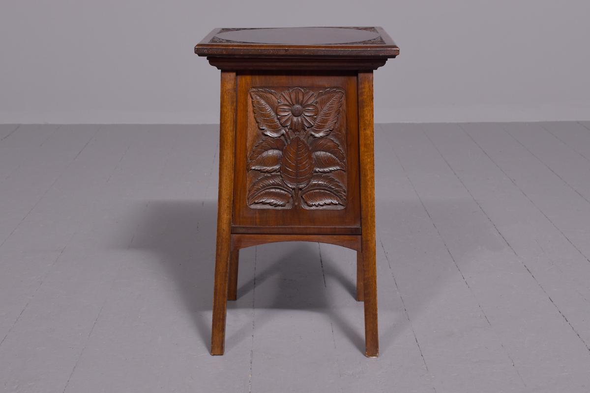 Circa 1890. Arts and Crafts neat-size, mahogany carved side table with cupboard. The rectangular top In fine figured Spanish mahogany with foliate carved margins, and a moulded rim above a finely foliate-carved single door with flowers and a brass handle, opening to cupboards. The sides and back carved with different flowers including thistles (Scottish made?). All supported on tapering square legs.