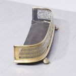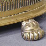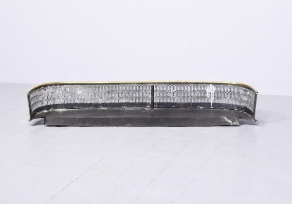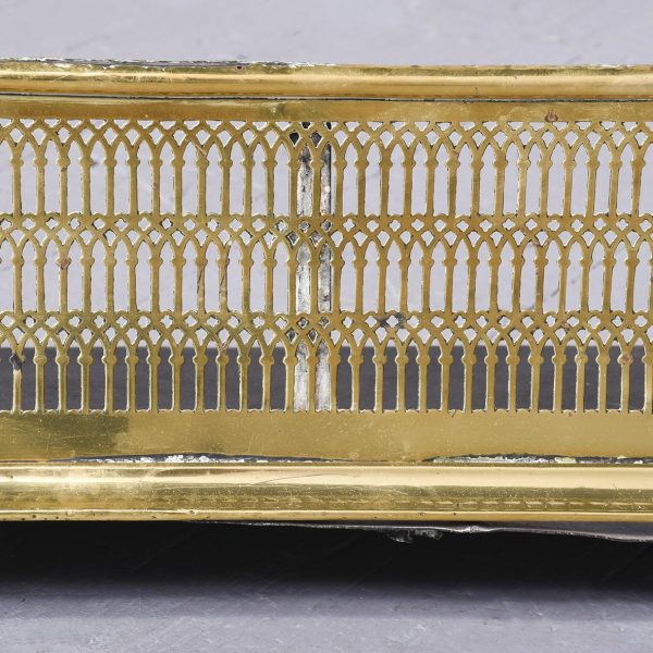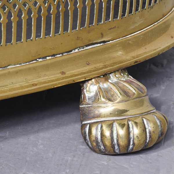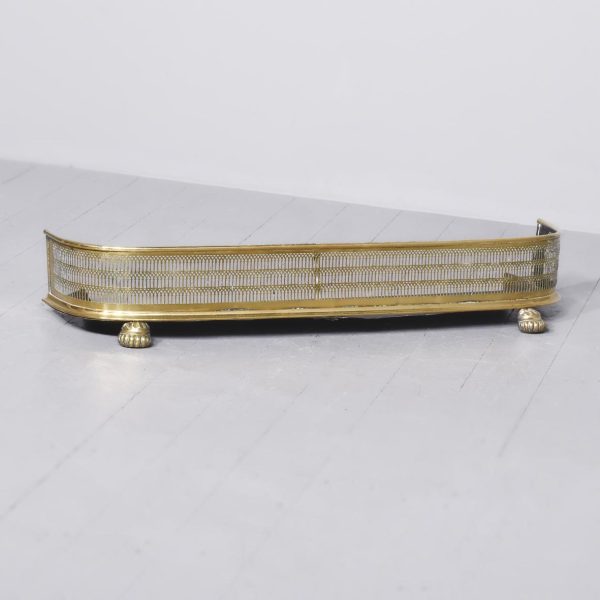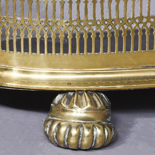 Circa 1820. A good George IV curved pierced brass fender. The top finished with a circular brass edge, beneath three tiers of pierced gothic arches which form a wonderful pattern, beneath this there is a moulding that runs around the shaped fender, all resting on a pair of stylized feet to the front.